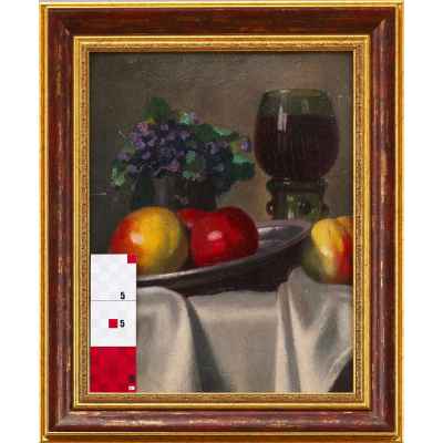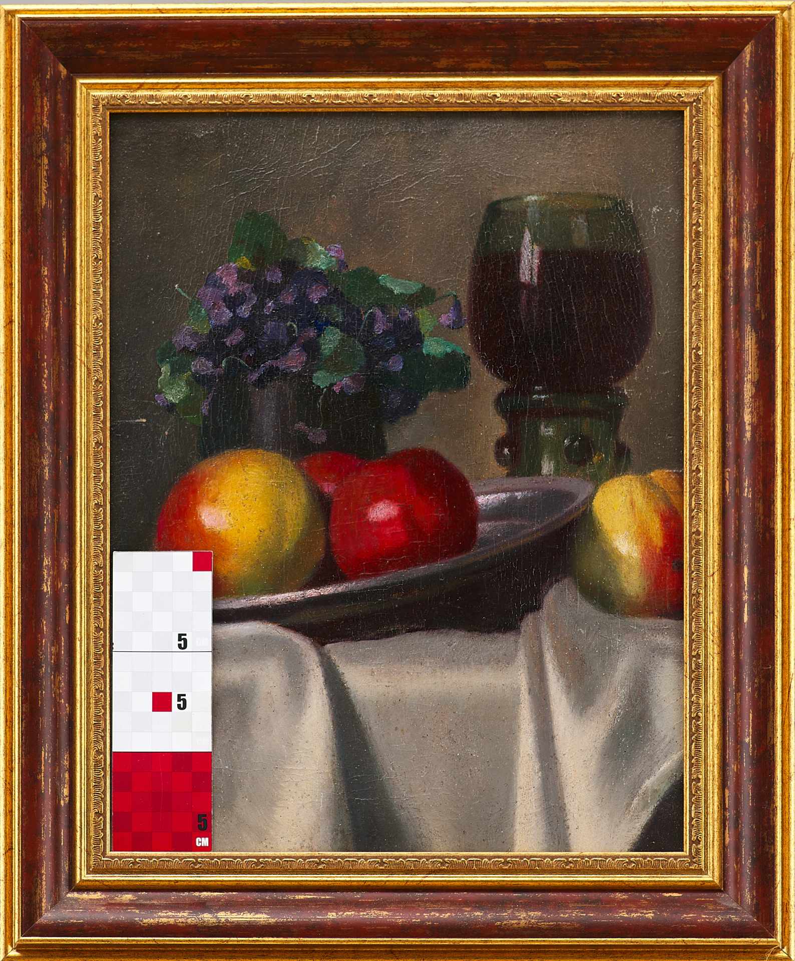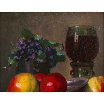 На столе, накрытом белой скатертью, изображены крупные красно-желтые яблоки на тарелке и одно на столе, подпирающее тарелку. За тарелкой стоит бокал из темно-зеленого стекла, наполненный красным вином. Рядом с бокалом в невысокой темной вазочке букетик фиалок. Фон картины серый. Слева внизу авторская подпись: