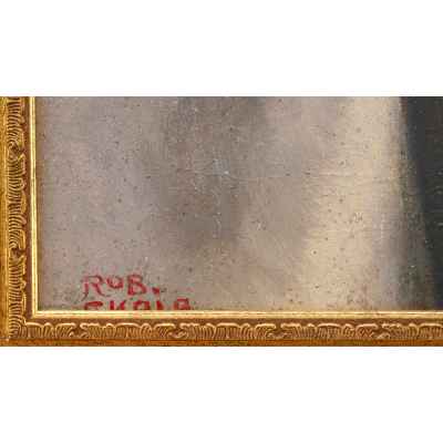 На обороте картины надпись карандашом: “800.000 крон Rob. Skala”. Авторская подпись полностью соотносится с красочным слоем произведения, что дает возможность считать ее подлинной. Подлинность работы не вызывает сомнений. Работа выполнена на профессиональном уровне и представляет интерес для частных собраний.