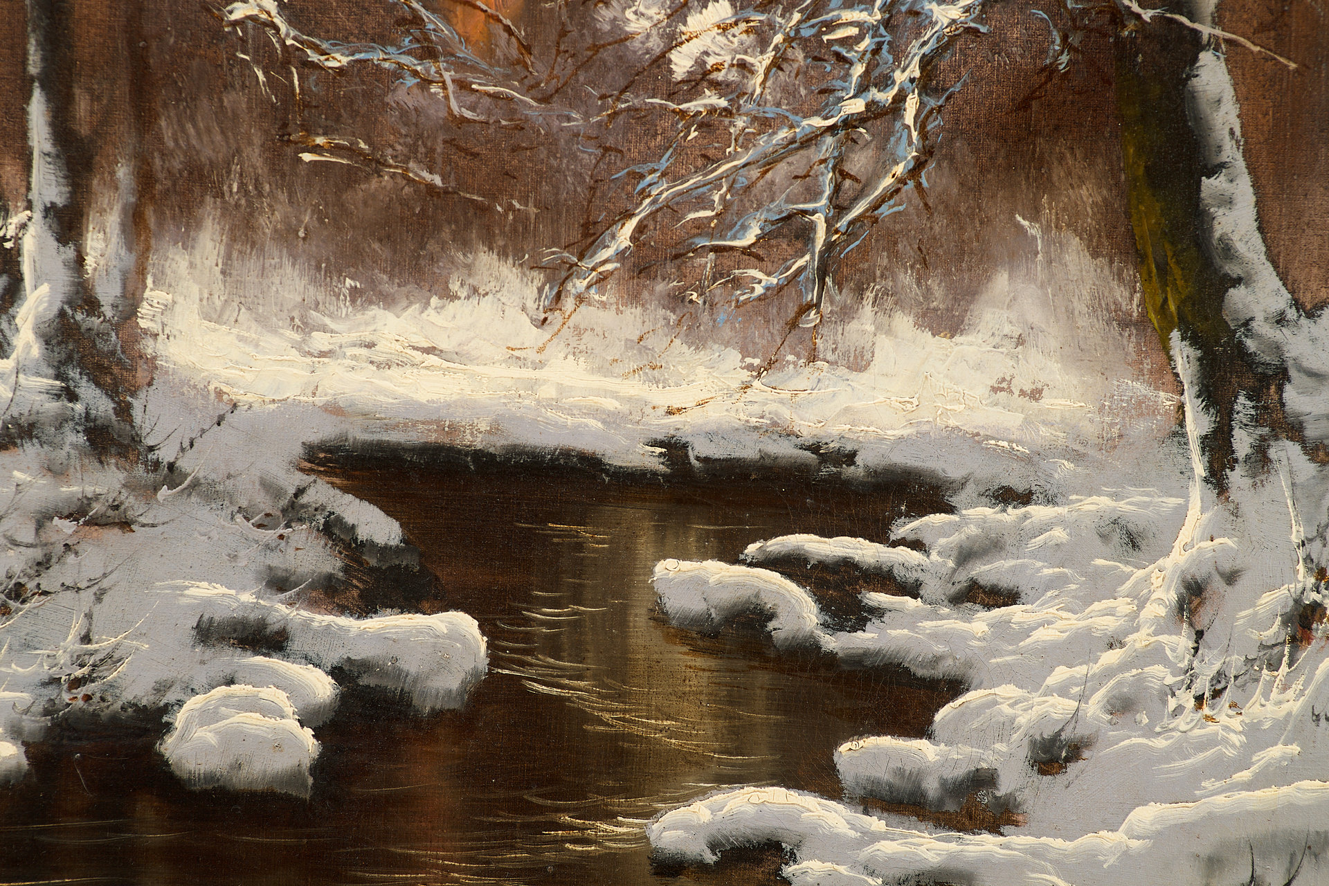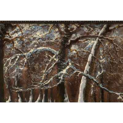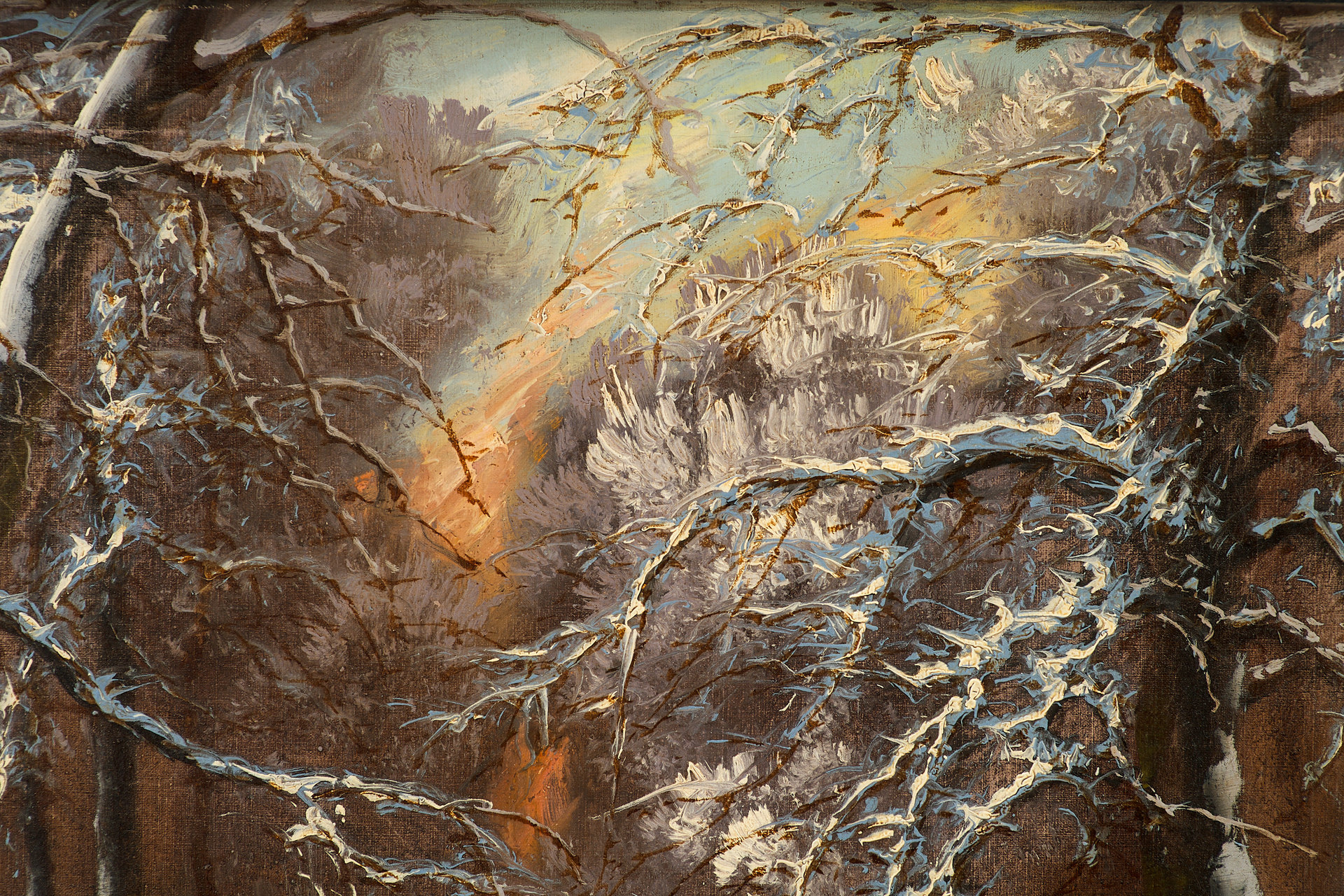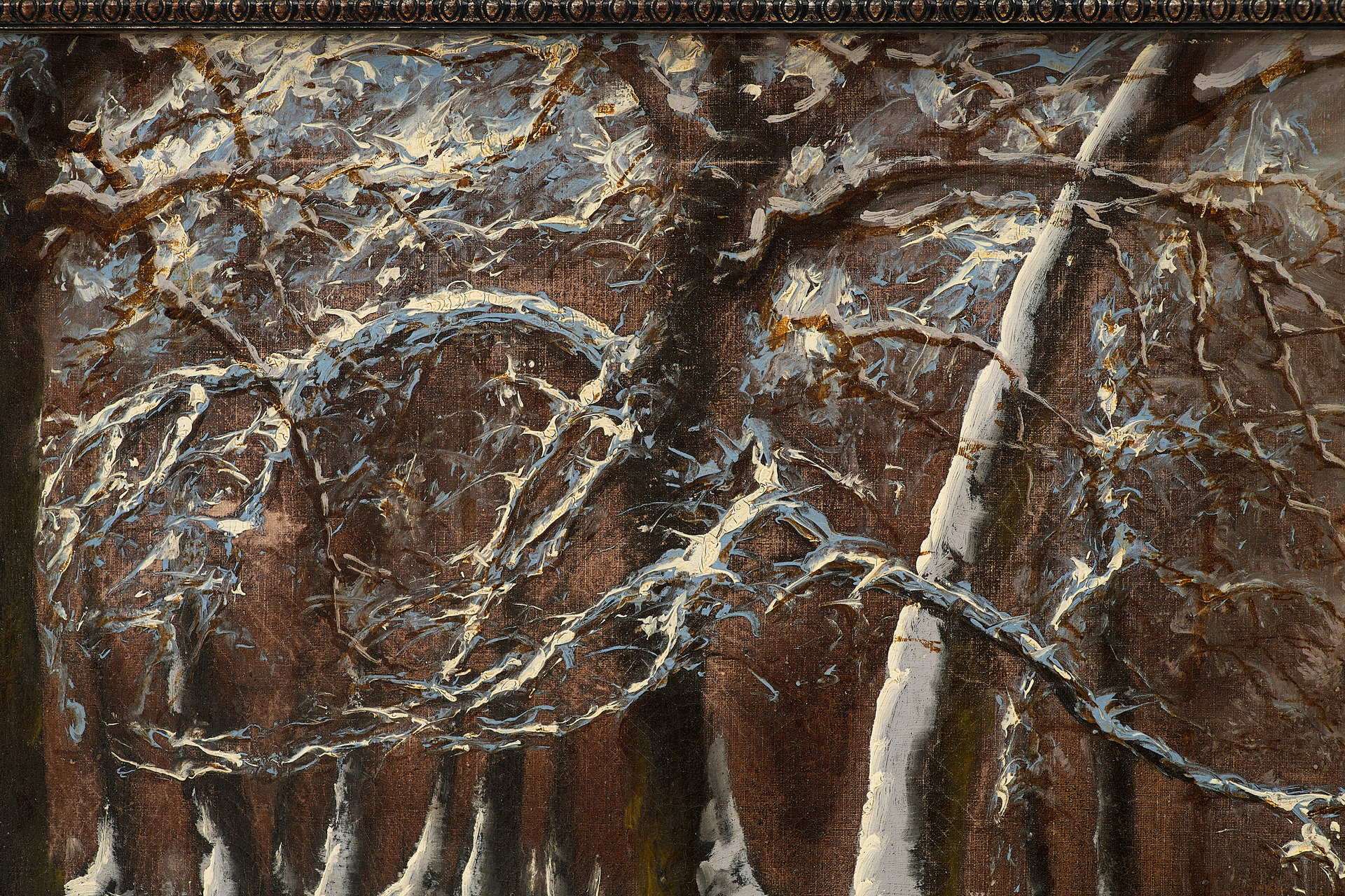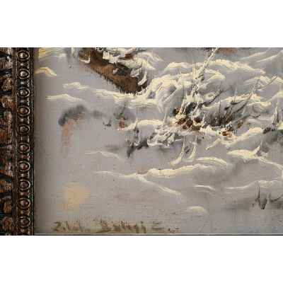 Работа выполнена около 1930-х годов и приписывается художнику из мастерской Ласло Неогради — венгерского живописца, специализировавшегося на натуралистических пейзажах. На картине имеется старая авторская подпись в нижнем левом углу, частично читаемая («Z...»), но не вызывающая сомнений в подлинности. Композиционные решения и палитра явно соотносятся с характерными приёмами Ласло Неогради (1896–1962), чья школа отличалась мастерской работой со светом и текстурами, а также глубоким вниманием к зимним мотивам природы.
