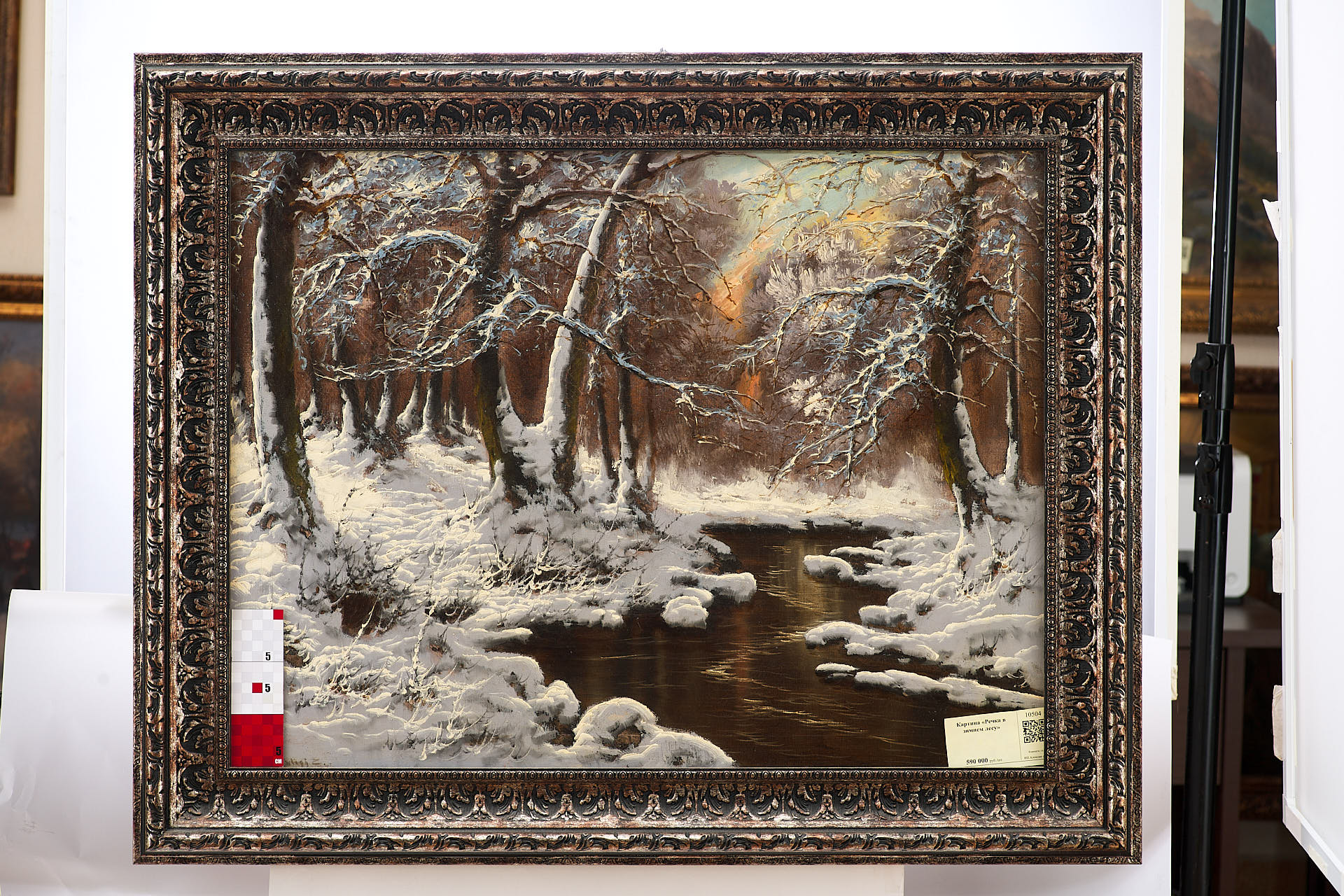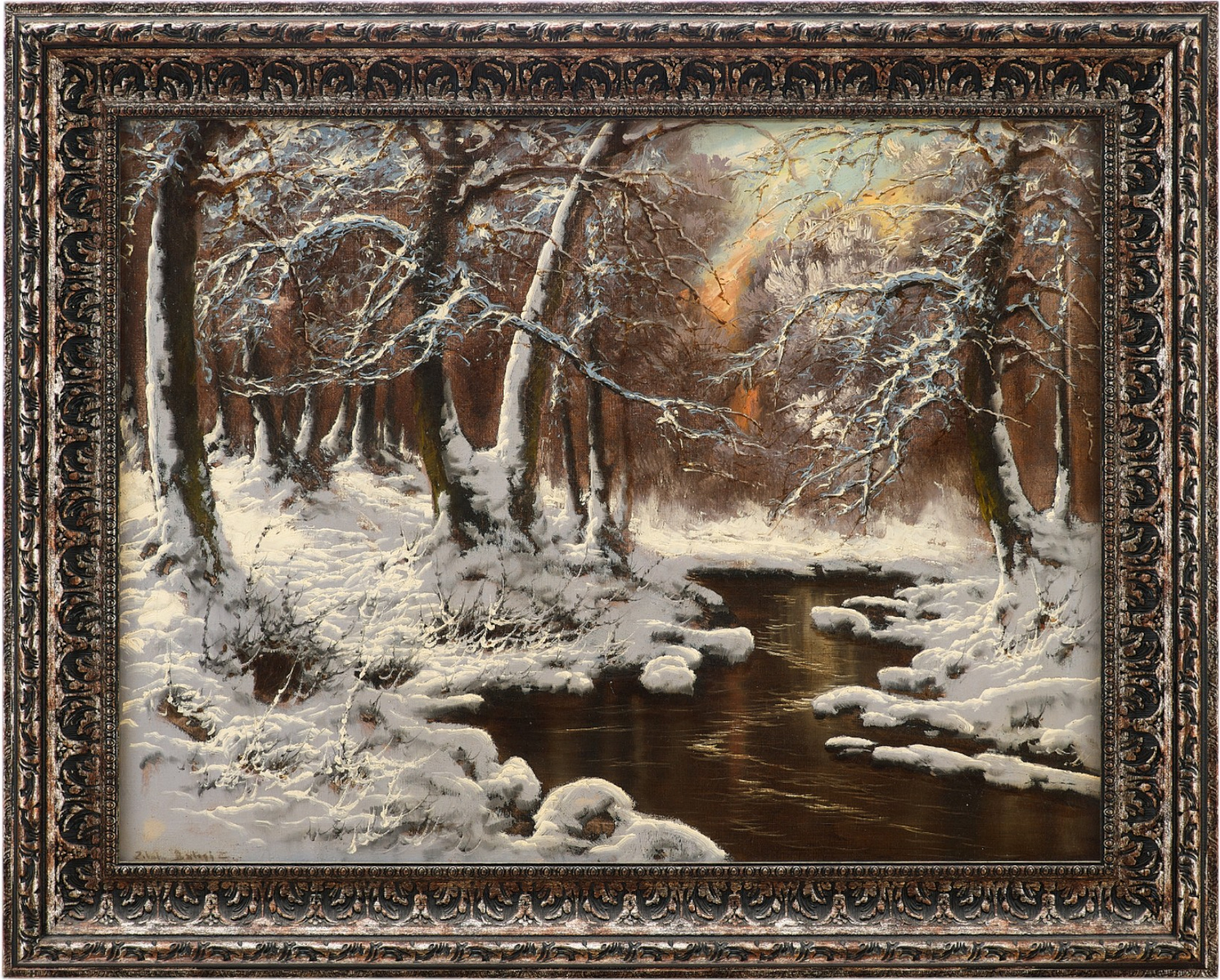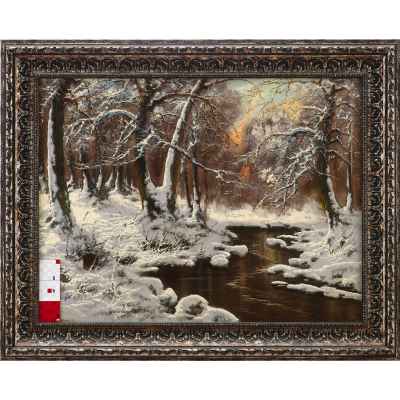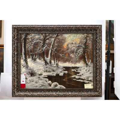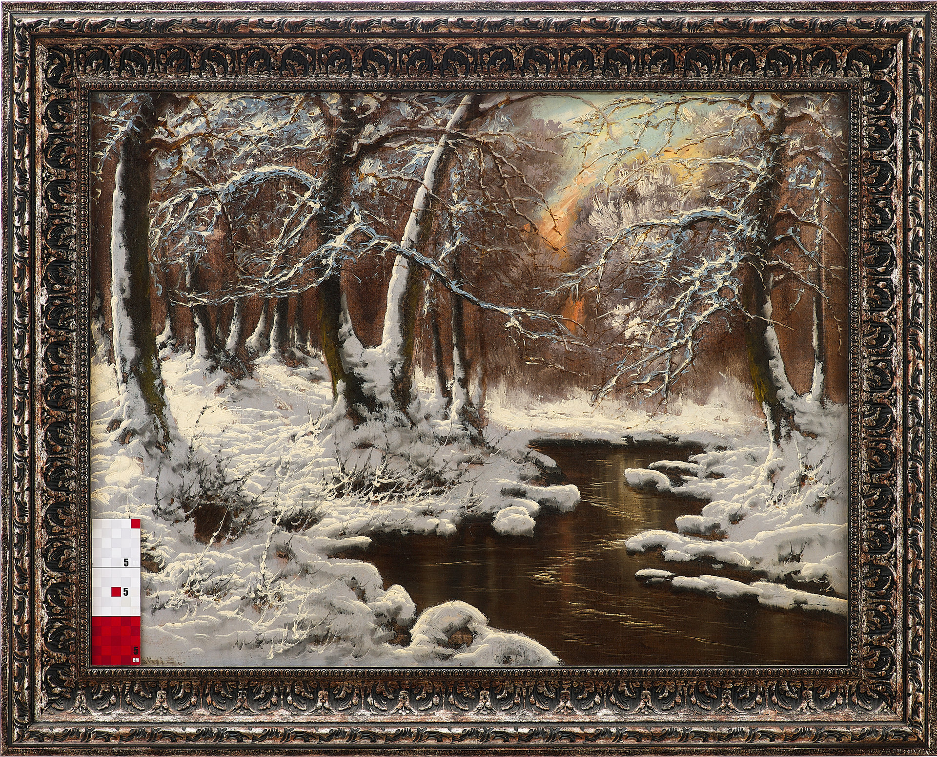 Работа выполнена около 1930-х годов и приписывается художнику из мастерской Ласло Неогради — венгерского живописца, специализировавшегося на натуралистических пейзажах. На картине имеется старая авторская подпись в нижнем левом углу, частично читаемая («Z...»), но не вызывающая сомнений в подлинности. Композиционные решения и палитра явно соотносятся с характерными приёмами Ласло Неогради (1896–1962), чья школа отличалась мастерской работой со светом и текстурами, а также глубоким вниманием к зимним мотивам природы.