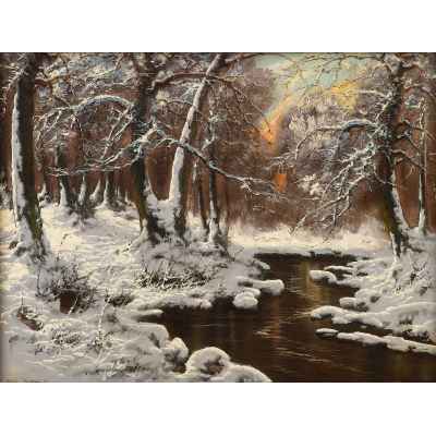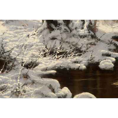 На картине изображён зимний лесной пейзаж: сквозь заснеженные деревья и густо укрытую снегом подлесную траву течёт узкая речка. Вода, не замёрзшая несмотря на зиму, отражает свет утреннего или вечернего неба. Светлая дымка и мягкое золотистое освещение на горизонте придают сцене ощущение глубины и покоя. Заснеженные ветви деревьев изображены с высокой точностью и текстурностью, создавая эффект почти трёхмерного пространства.