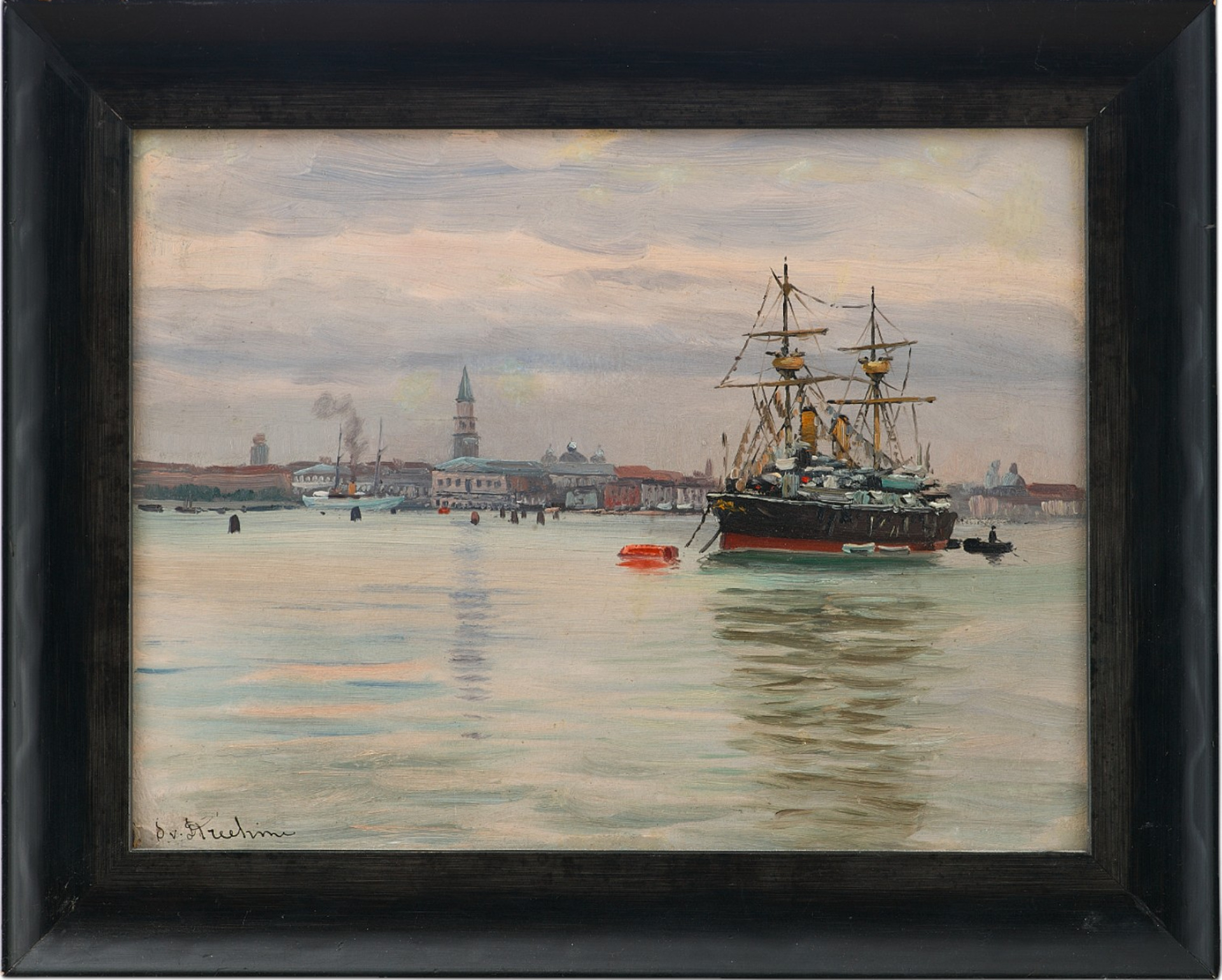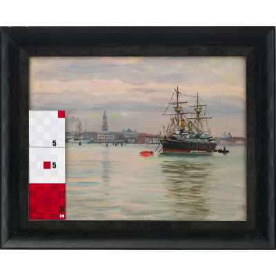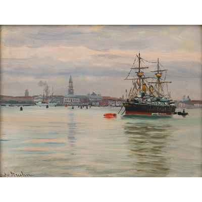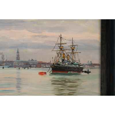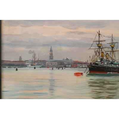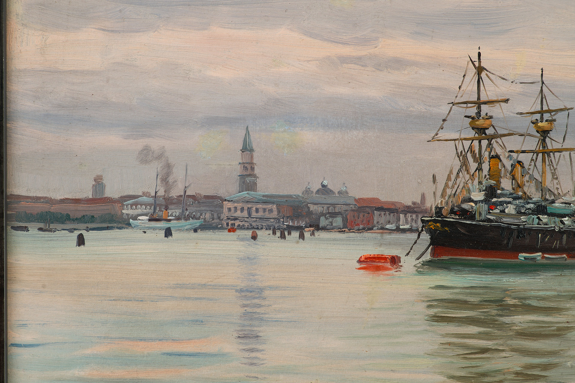 На картине изображён пароход, пришвартованный у побережья на фоне архитектурного пейзажа Венеции. На переднем плане — массивное судно с парусным и паровым оснащением, снабжённое шлюпками и техническими элементами. Вдали — характерная силуэтная линия венецианских зданий и колоколен, включая собор Сан-Джорджо Маджоре. Атмосфера спокойная, с размытым, пасмурным небом и зеркальной гладью воды, отражающей небесные и архитектурные тона.