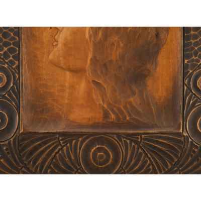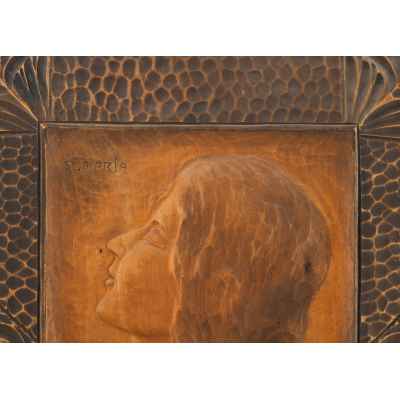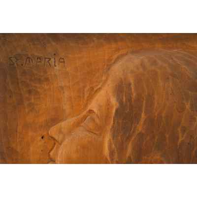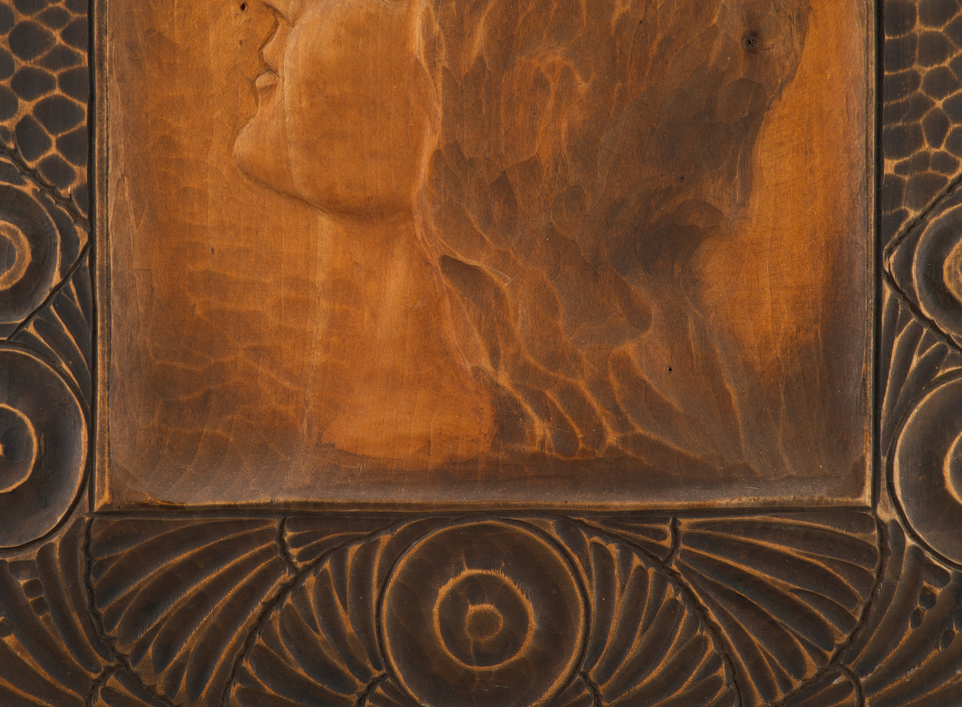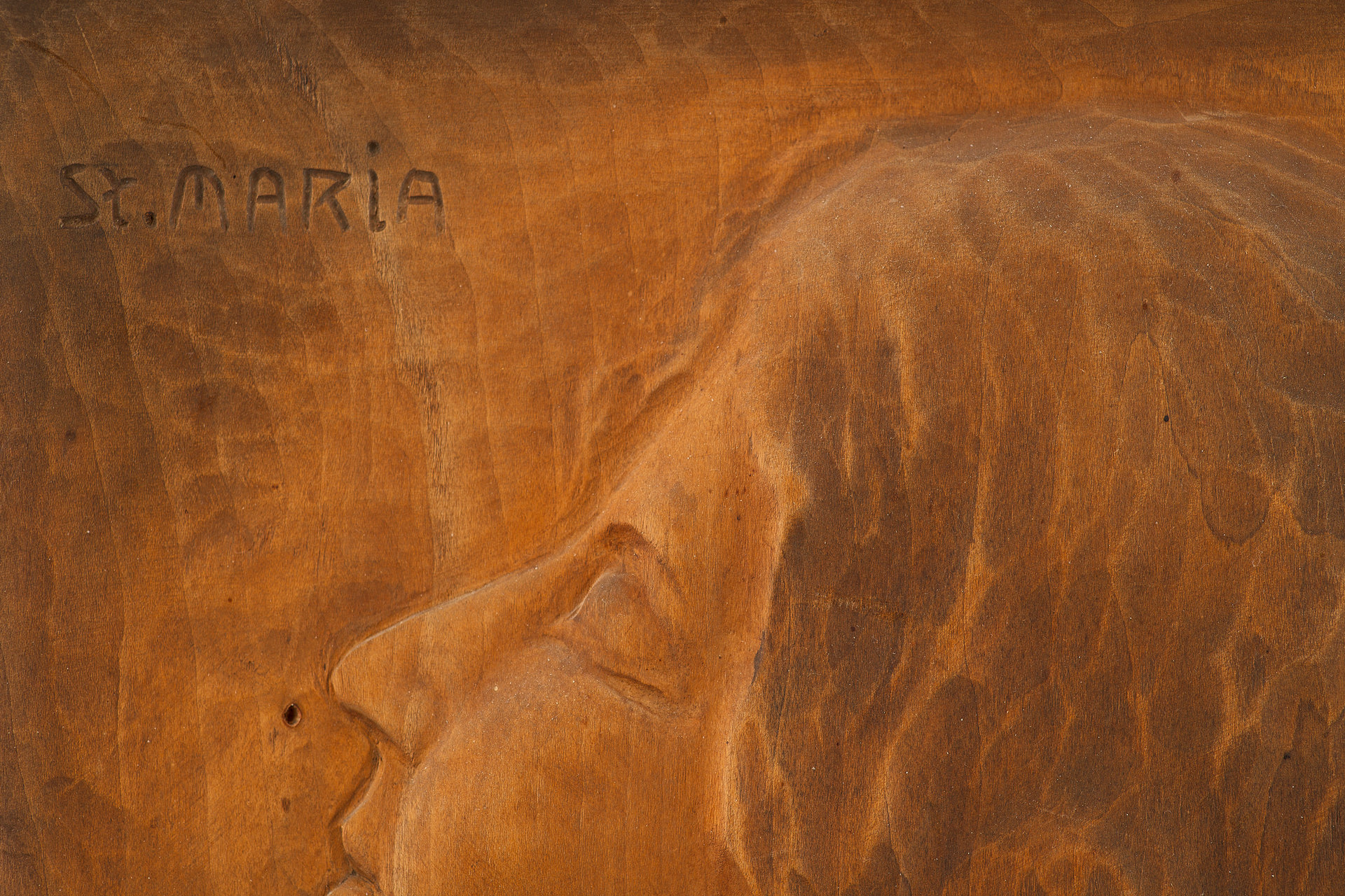 На резном деревянном панно изображён профиль молодой женщины с обращённым к небу взглядом — иконографический образ Богородицы Девы Марии, сопровождаемый надписью St. Maria в левом верхнем углу. Работа выполнена в технике горельефа по дереву, что позволяет мягко моделировать черты лица и волосы, придавая изображению одухотворённость. Вокруг центрального образа — декоративная рамка с выразительным геометрическим орнаментом, напоминающим народные мотивы, стилизованные под эстетику ар-нуво.