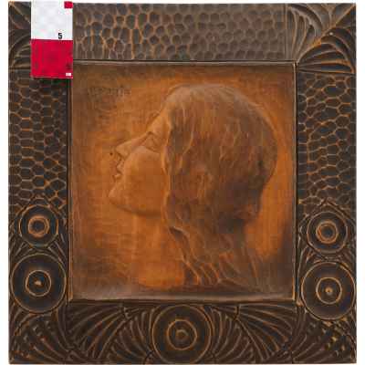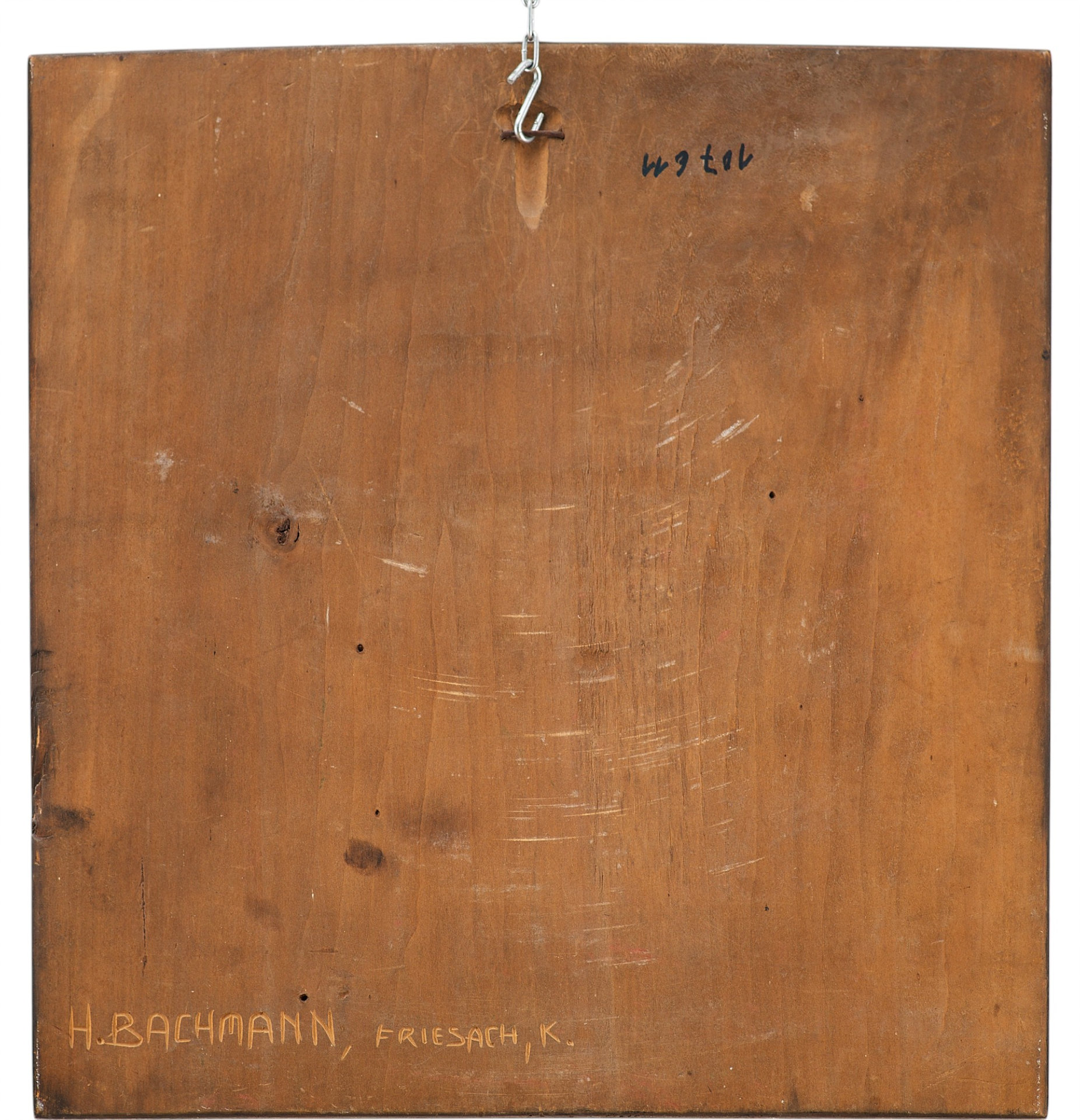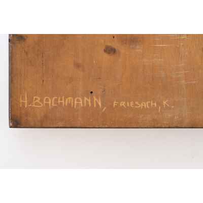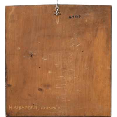 Работа подписана автором — Н. Bachmann, K. Friesach, что указывает на её происхождение из германоязычного культурного круга, где ар-нуво получил особое развитие в прикладных искусствах. В этом контексте религиозные образы, такие как Дева Мария, часто переосмыслялись сквозь призму эстетизма и декоративности, становясь частью не только церковного, но и частного интерьерного убранства.