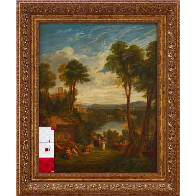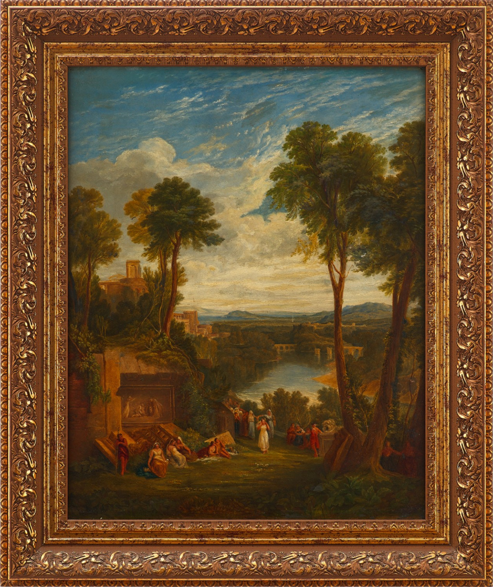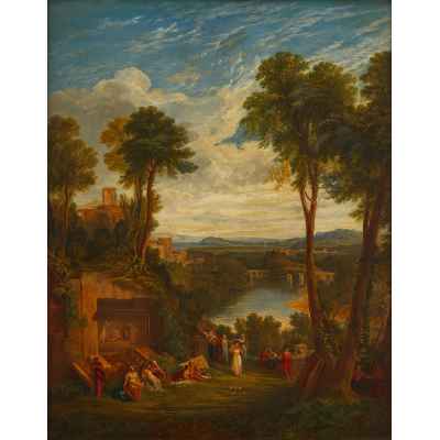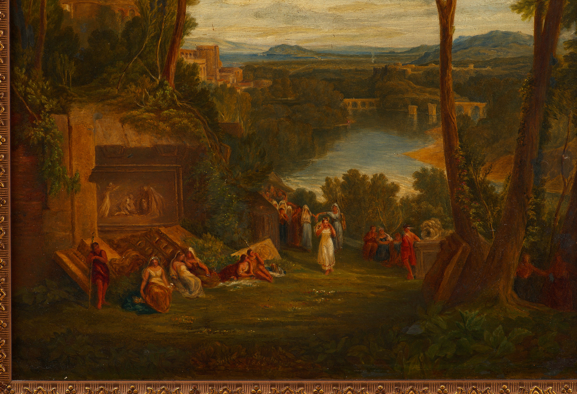 На картине изображён живописный пейзаж, погружённый в атмосферу идиллической античности: на переднем плане возвышаются стройные деревья, окружённые античными руинами и собранием людей, напоминающим жанровую сцену с участием в ритуальной процессии. Архитектурные элементы классического типа, фигуры в тогах и культовое оформление фона подчёркивают связь композиции с идеализированным образом древнего мира. За группой персонажей раскрывается панорама реки, пересекаемой каменным мостом, уходящей в сторону далеких холмов и освещённого неба. Такая постановка сцены создаёт глубину и уравновешенность, характерные для живописи классицизма.