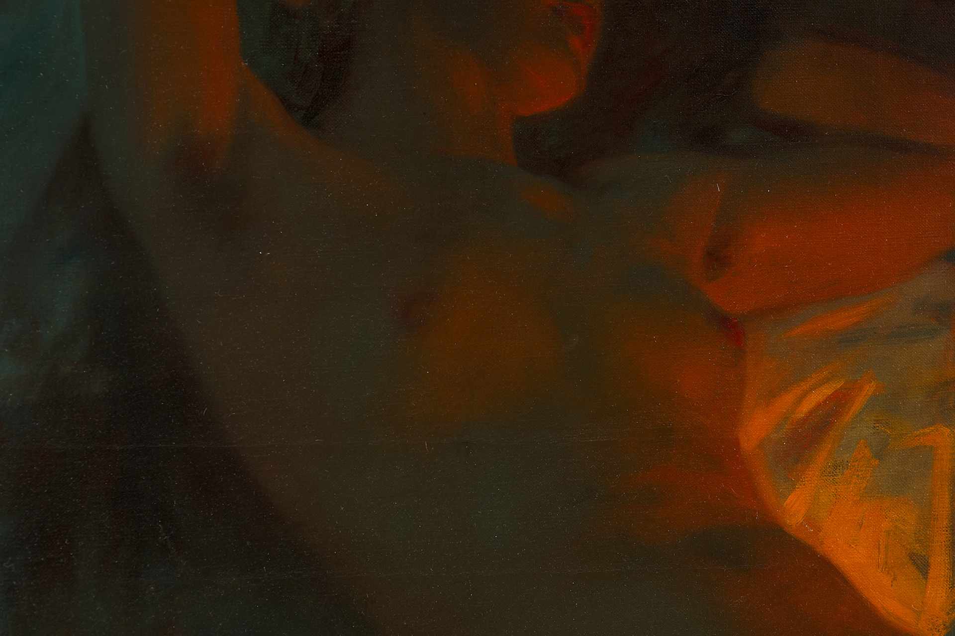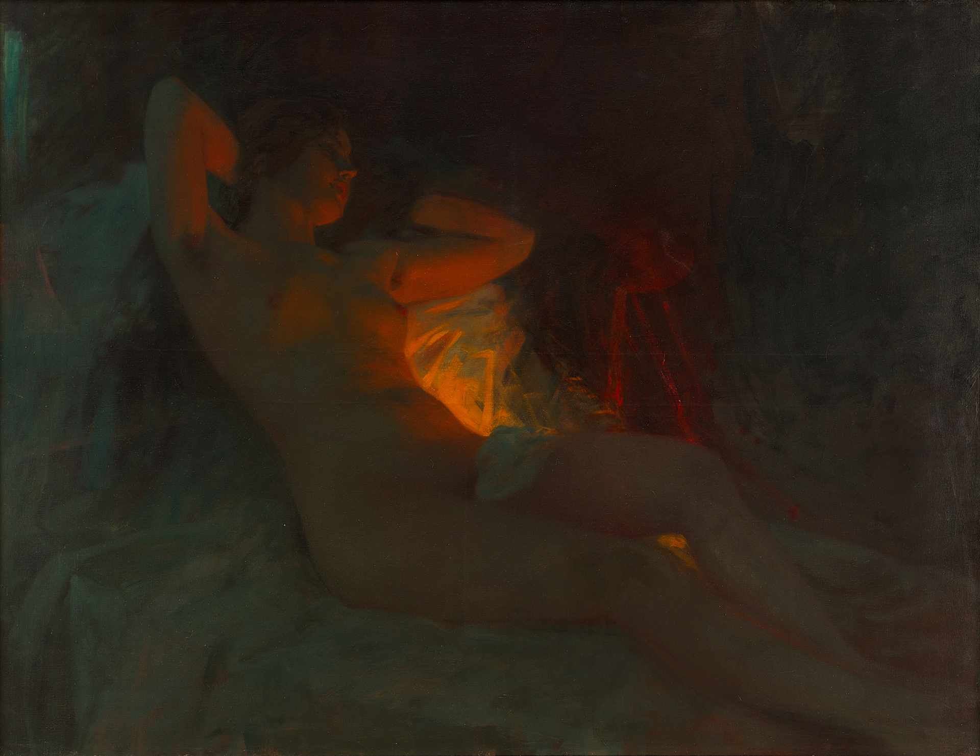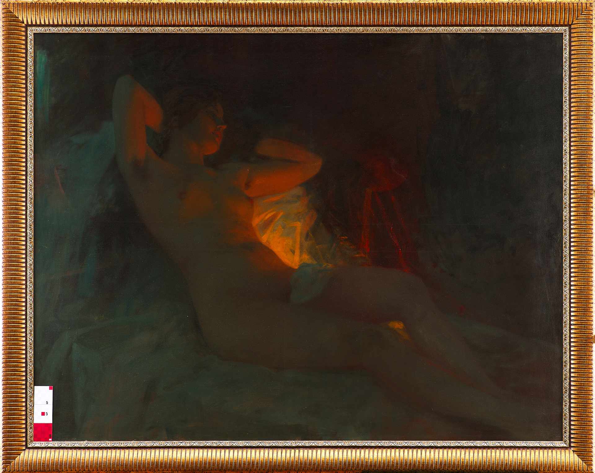 На картине изображена обнаженная молодая женщина, лежащая на разобранной постели. В комнате полумрак. Левая сторона тела освещена таинственным светом, исходящим от лахты.