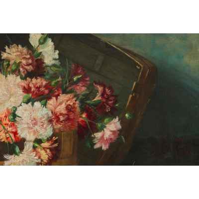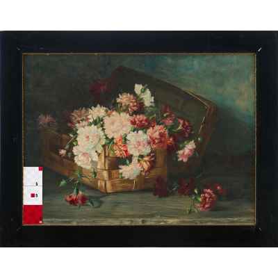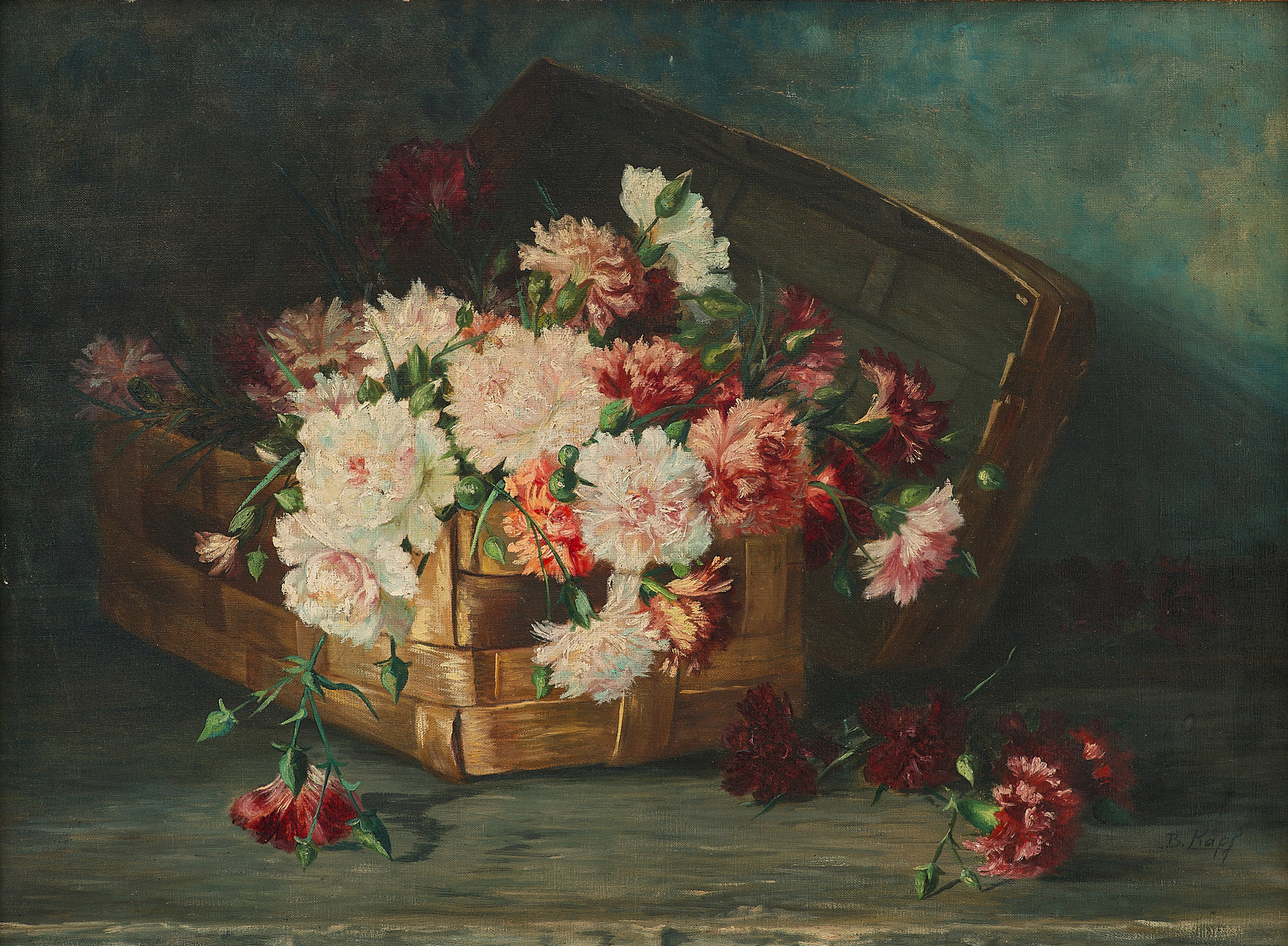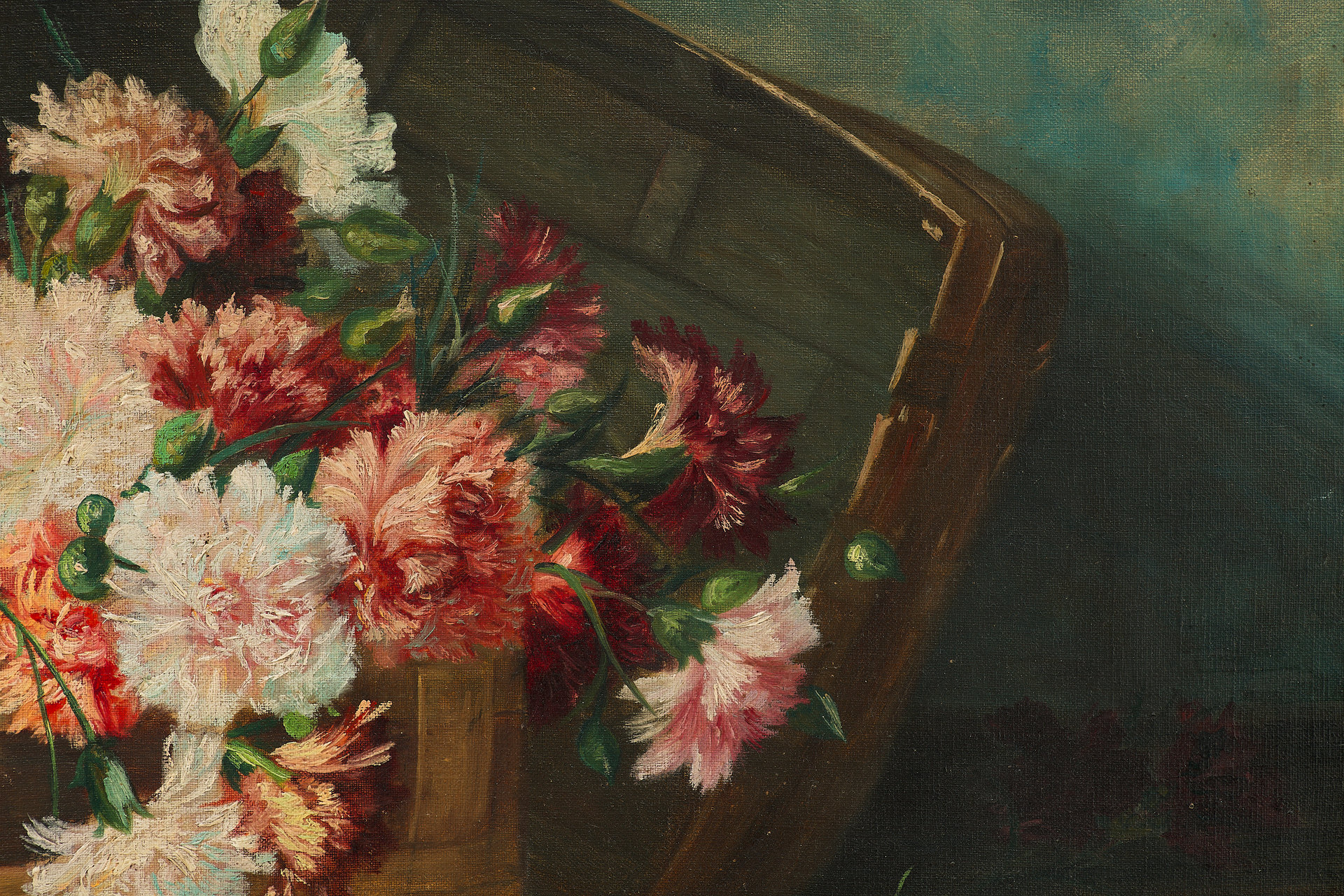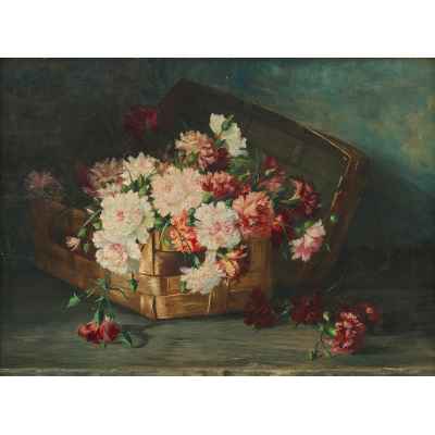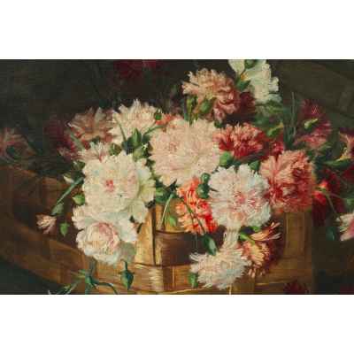 На картине изображён традиционный натюрморт, выполненный в реалистической манере: на ней представлен берестяной короб, наполненный пышным пучком свежесрезанных гвоздик. Цветы свободно лежат на краю и за пределами сосуда, в беспорядке, который только подчёркивает их живую, неформальную красоту. Богатство оттенков — от белоснежных до тёмно-малиновых — выгодно выделяется на фоне приглушённой синевы и сдержанного интерьера. Крышка от короба, прислонённая к стене, добавляет ощущение бытовой спонтанности сцены. Композиция тщательно выстроена, с вниманием к светотени, что создаёт эффект глубины и объёма.