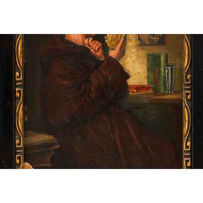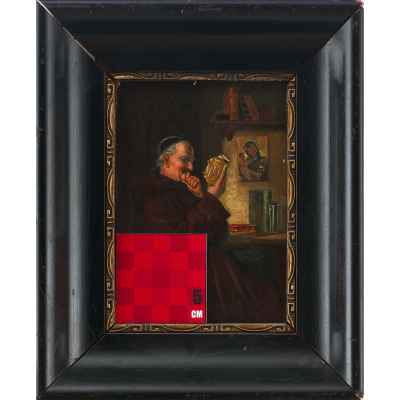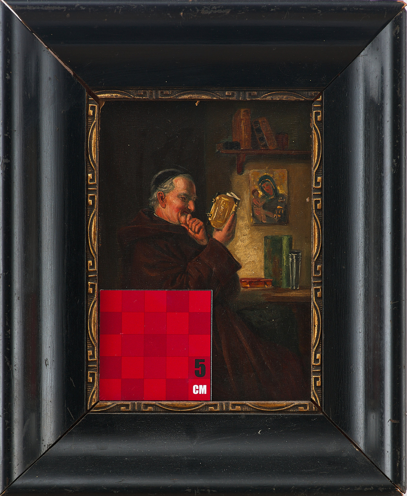 На обороте картины обнаружены штампы Берлинской мастерской по изготовлению деревянных основ, что также подтверждает её немецкое происхождение. Световая модель, насыщенность цвета и внимательная проработка лица и рук монаха указывают на профессиональный уровень исполнения.