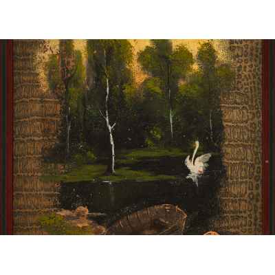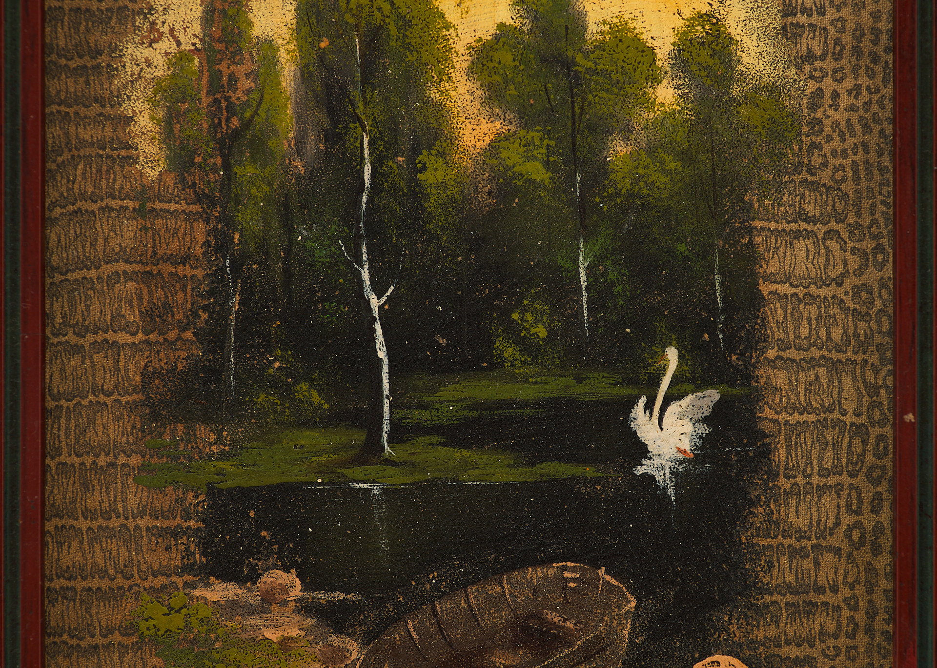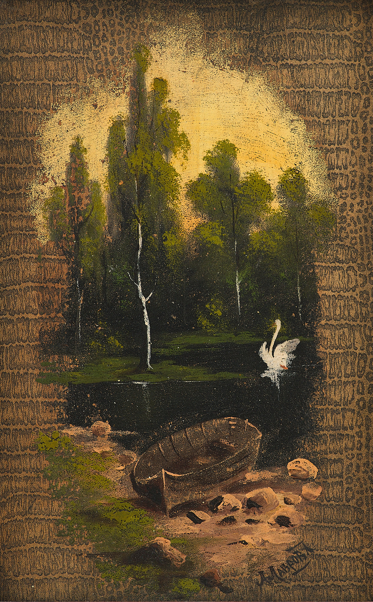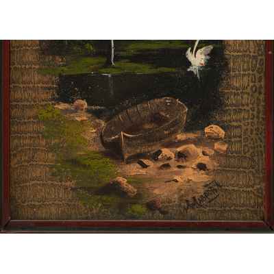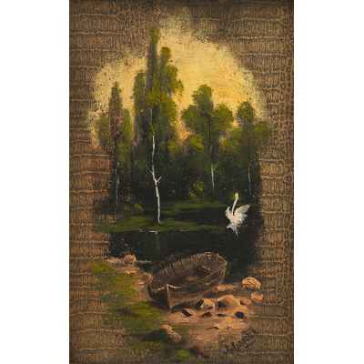 Перед нами живописное изображение, выполненное на обложке дамского альбома, популярного формата в культурной среде XIX — начала XX века. На тёплом фоне изображён тихий лесной пейзаж с лодкой на берегу, гладью пруда и одиноким лебедем, расправляющим крылья на воде. Композиция тщательно уравновешена: на первом плане — детально прорисованный берег, в центре — спокойная вода, отражающая свет, а на дальнем плане — стройные деревья, написанные в романтической манере. Освещение направлено изнутри композиции, создавая эффект мягкой иллюминации.