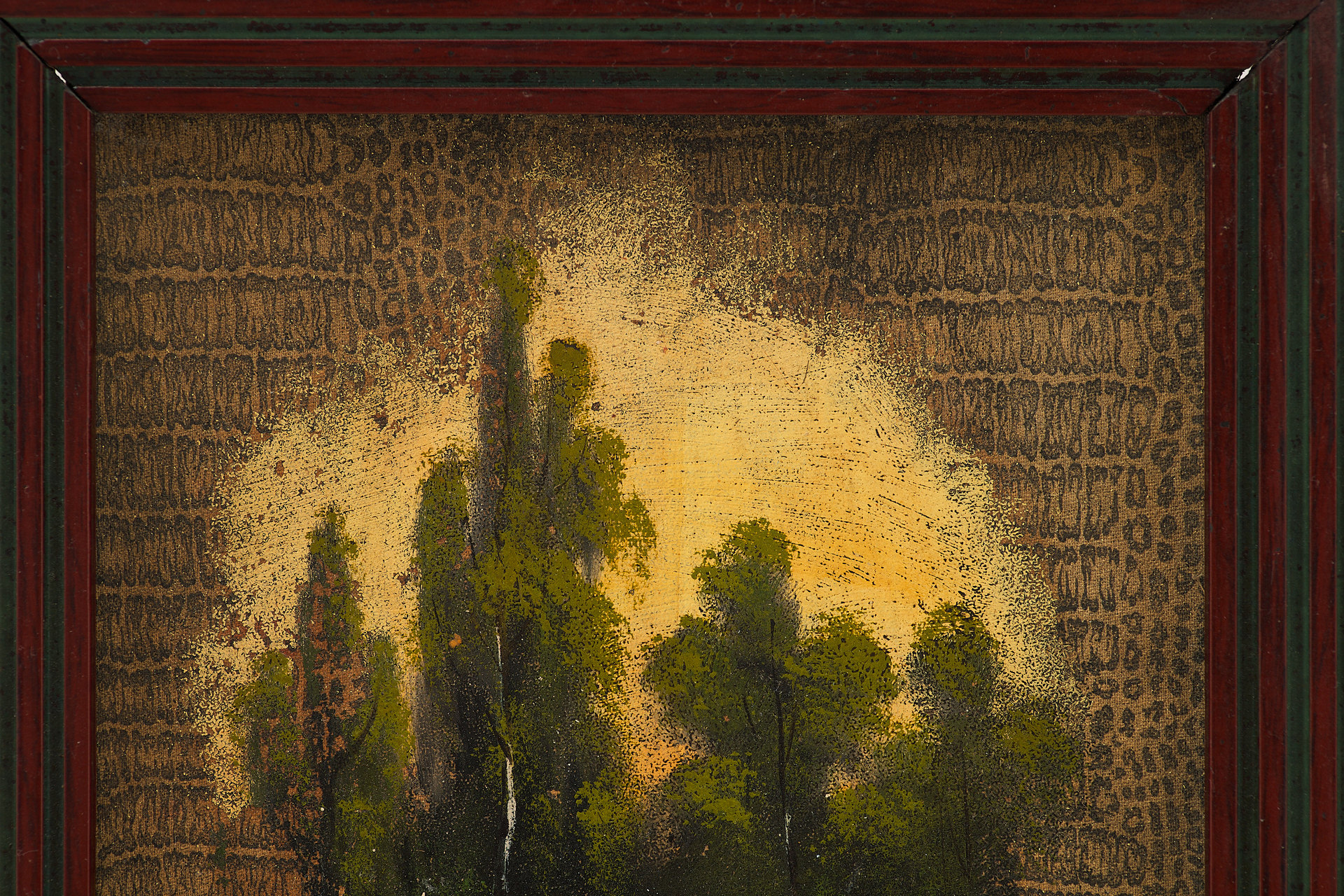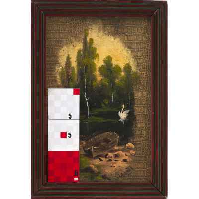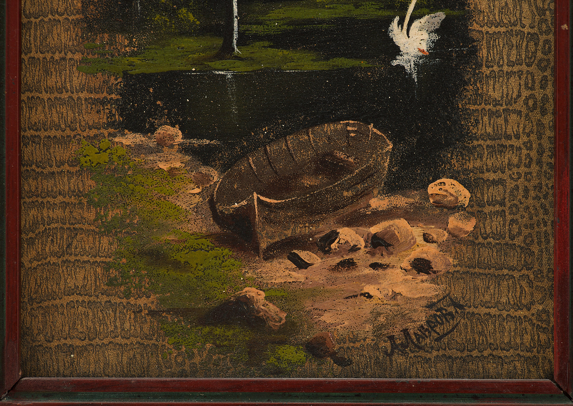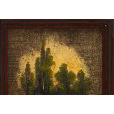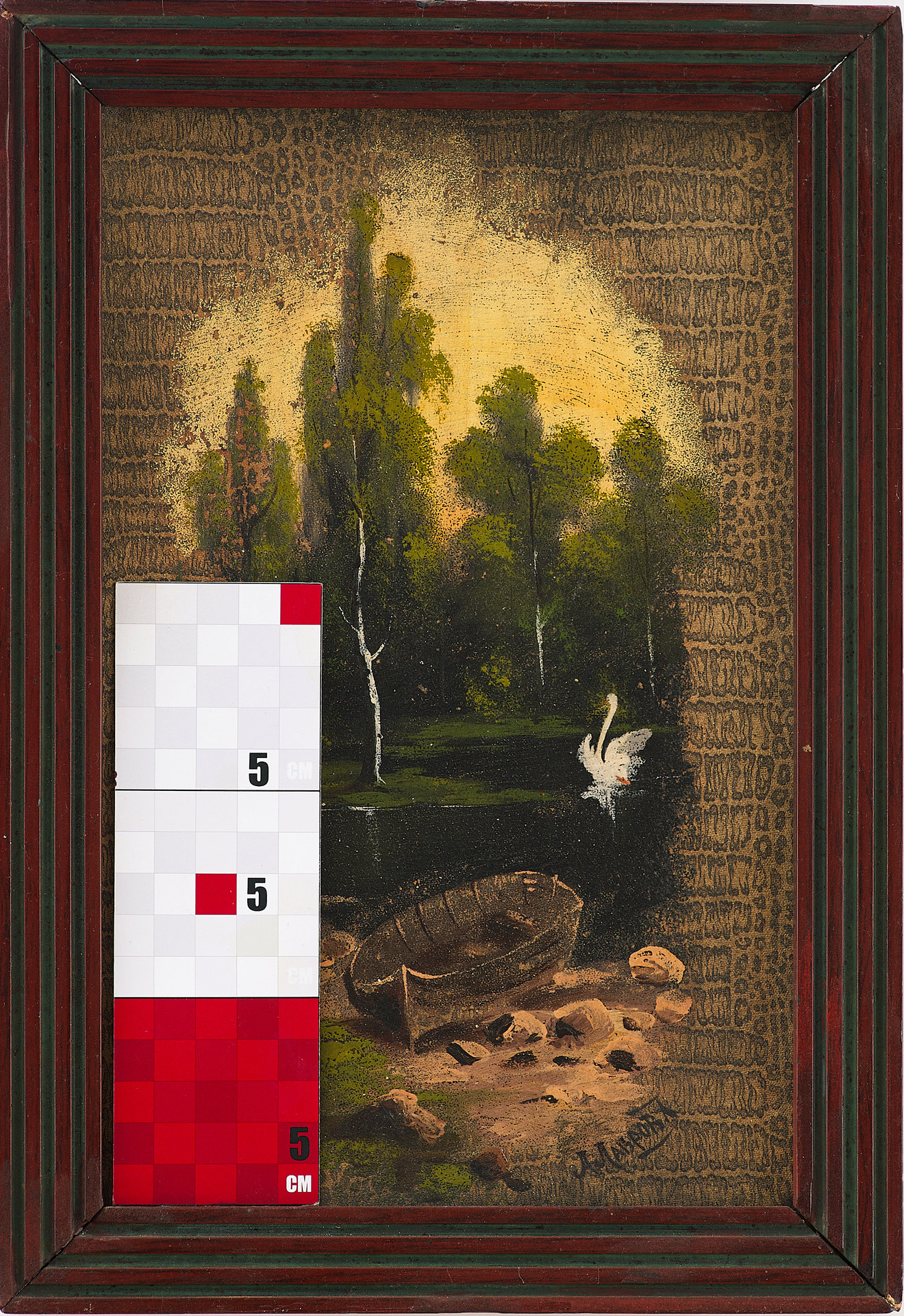 Перед нами живописное изображение, выполненное на обложке дамского альбома, популярного формата в культурной среде XIX — начала XX века. На тёплом фоне изображён тихий лесной пейзаж с лодкой на берегу, гладью пруда и одиноким лебедем, расправляющим крылья на воде. Композиция тщательно уравновешена: на первом плане — детально прорисованный берег, в центре — спокойная вода, отражающая свет, а на дальнем плане — стройные деревья, написанные в романтической манере. Освещение направлено изнутри композиции, создавая эффект мягкой иллюминации.