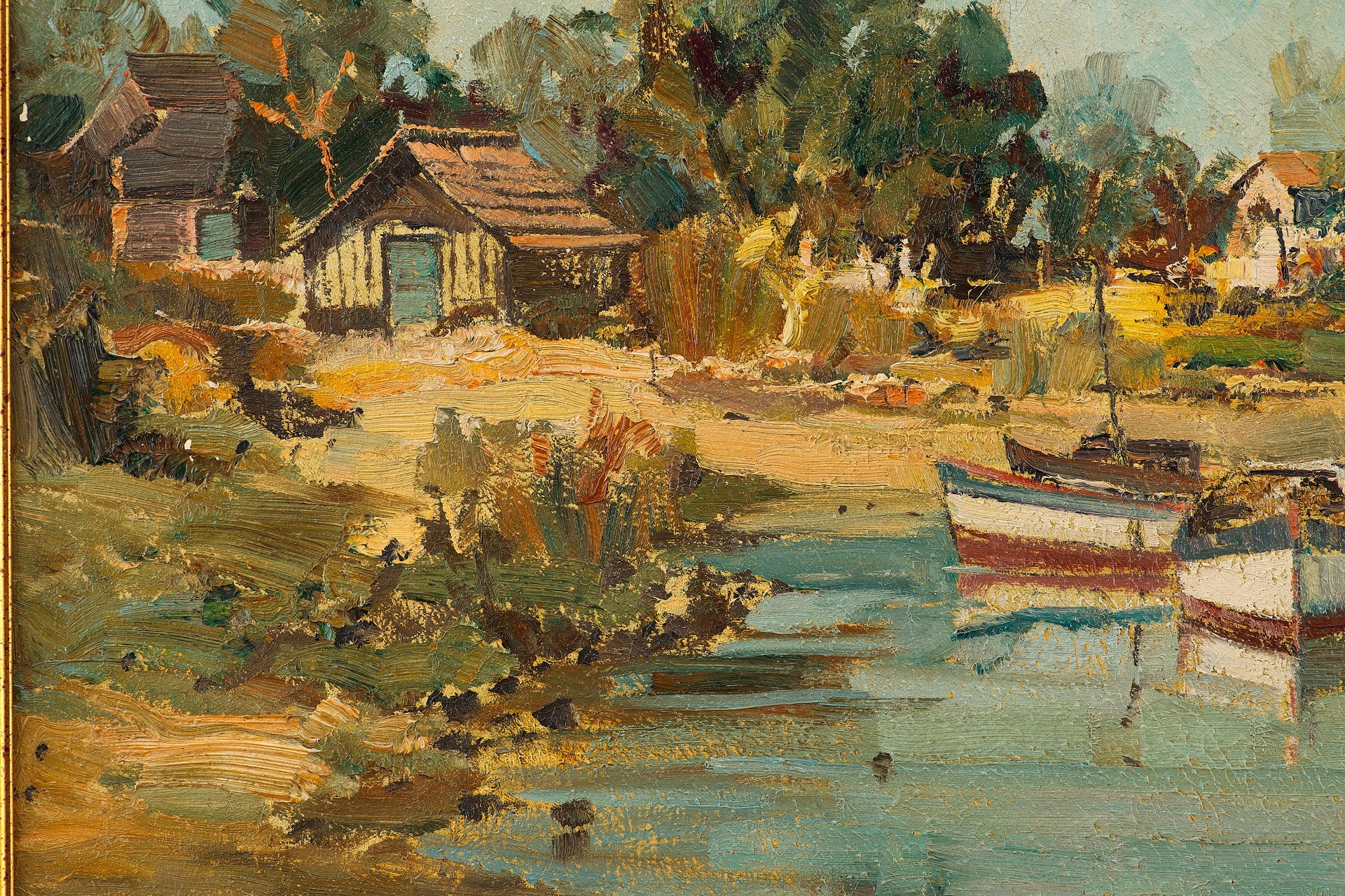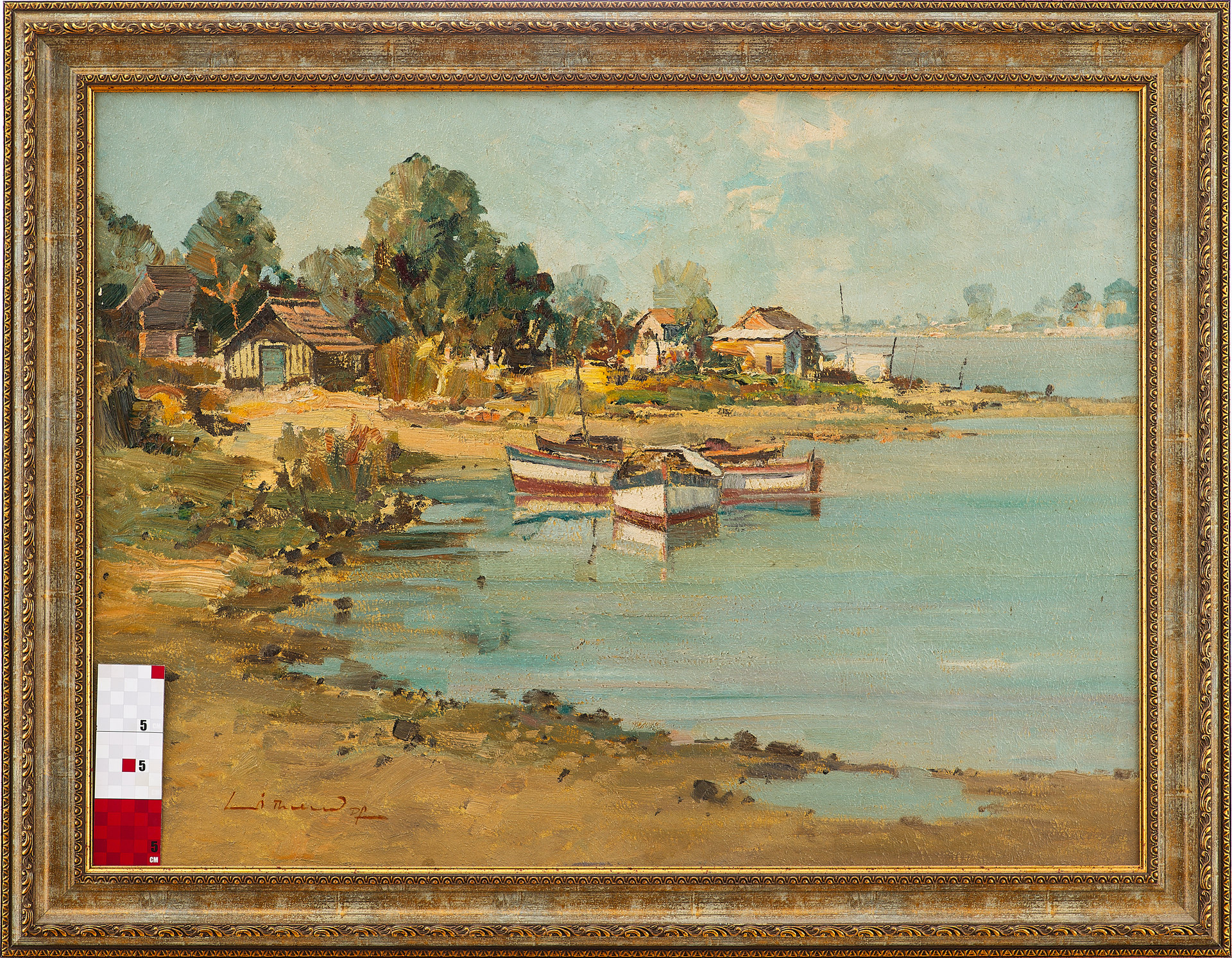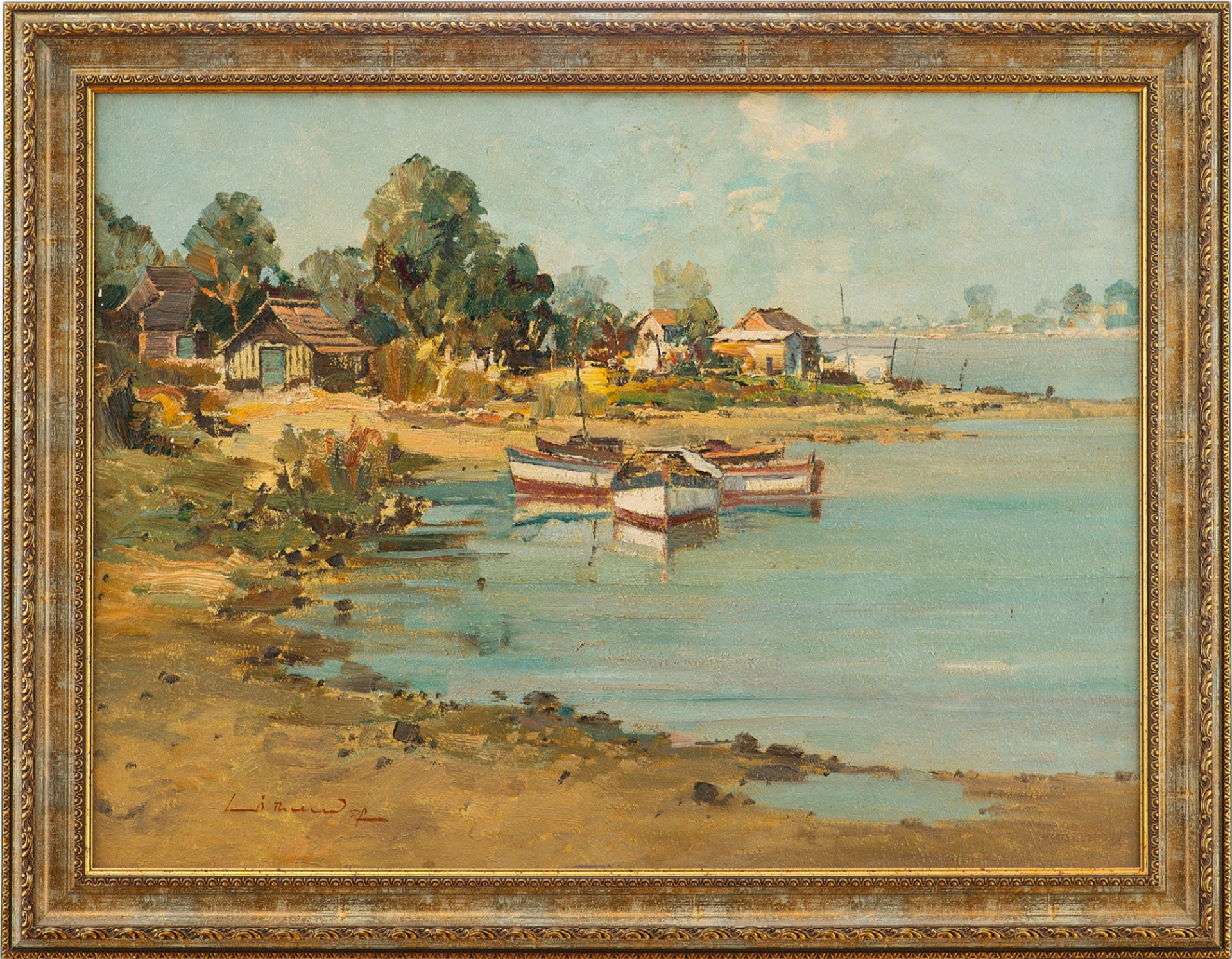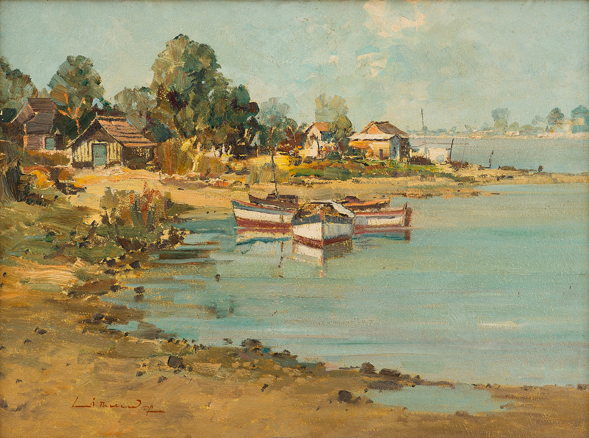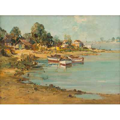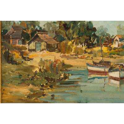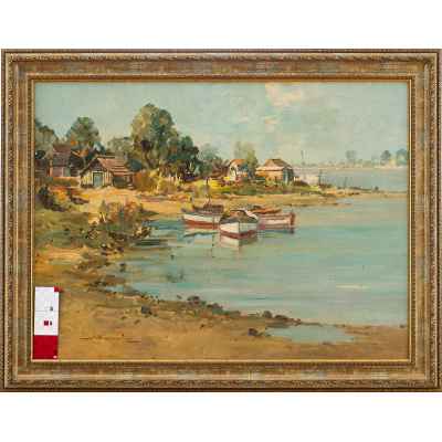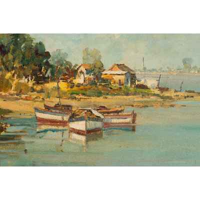 На картине изображён летний пейзаж с рыбацкими лодками, пришвартованными у берега широкой реки. Вдоль побережья расположены небольшие деревянные дома, окружённые густыми зелёными деревьями. Вода отражает светло-голубое небо с облаками, придавая всей сцене лёгкость и ощущение солнечного, тёплого дня. Композиция построена с ярко выраженной глубиной, уводящей взгляд от переднего плана с лодками к далёкому берегу.