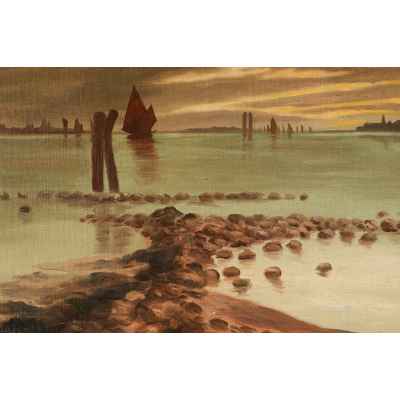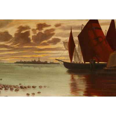 В центре композиции небольшое судно с поднятыми парусами. Море спокойное. Слева гладь воды разрезает узкая каменная коса. На дальнем плане виднеется линия городских построек. Картина вьпюлнена в рамках романтизма.