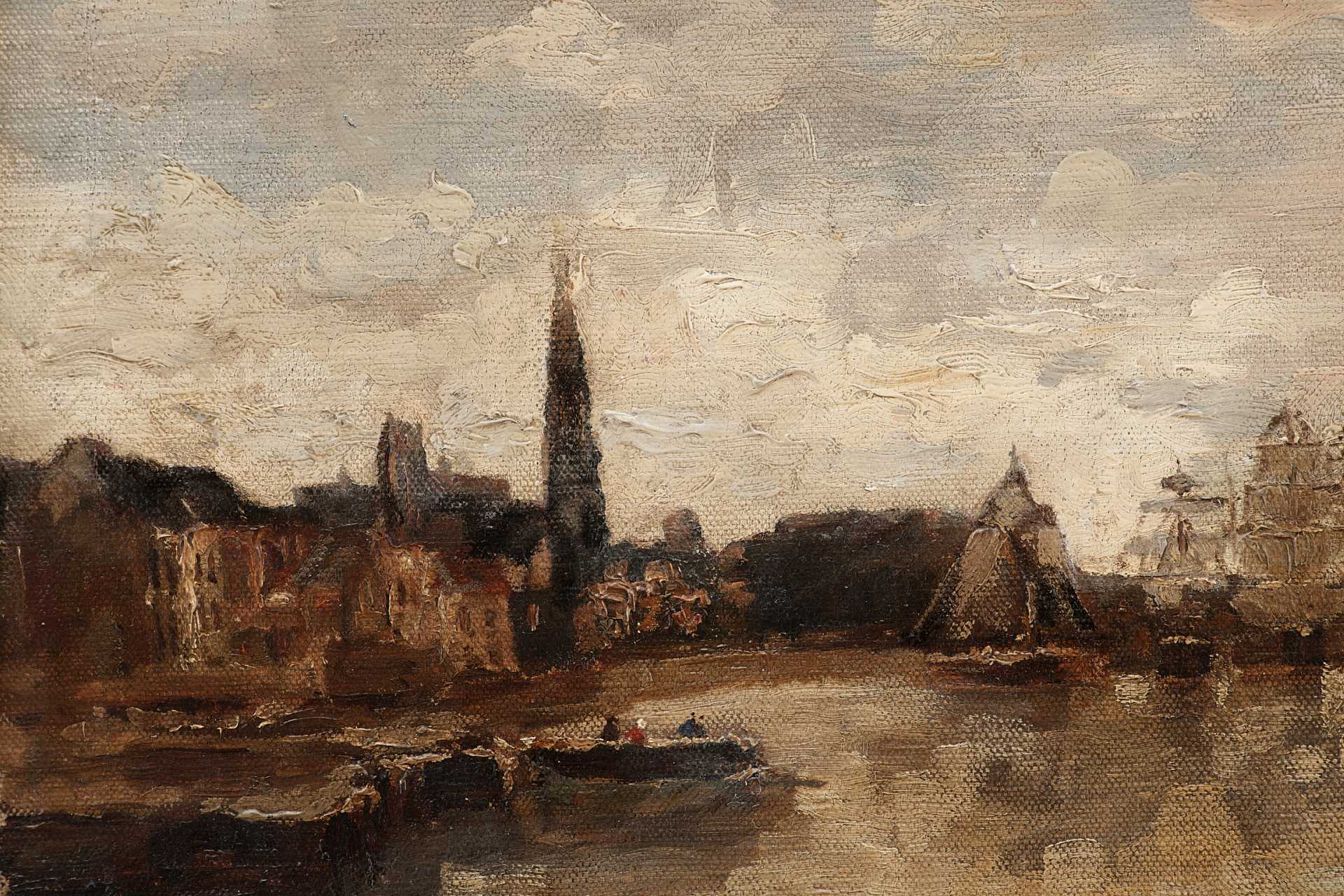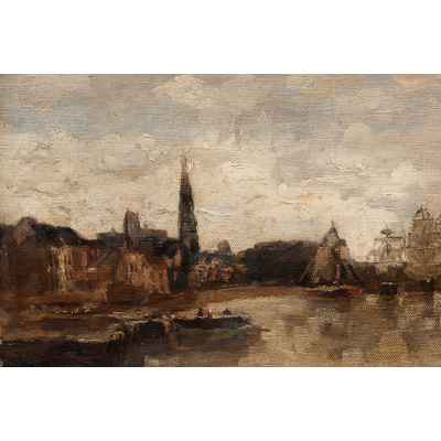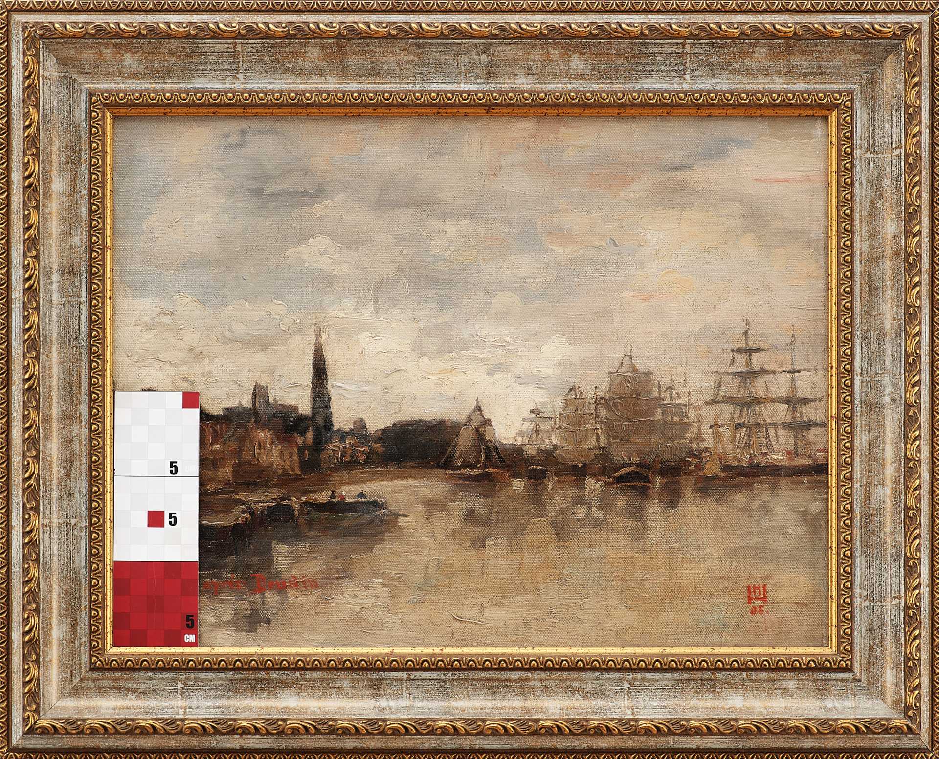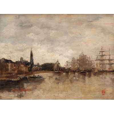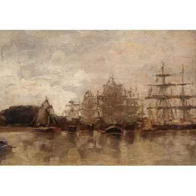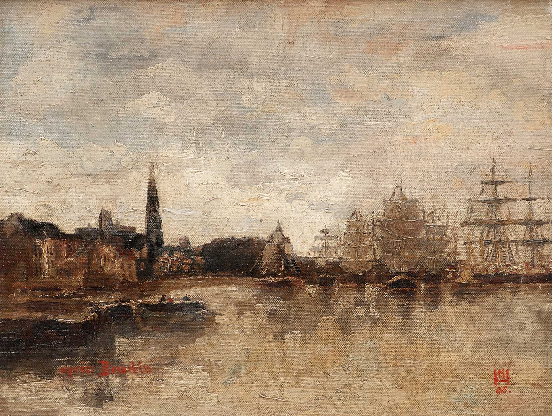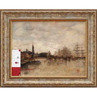На картине изображена старинная гавань с городским силуэтом на фоне пасмурного неба. На переднем плане отражается в спокойной воде линия построек, собор с высокой колокольней и несколько парусников и кораблей с высокими мачтами, выстроившихся у причала. Гавань кажется застывшей во времени, а мягкие оттенки охры, серого и коричневого передают ощущение глубокой тишины и мягкого рассеянного света.
