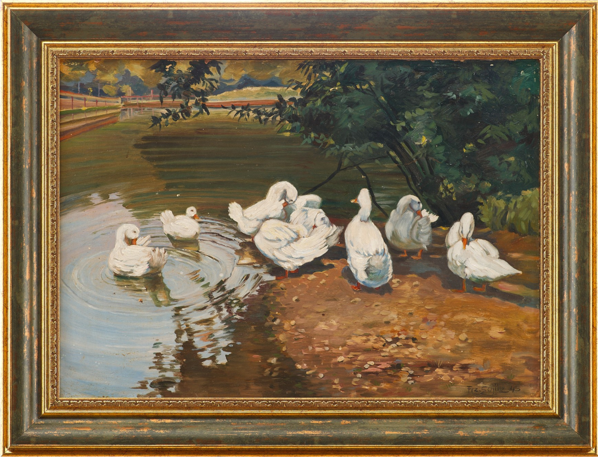 Автор картины — Frz. Schütz, подпись которого находится в правом нижнем углу, с датой 1943 года. На обороте имеется наклейка с оригинальным немецким названием работы — Am Ententeiche («На утином пруду»), что подтверждает подлинность и происхождение произведения. Размер: 32,5 × 45,5 см, техника: масло на картоне.