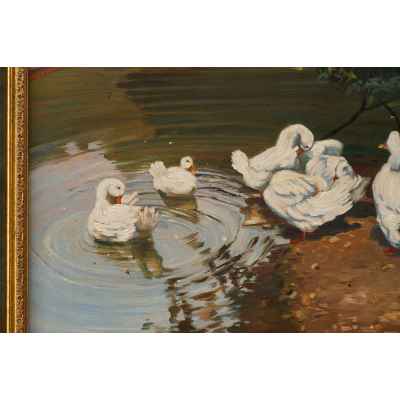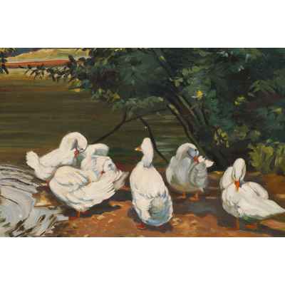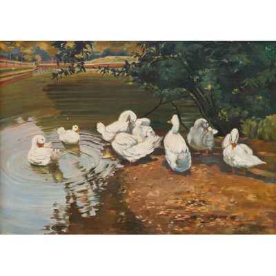 На картине изображён умиротворённый летний пейзаж с группой белоснежных уток, расположившихся на берегу городского пруда. Часть птиц плавает в воде, оставляя за собой круги на поверхности, другие чистят перья, стоя на тёплом глинистом берегу под тенью дерева. Тихая сцена передаёт ощущение солнечного полдня, спокойствия и гармонии природы. Композиция уравновешена, а игра света и отражений усиливает декоративность изображения.