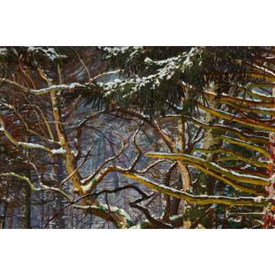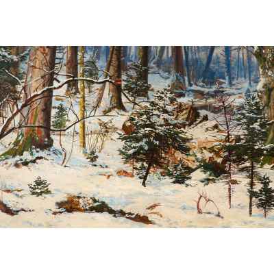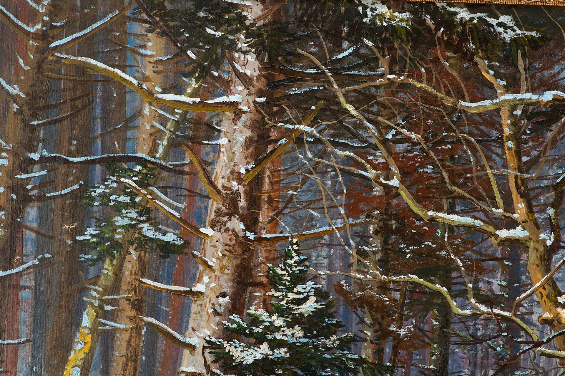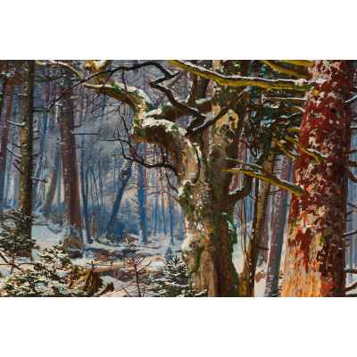Изображен заснеженный хвойный лес. Сквозь снег, на втором плане и далее виднеются стволы поваленных деревьев . Вдалеке едва заметен овраг с мостиком через него.