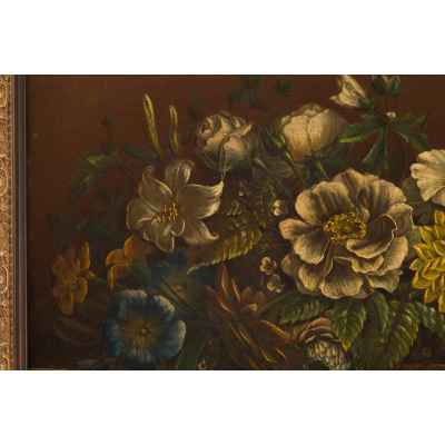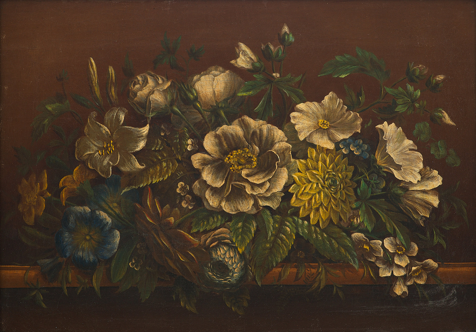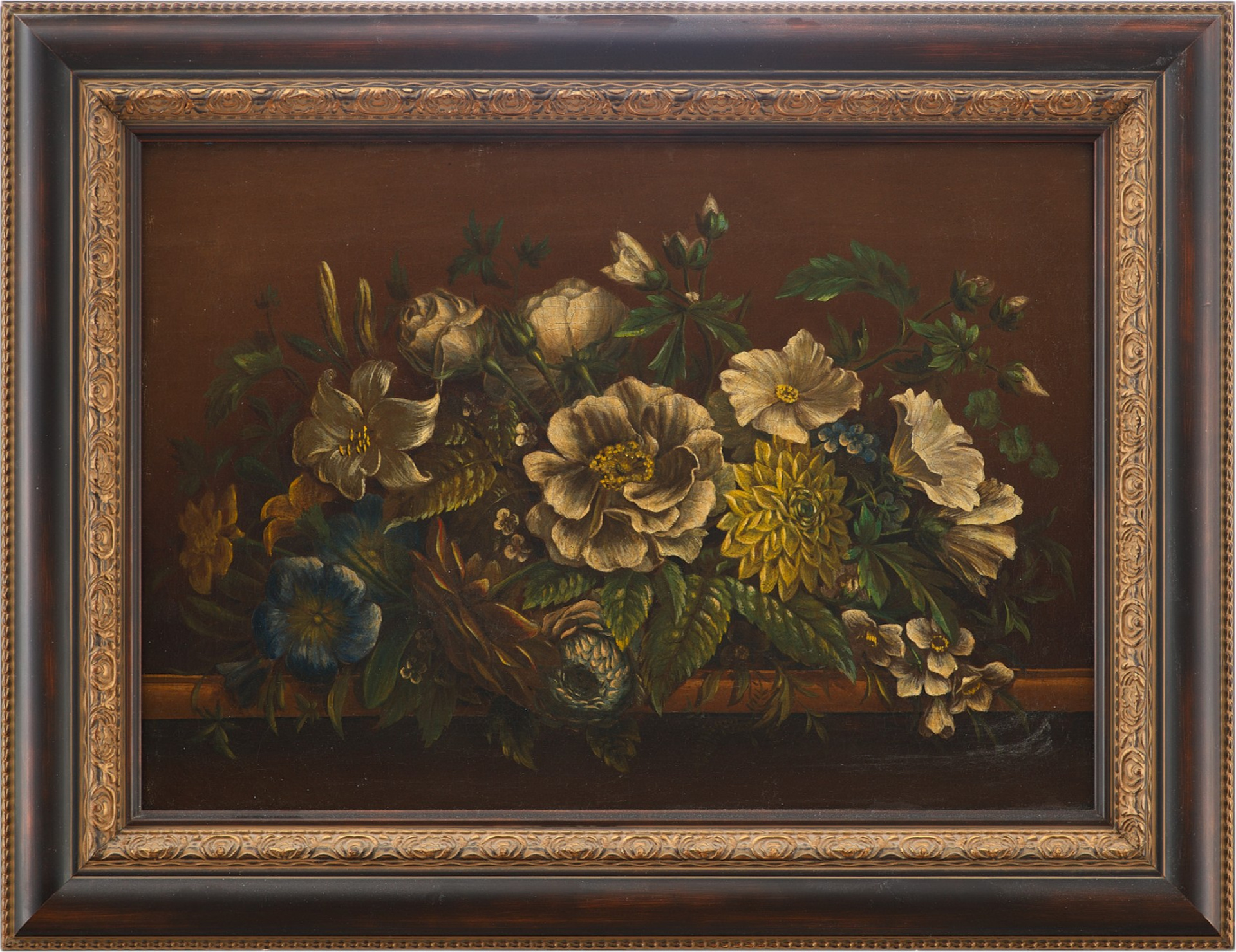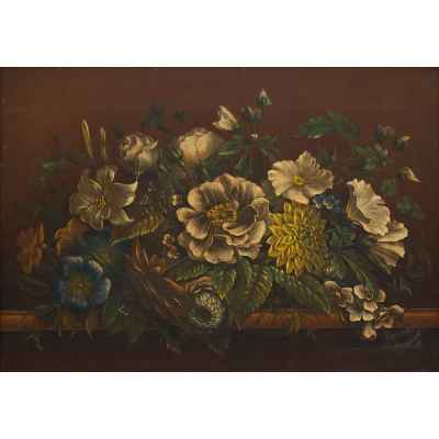 На картине изображён пышный цветочный натюрморт, выполненный в традиции европейской декоративной живописи конца XIX века. Композиция построена как горизонтальный венок из цветов, распущенных и бутонов, уложенных на невидимую подставку или край деревянной панели. Среди растений легко различимы розы, георгины, лилии, а также полевые цветы с белыми, жёлтыми, синими и зелёными оттенками. Тёмный фон подчёркивает яркость цветочной массы, делая её визуально насыщенной и объёмной.