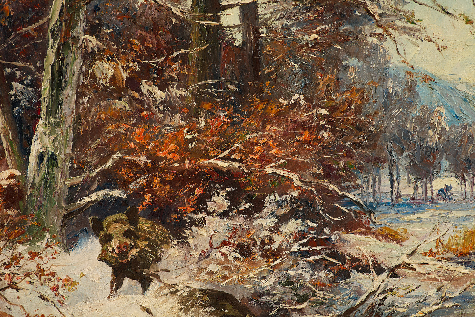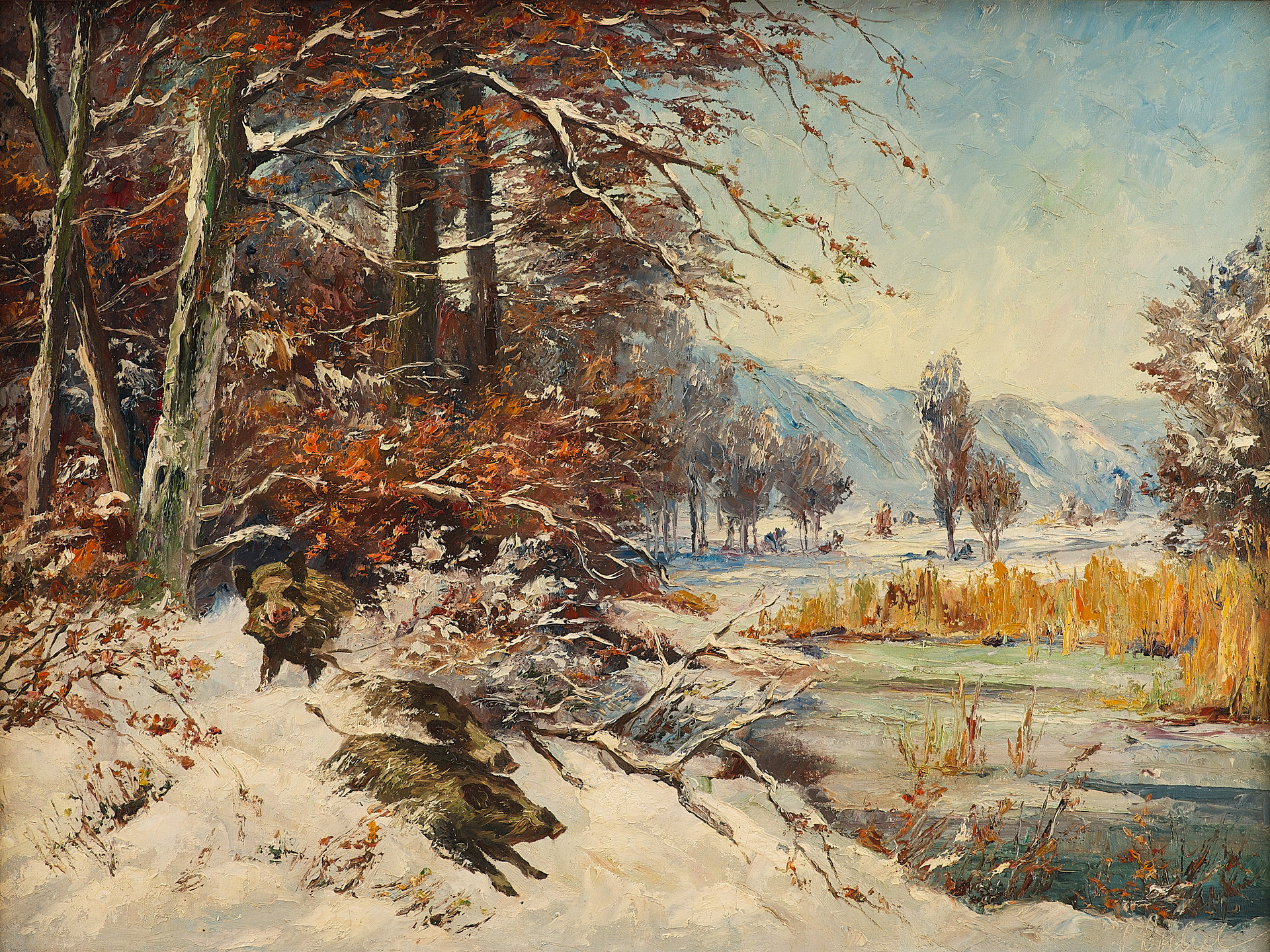 Сегодня такие произведения интересны не только с художественной, но и с историко-культурной точки зрения. Они востребованы в коллекциях, посвящённых европейской анималистике, охотничьим мотивам и живописи первой половины XX века. Картина «Кабаны в зимнем лесу» представляет собой качественный пример этой традиции, написанный на высоком профессиональном уровне и обладающий коллекционной ценностью.