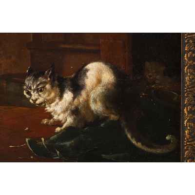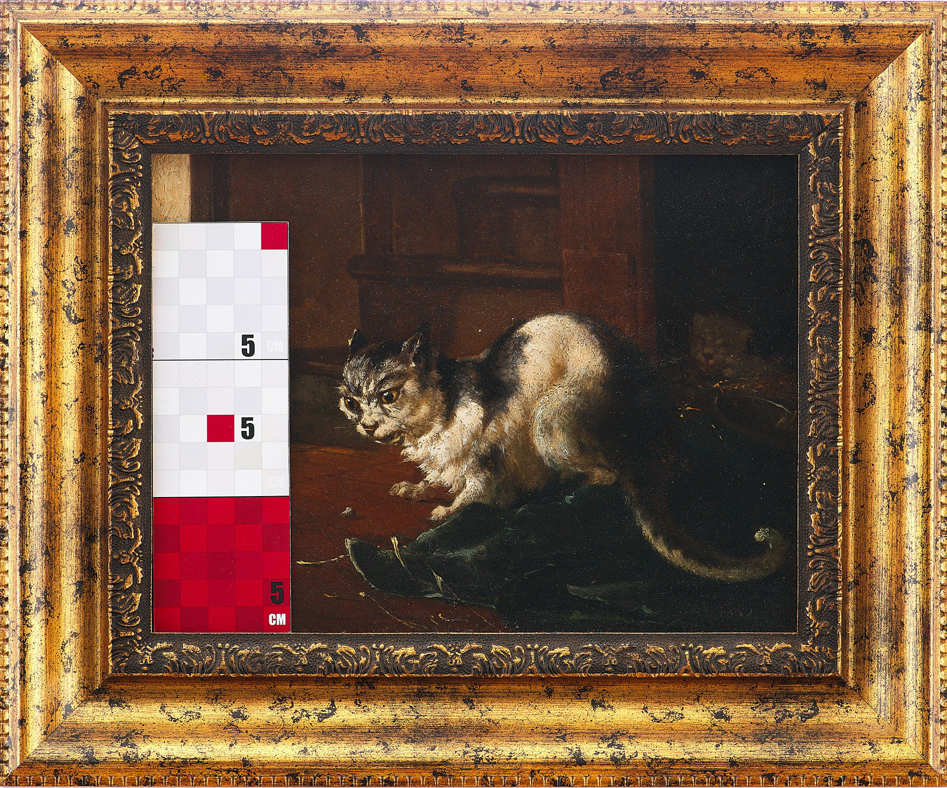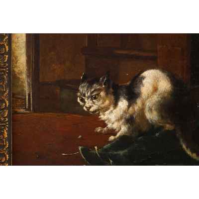 Произведение создано в последней четверти XIX века и выполнено в масляной технике на деревянной основе. Оно отличается высокой детализацией и характерной для Коулдери тщательной прорисовкой меха, текстур и мимики животных. Композиция построена на контрасте света и тени, усиливающем драматизм сцены. Художник применяет сдержанную, но тёплую палитру, что подчёркивает интимную атмосферу интерьера.