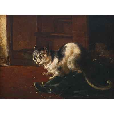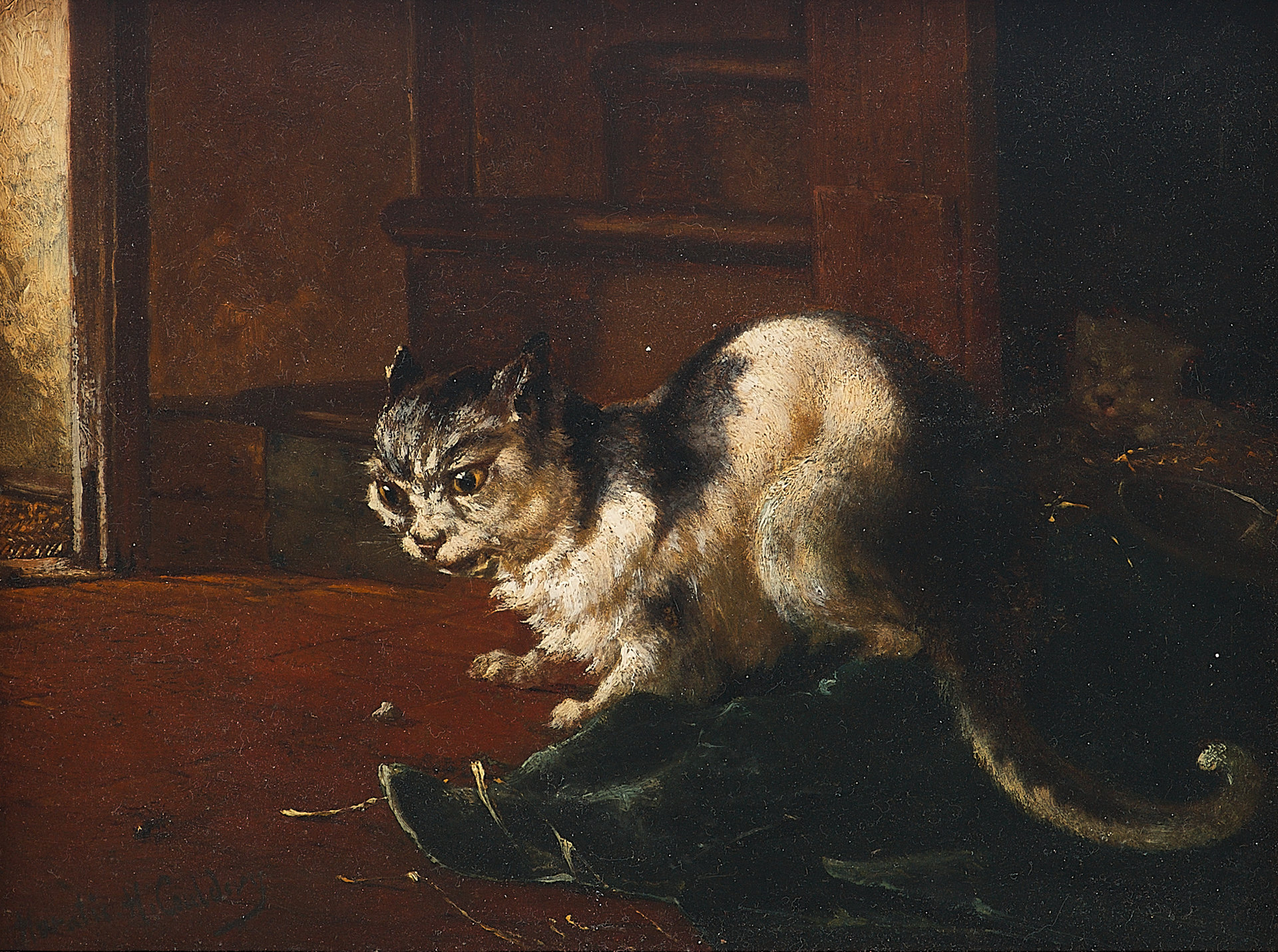Картина «Незваный гость» принадлежит кисти Горацио Генри Коулдери (Horatio Henry Couldery, 1832–1918) — английского живописца-анималиста и иллюстратора, известного своими выразительными изображениями домашних животных. На небольшом по размеру полотне изображена напряжённая сцена: домашняя кошка с выгнутой спиной и вздыбленной шерстью настороженно реагирует на маленького паука на полу. Этот бытовой эпизод передан с особой наблюдательностью и юмором, типичными для творчества художника.