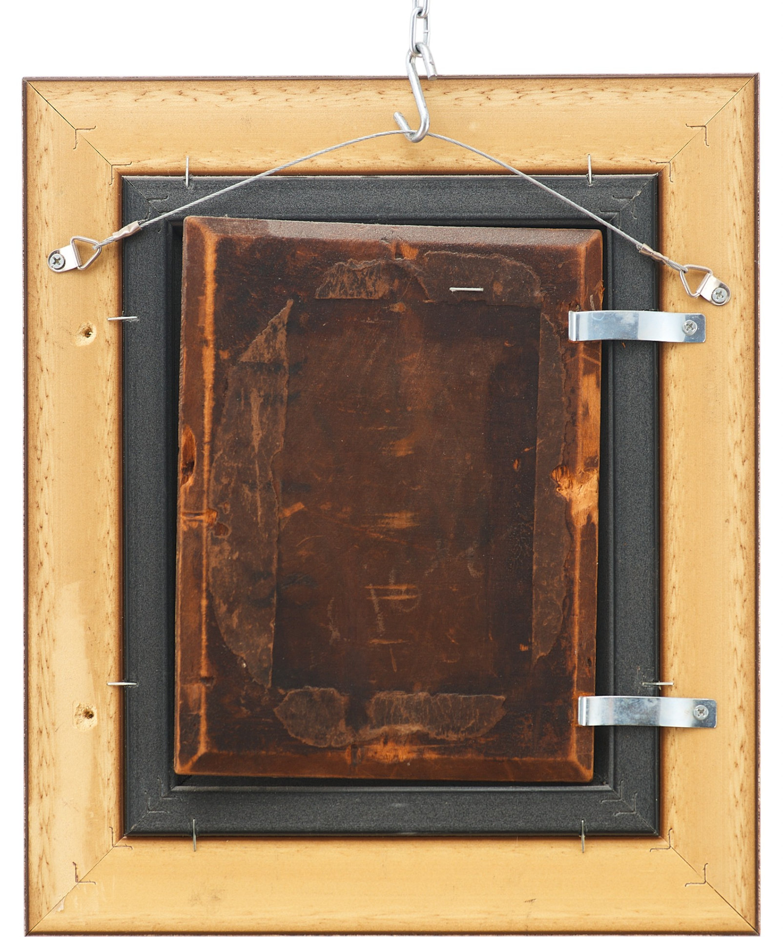 Работа относится к последней четверти XIX века и выполнена в технике масло на дереве, что характерно для академической европейской живописи этого периода. Композиция строго фронтальна, с мягкой светотенью, выделяющей лицо из тёмного фона. Особое внимание уделено нюансам выражения, что было типично для портретной традиции, ориентированной на чувственность, грацию и идеализированный образ.