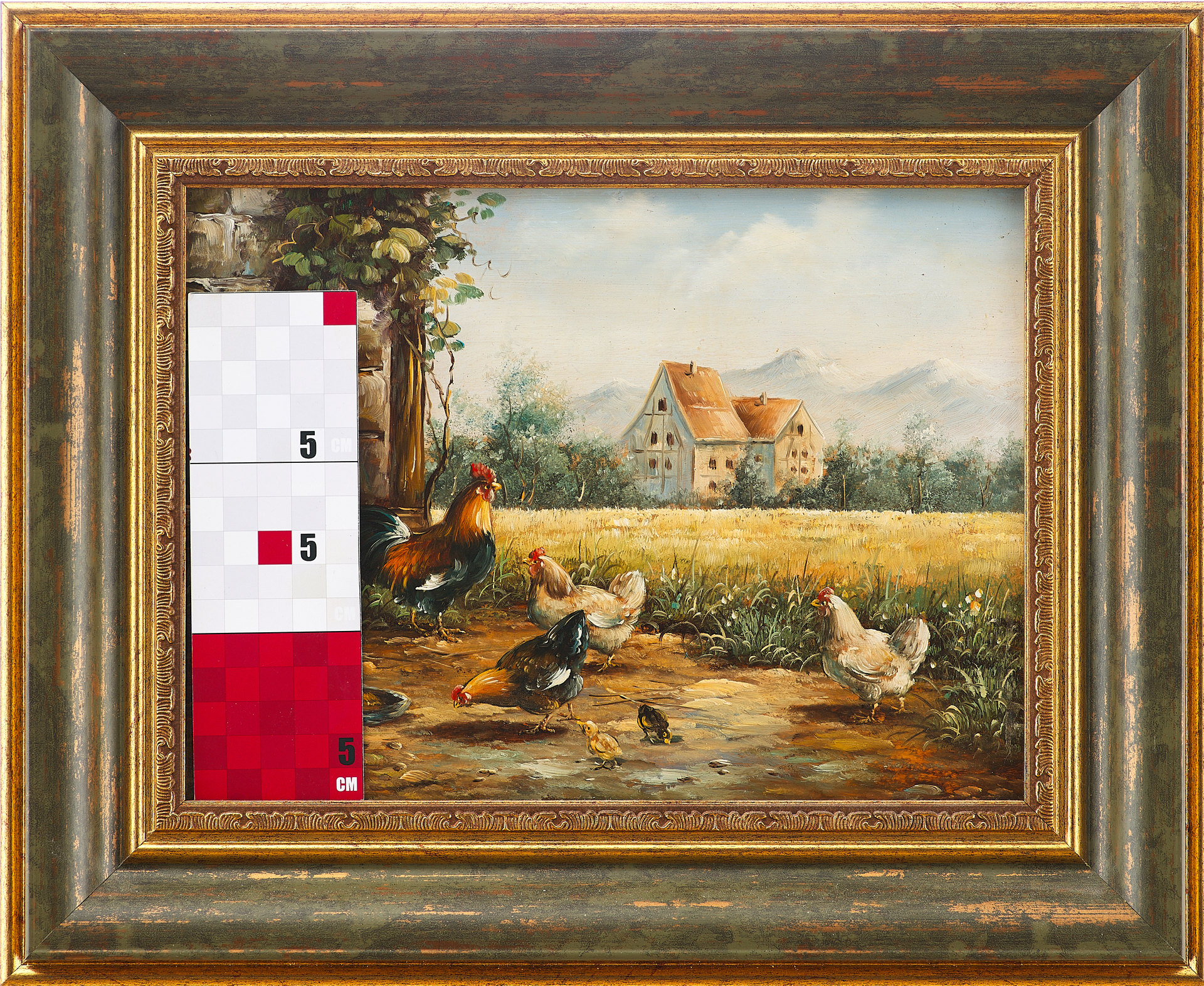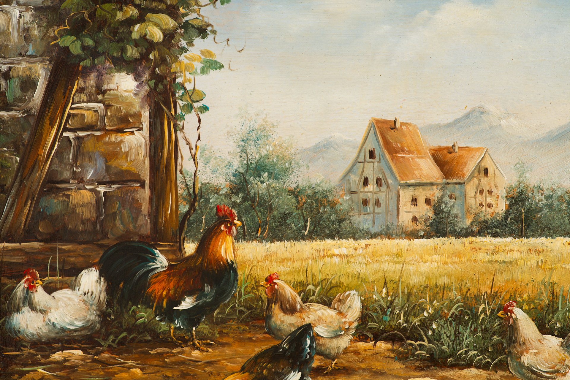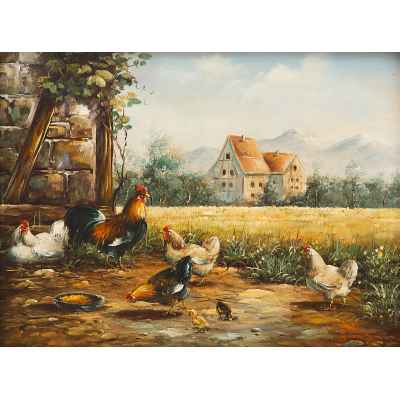 На картине изображена сцена из повседневной сельской жизни, наполненная спокойствием и ритмом деревенского быта. На переднем плане — двор с петухом, курицами и цыплятами, собравшимися у кормушки. Слева видна каменная стена дома, покрытая виноградной лозой, а справа — зелёная поляна, уходящая в сторону посевов и деревьев. На горизонте — два светлых сельских дома с черепичными крышами, на фоне которых возвышаются голубоватые силуэты гор. Композиция выстроена так, чтобы создать ощущение глубины и приглушённой пасторальной гармонии.