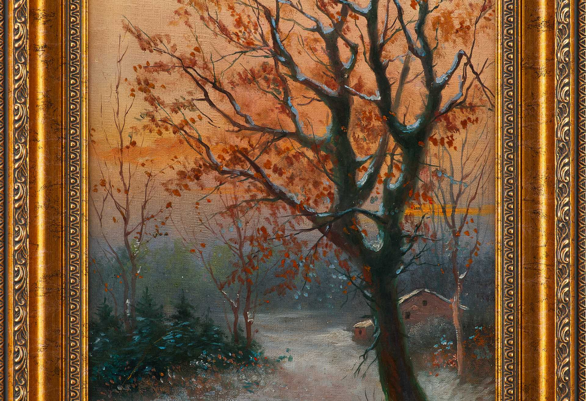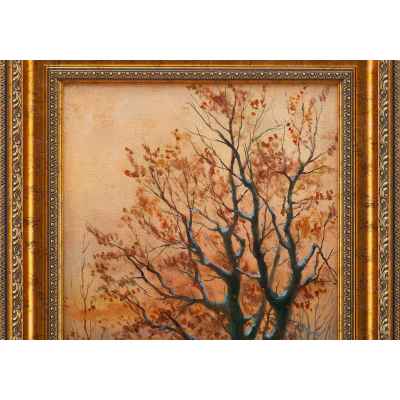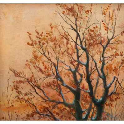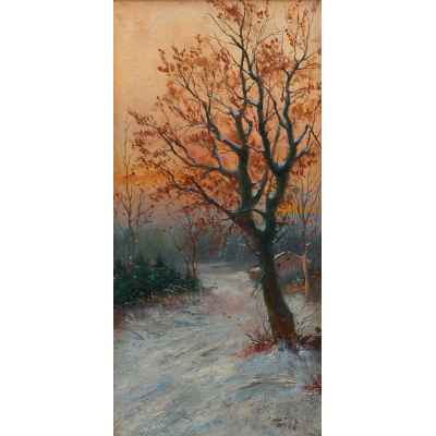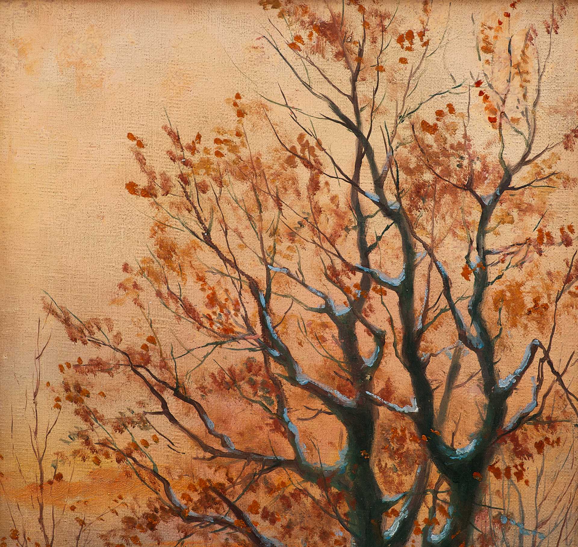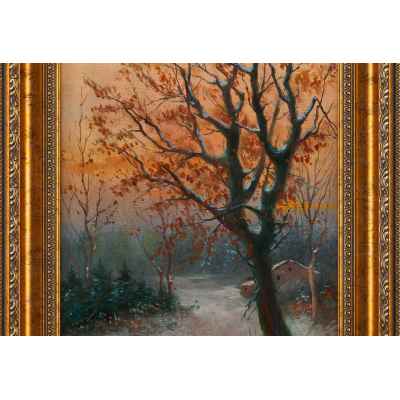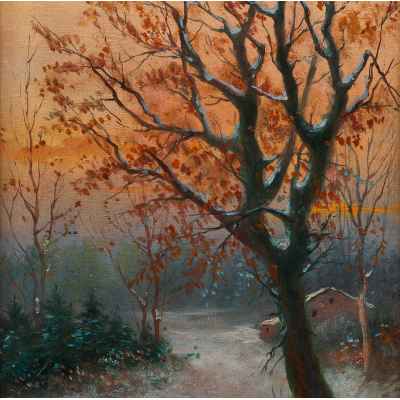 Перед нами живописное произведение под названием «Ноябрь», созданное во второй половине XIX века. На картине изображён осенне-зимний пейзаж: на переднем плане выделяется крупное дерево с остывающей листвой, его тёмный силуэт резко выделяется на фоне охристого неба. Под ним — слегка припорошенная снегом земля. В глубине виднеется узкая дорога, уходящая к небольшим домикам, частично скрытым за деревьями. Мягкие голубовато-серые и буро-красные оттенки усиливают атмосферу поздней осени — момента перехода к зиме.