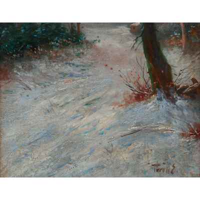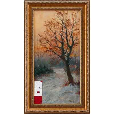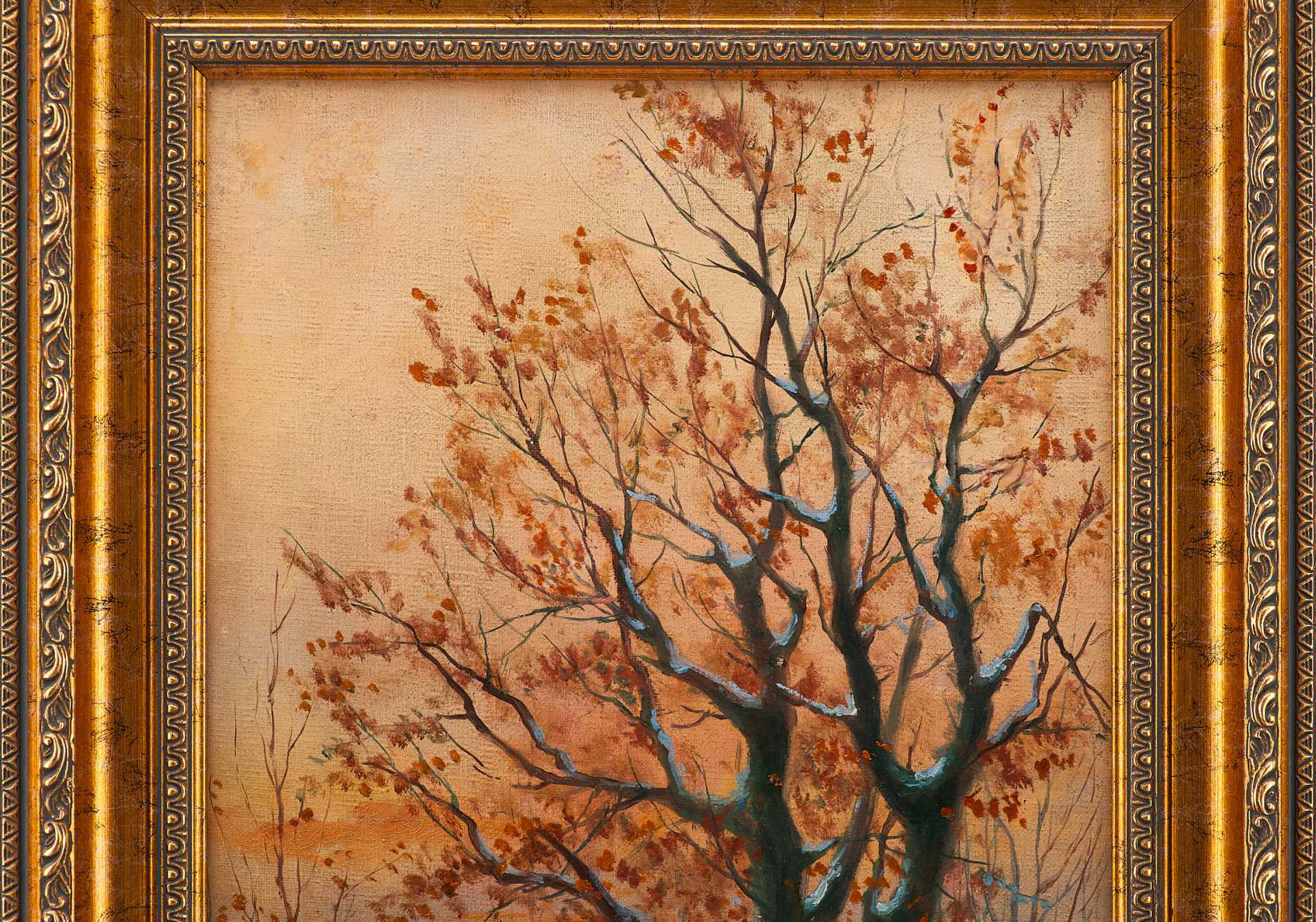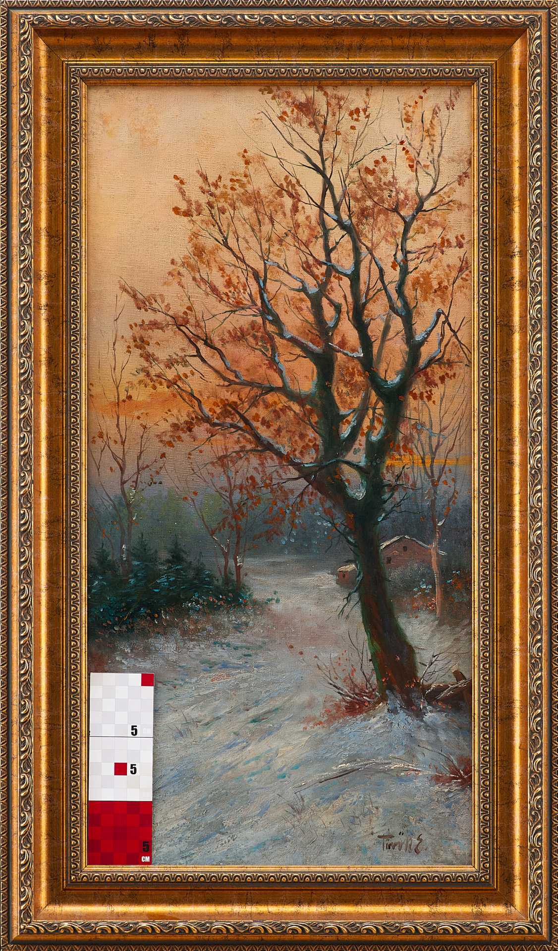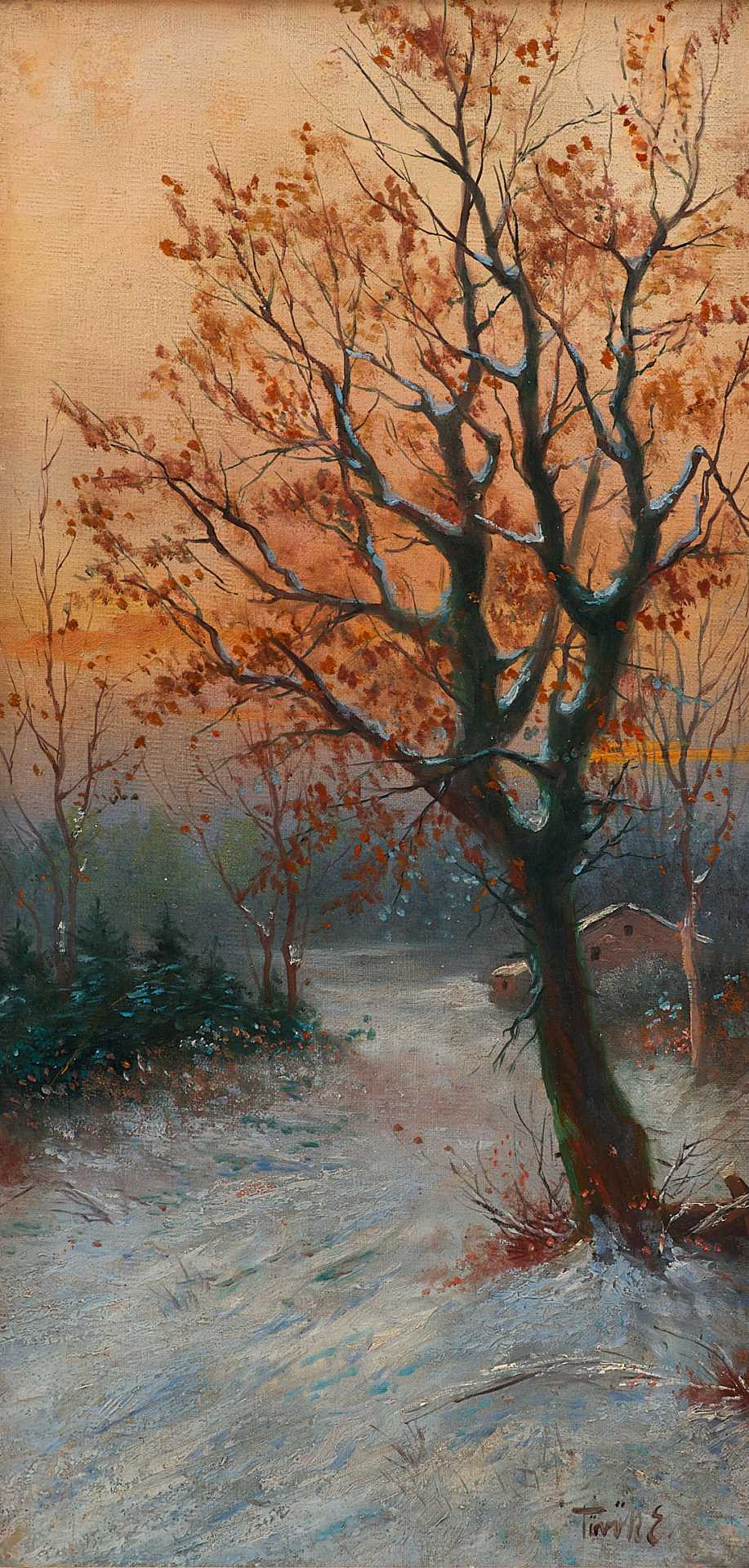 Перед нами живописное произведение под названием «Ноябрь», созданное во второй половине XIX века. На картине изображён осенне-зимний пейзаж: на переднем плане выделяется крупное дерево с остывающей листвой, его тёмный силуэт резко выделяется на фоне охристого неба. Под ним — слегка припорошенная снегом земля. В глубине виднеется узкая дорога, уходящая к небольшим домикам, частично скрытым за деревьями. Мягкие голубовато-серые и буро-красные оттенки усиливают атмосферу поздней осени — момента перехода к зиме.