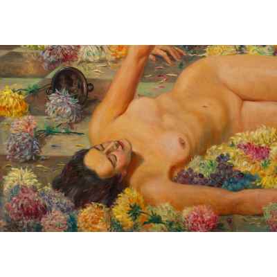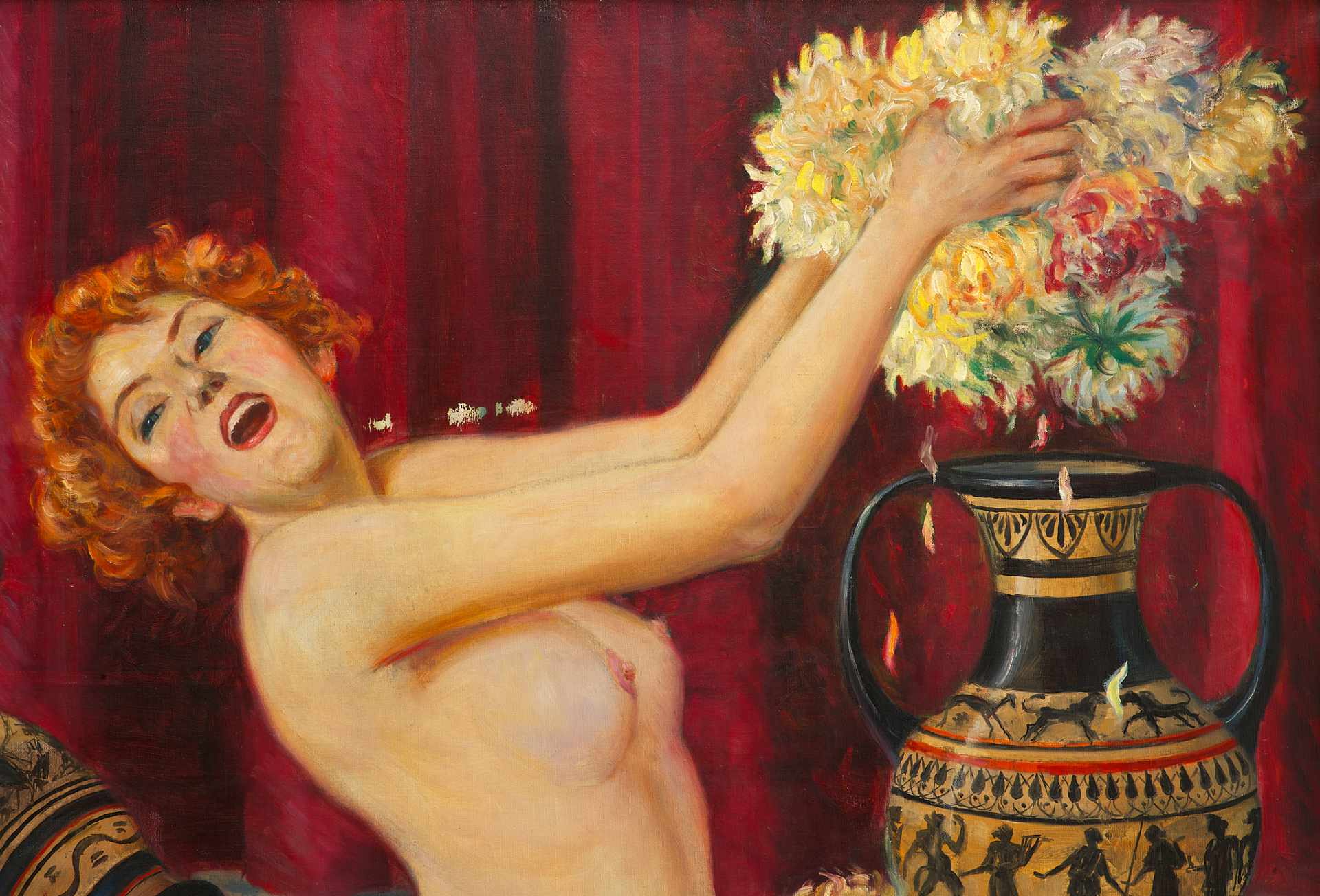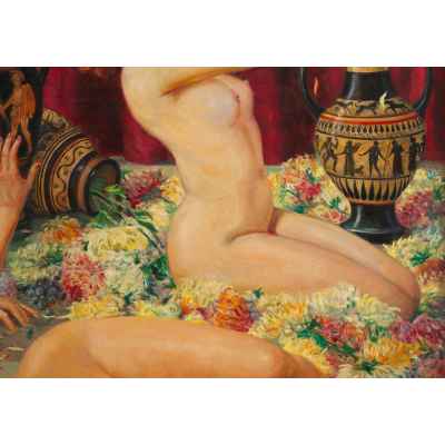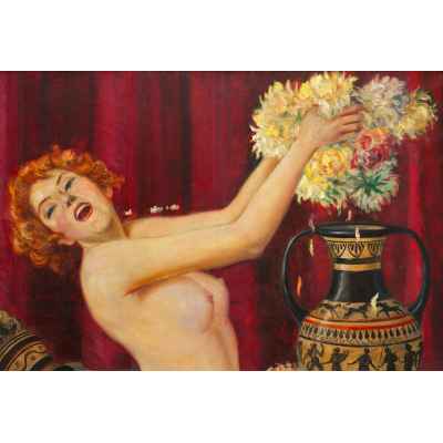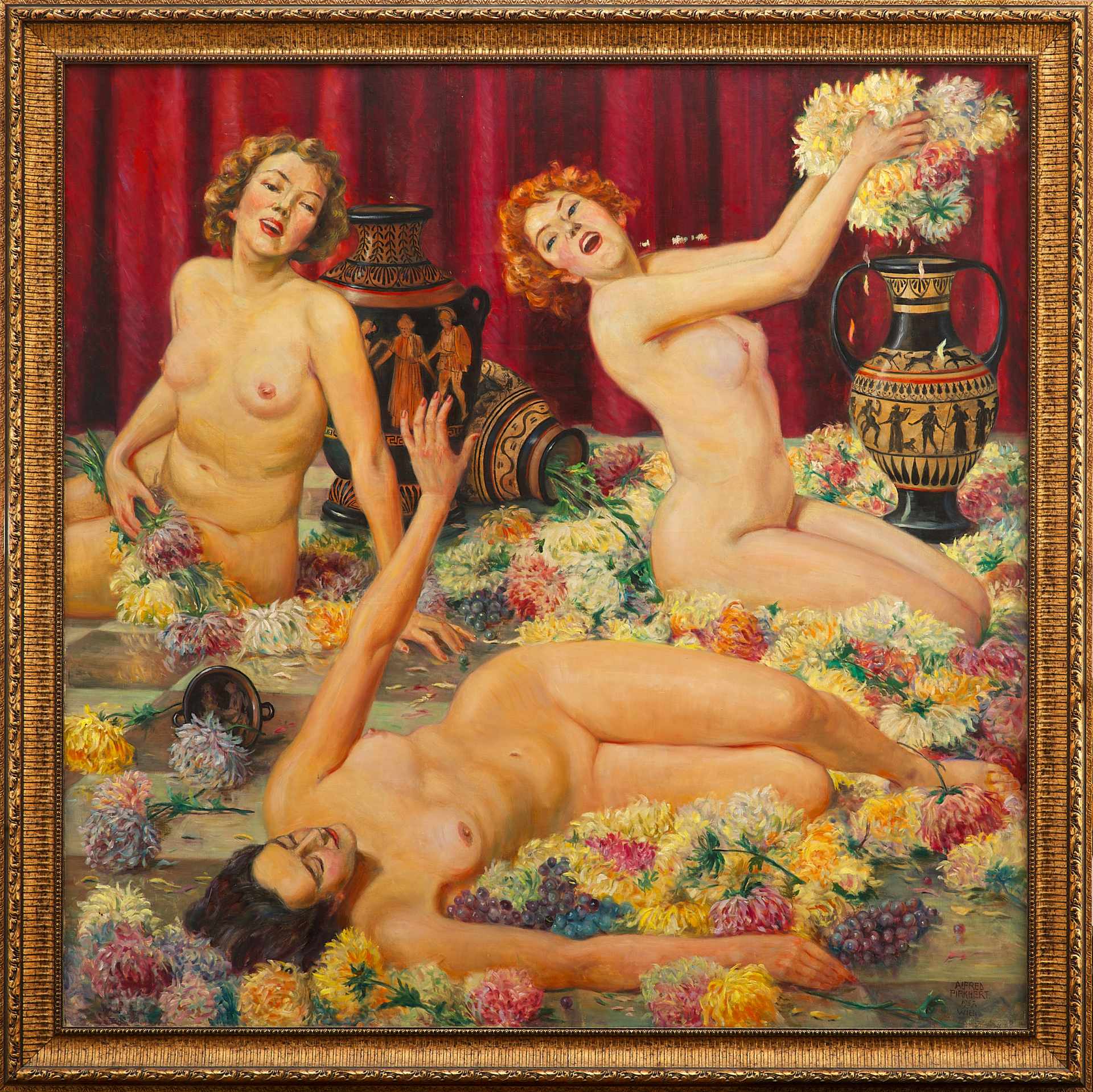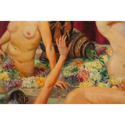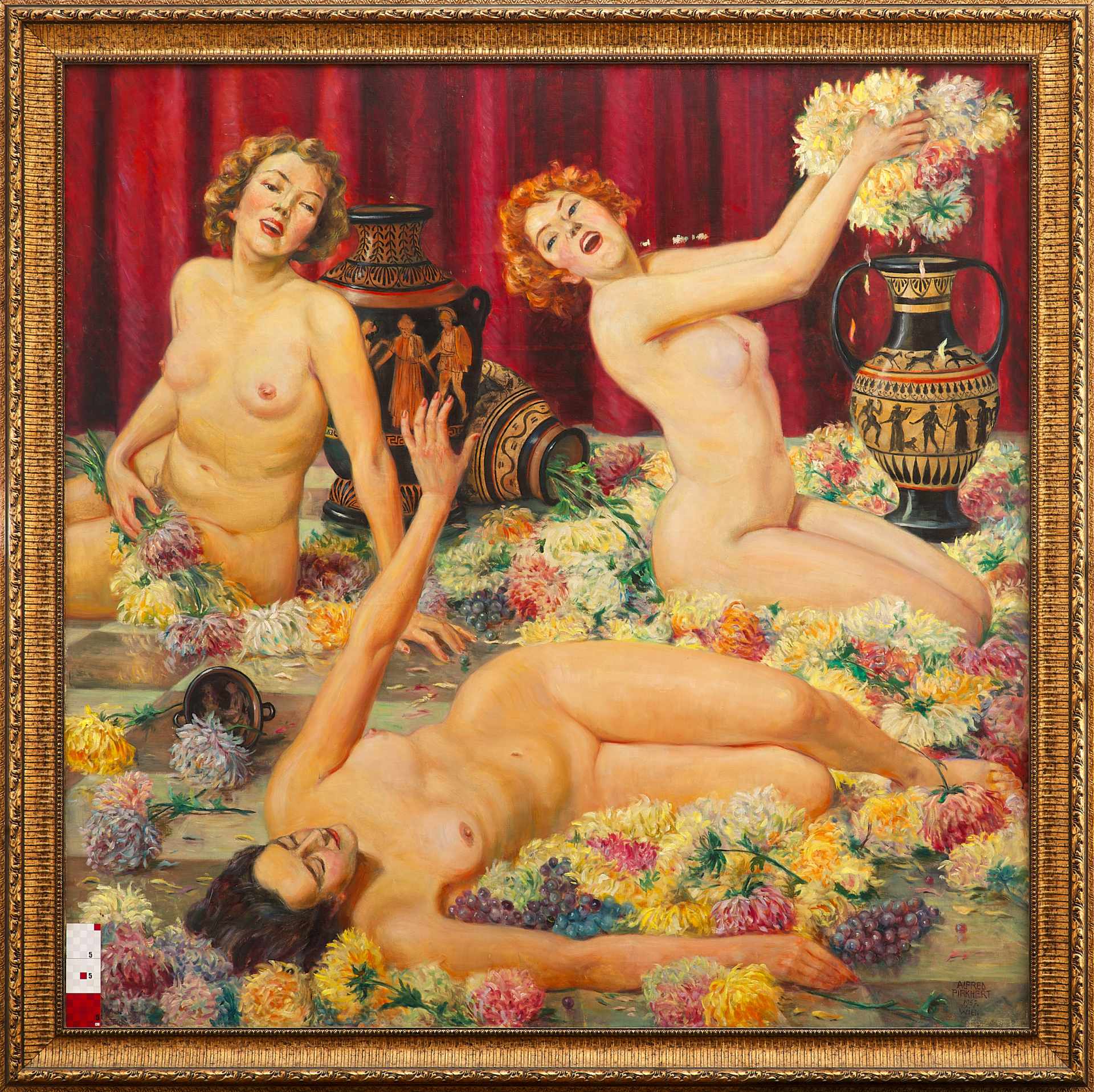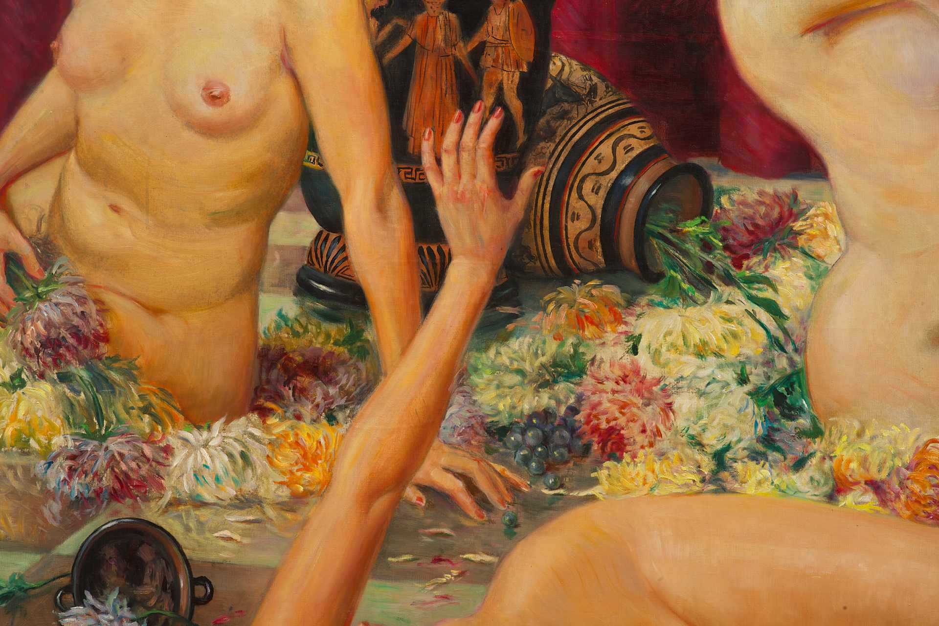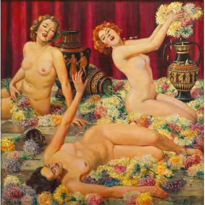 На картине изображена жизнерадостная сцена в духе античного праздника: три обнажённые женщины, символизирующие вакханок, танцуют и играют среди цветов и гроздей винограда на фоне амфор с античными орнаментами и багровой драпировки. Поза каждой фигуры наполнена экспрессией и театральностью: одна из женщин стоит с поднятыми руками и охапкой цветов, другая с лёгкой улыбкой тянется к зрителю, третья — полулежит на ковре из цветов. Вся сцена пронизана ощущением праздника, радости и эротизированной архаики.