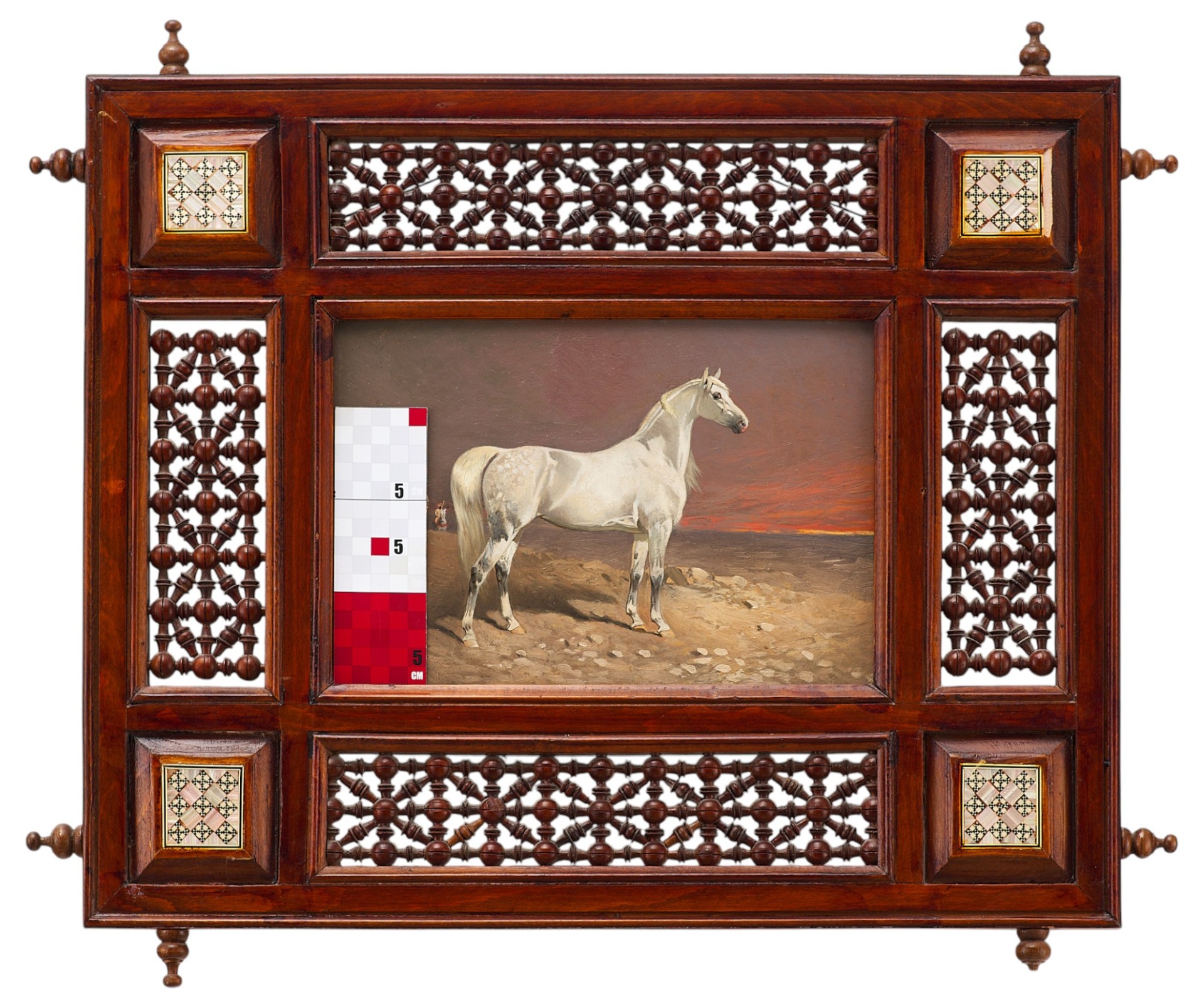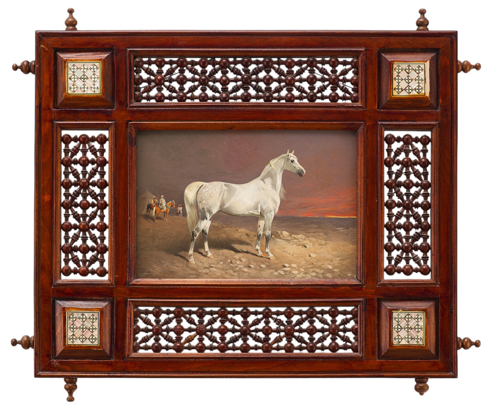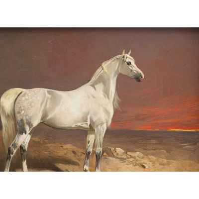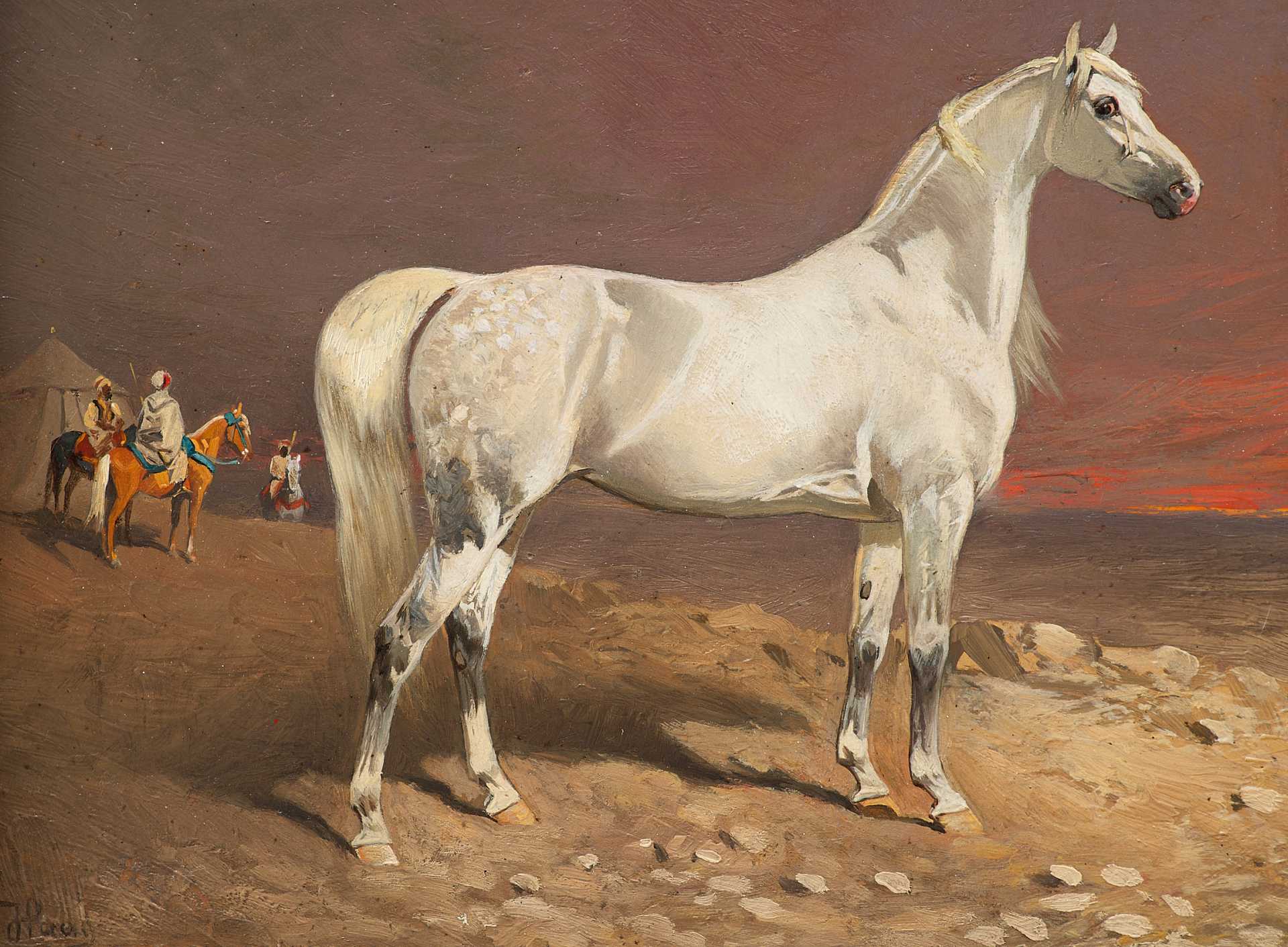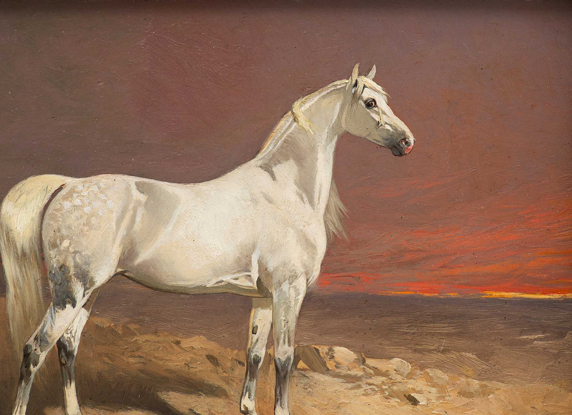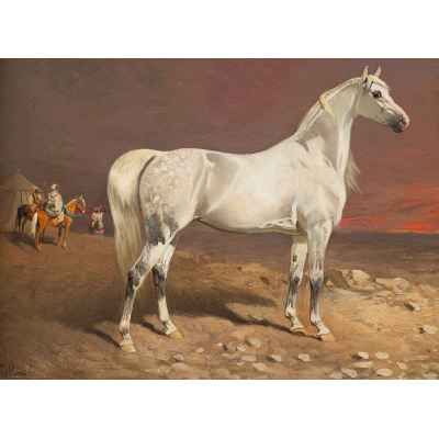 На картине изображён благородный арабский жеребец, стоящий на фоне степной местности при алом закате. Его белоснежная шерсть контрастирует с багряным небом, подчёркивая утончённую стать и породность животного. На заднем плане видны фигуры всадника и сопровождающих, а также шатёр — вероятно, сцена отсылает к восточному военному или парадному лагерю, типичному для ориенталистской живописи XIX века.