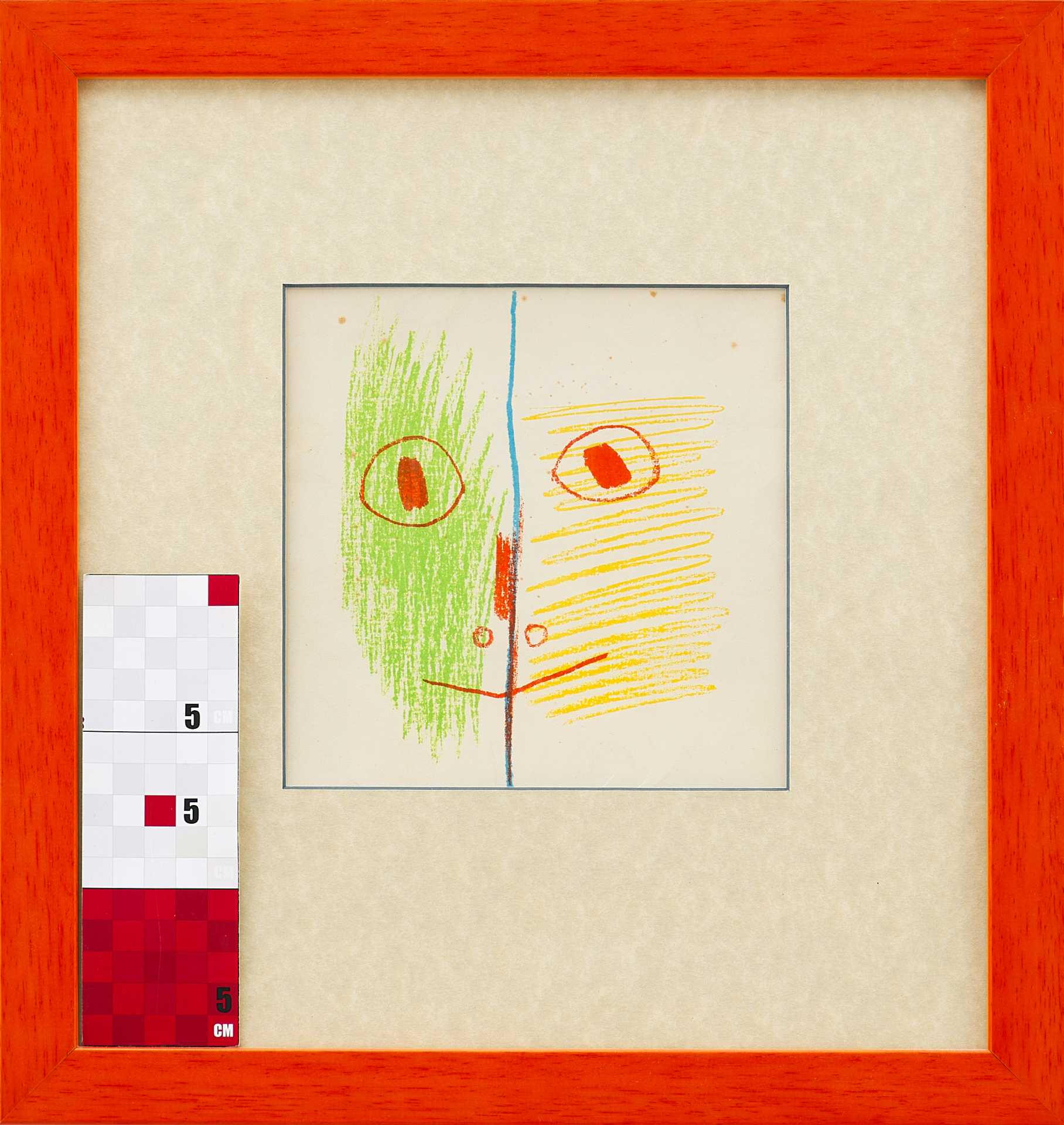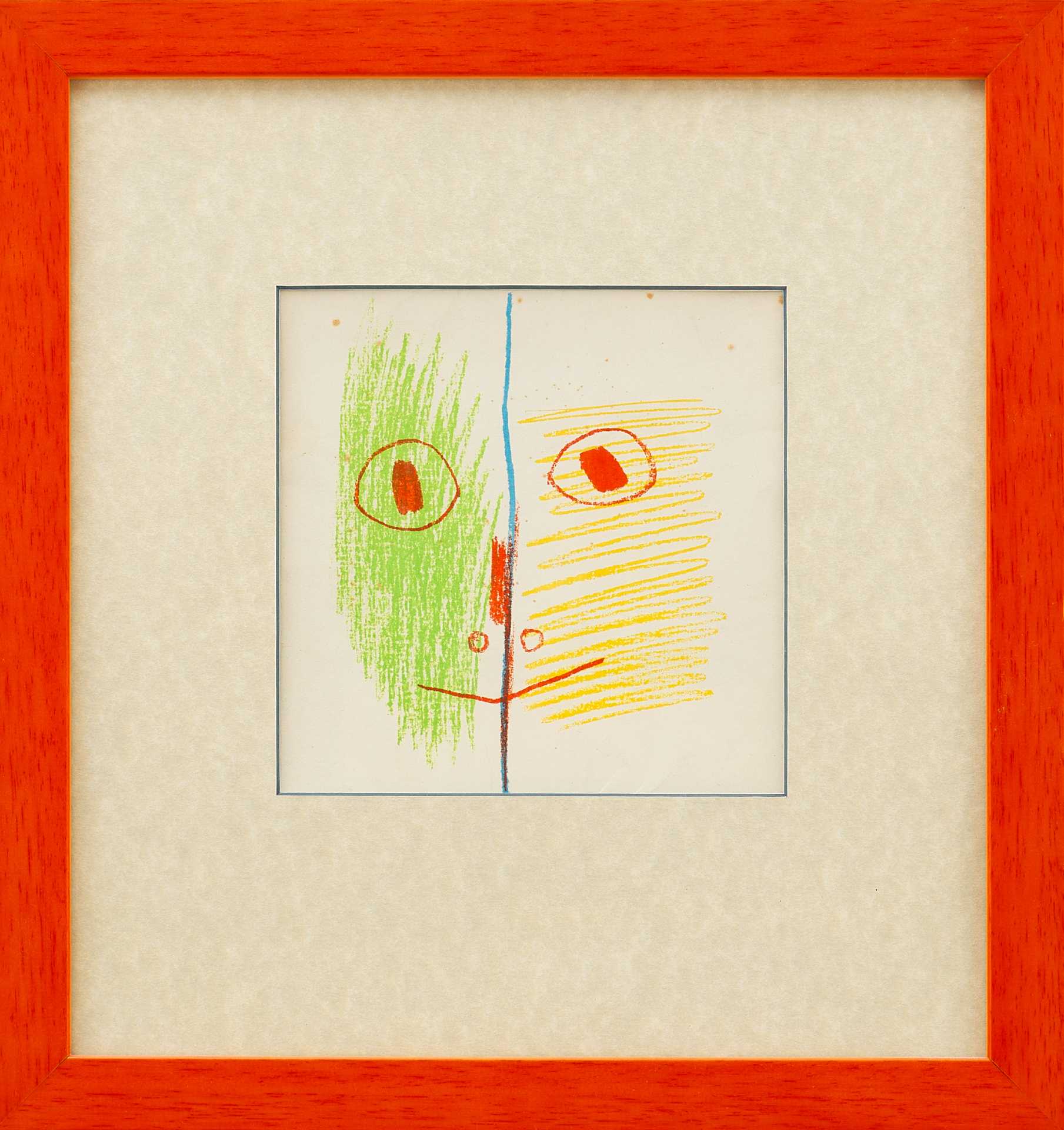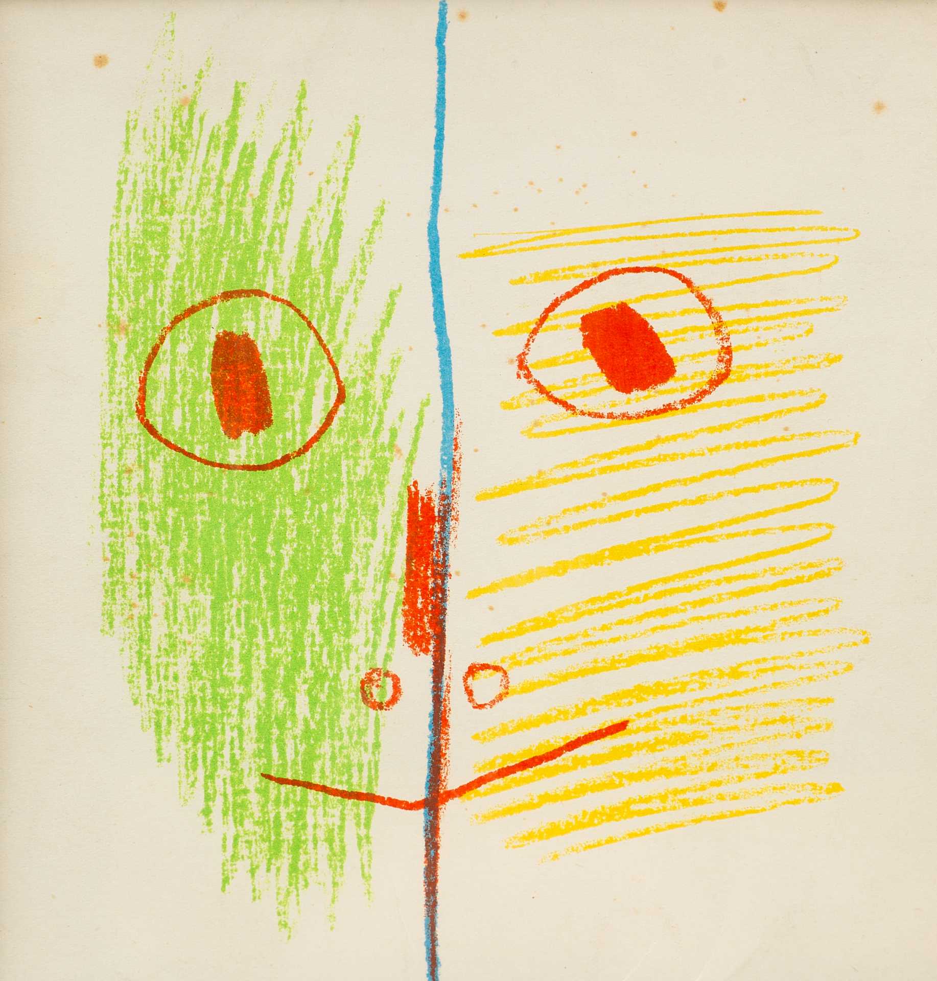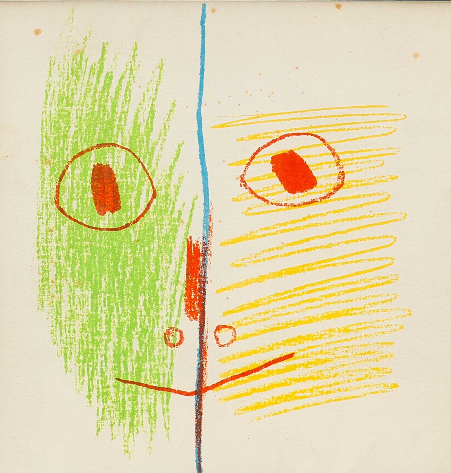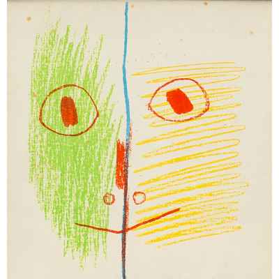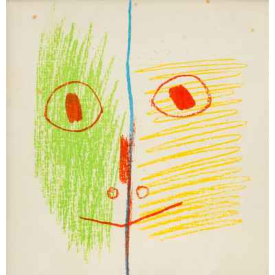 На изображении представлена авторская цветная литография «Лицо», созданная Пабло Пикассо в марте 1957 года. Работа отличается предельной лаконичностью и выразительностью — лицо разделено на две половины с помощью вертикальной линии, левая часть выполнена в зелёных, а правая — в жёлтых тонах. Глазные зрачки смещены, создавая эффект наивной игры, а минималистичная линия рта придаёт лицу характерное для Пикассо сочетание иронии и абстракции. Простая цветовая гамма и «детская» форма изображения отсылают к позднему периоду творчества мастера, когда он активно исследовал символический язык и эмоциональную выразительность линий.