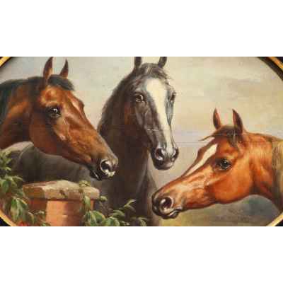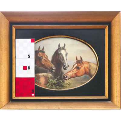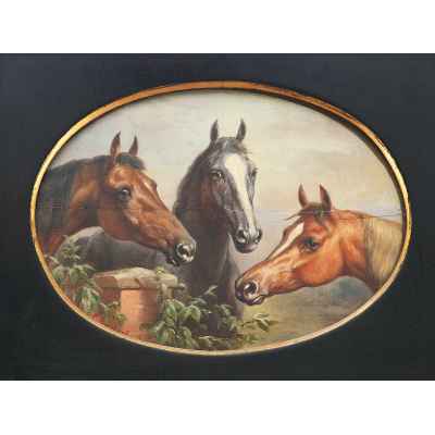 На картине «Лошади» изображены головы трёх лошадей, реалистично выписанных в овале, с ясным вниманием к породным чертам и выражению характеров. Композиция выдержана в строгом горизонтальном формате, а фигуры животных размещены на нейтральном фоне, где виднеется часть кирпичной кладки и лёгкий пейзаж. Работа выполнена в технике масляной живописи по дереву и отличается утончённой академической точностью в изображении фактуры шерсти, мускулатуры и анатомии животных.