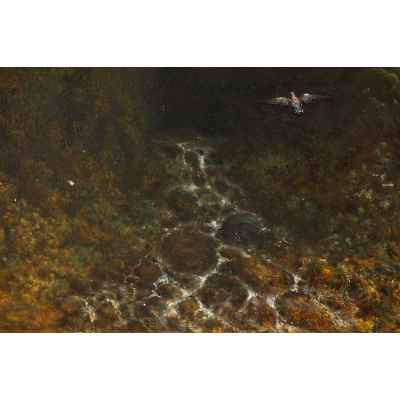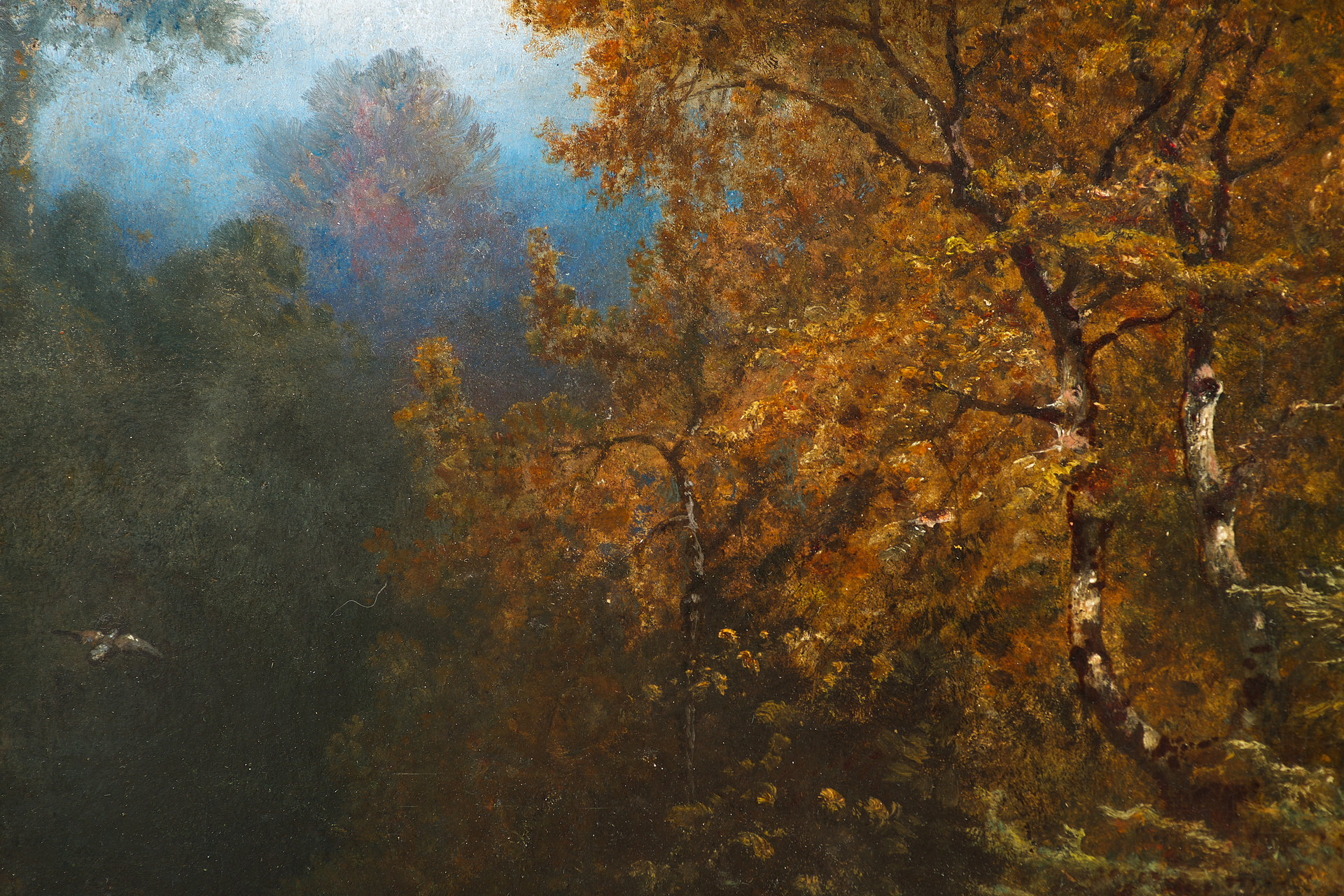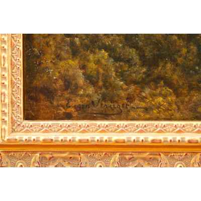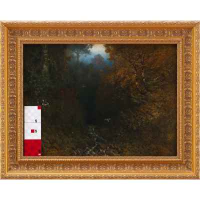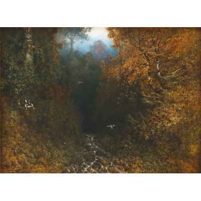 Картина «Лесной ручей» представляет собой выразительный голландский пейзаж, написанный в XIX веке в подражание художественным традициям голландской живописи XVII столетия. Центральным элементом композиции является лесной ручей, теряющийся в густой чаще, окутанной полумраком. Из листвы вырываются лучи света, а в воздухе можно различить силуэты летящих птиц, что придаёт сцене ощущение движения и живой природы. Цветовая палитра выдержана в тёплых, насыщенных осенних тонах, с преобладанием охры, коричневого и зелёного.