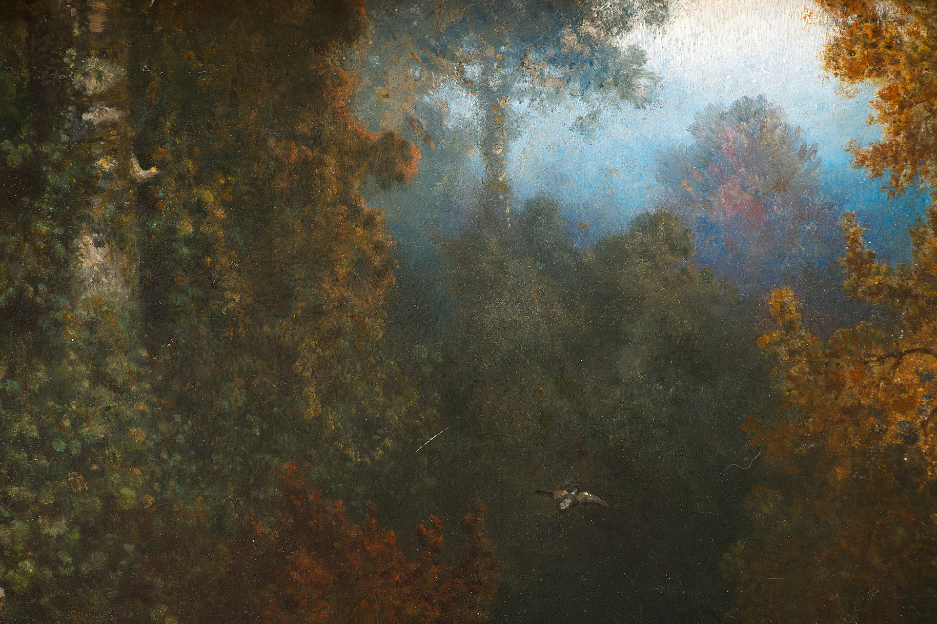 Пейзаж выполнен с высокой тщательностью и тонким пониманием структуры природы — от проработки листвы до игры света и тени в глубине леса. Выбор небольшого формата (35 × 46,8 см) и использование деревянной основы подчёркивают камерный характер картины и соответствуют типичной практике голландских и фламандских мастеров.