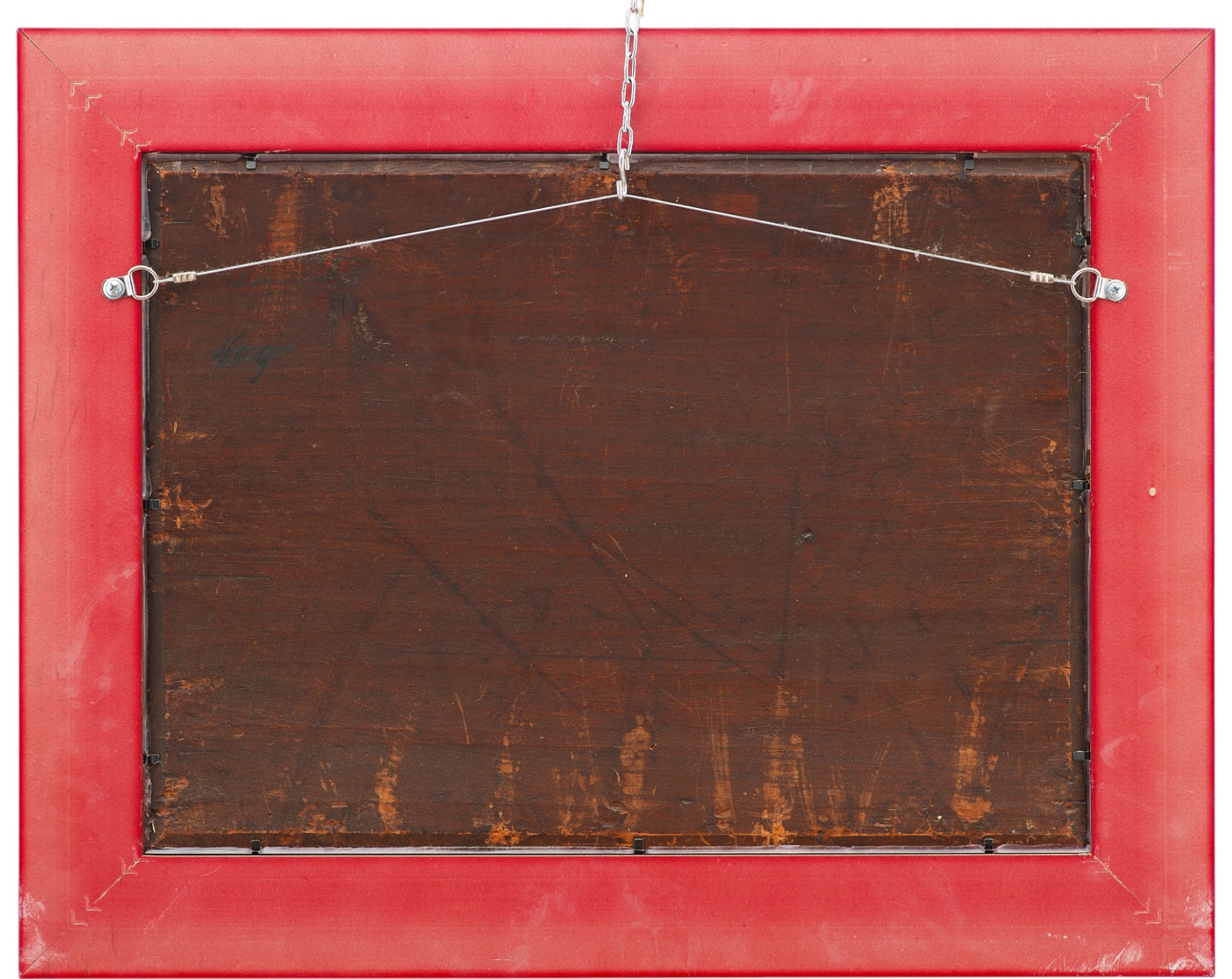 Работа написана неизвестным голландским художником и выполнена в технике масляной живописи по дереву, что типично для произведений, ориентированных на старых мастеров. Подпись «Eugen Viriiger» в нижнем левом углу является старой и лежит в тесте красочного слоя, что подтверждает её подлинность и указывает на вероятное авторство или принадлежность к художественному кругу.