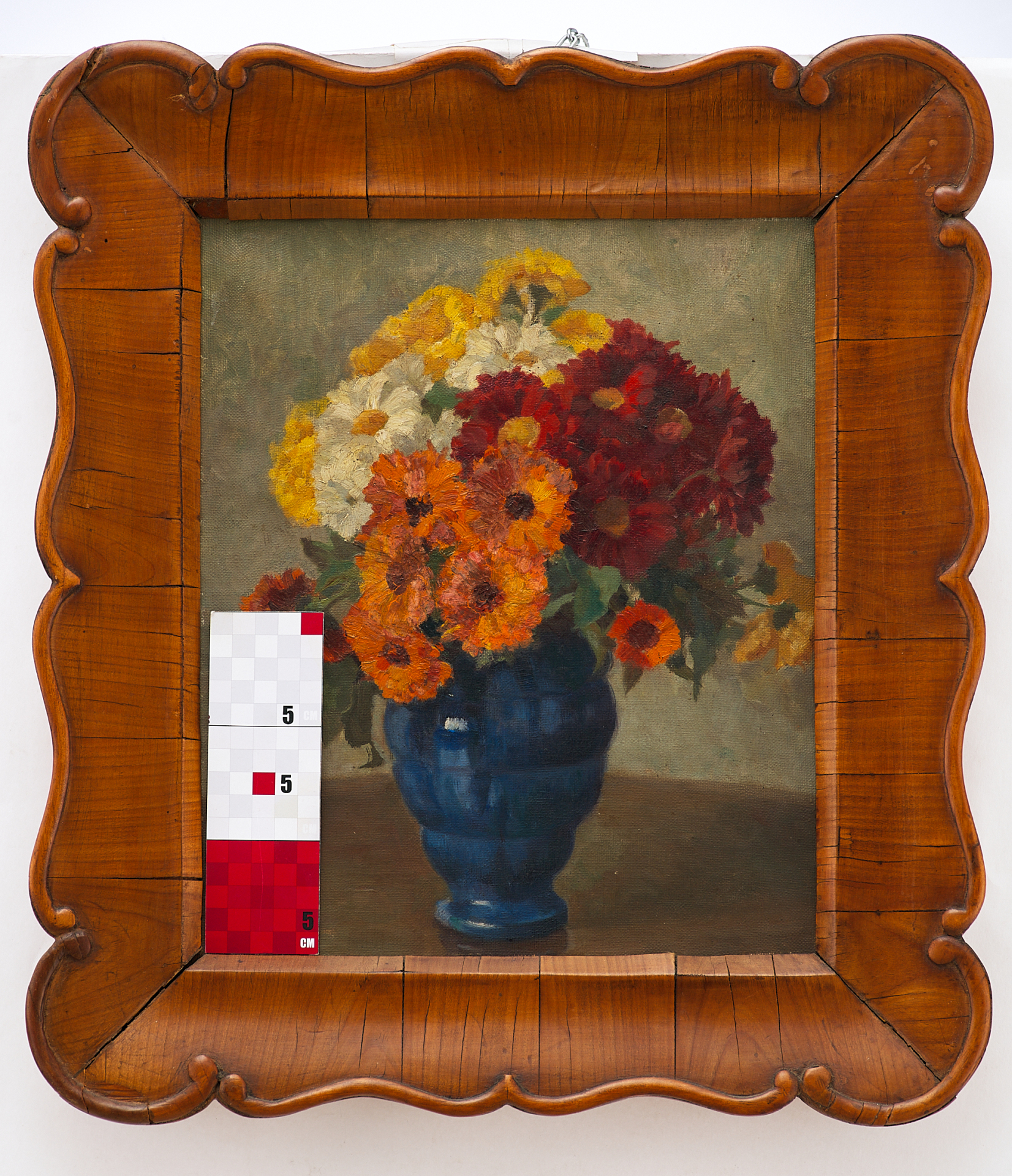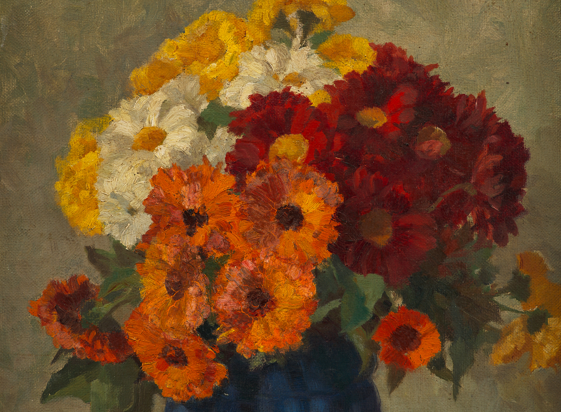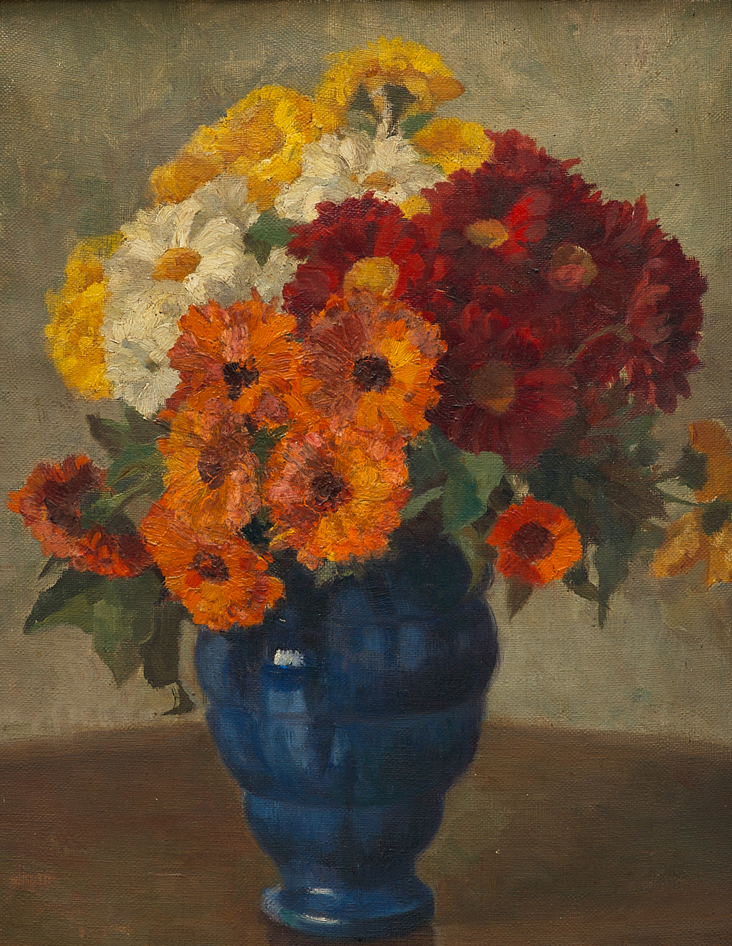 Изображен натюрморт с цветами: на темной поверхности стола в синей вазе пышный букет свежих хризантем. Цветы разных оттенков: белые желтые, оранжевые, ярко-красные. Снизу букет окаймлен зелеными листочками.