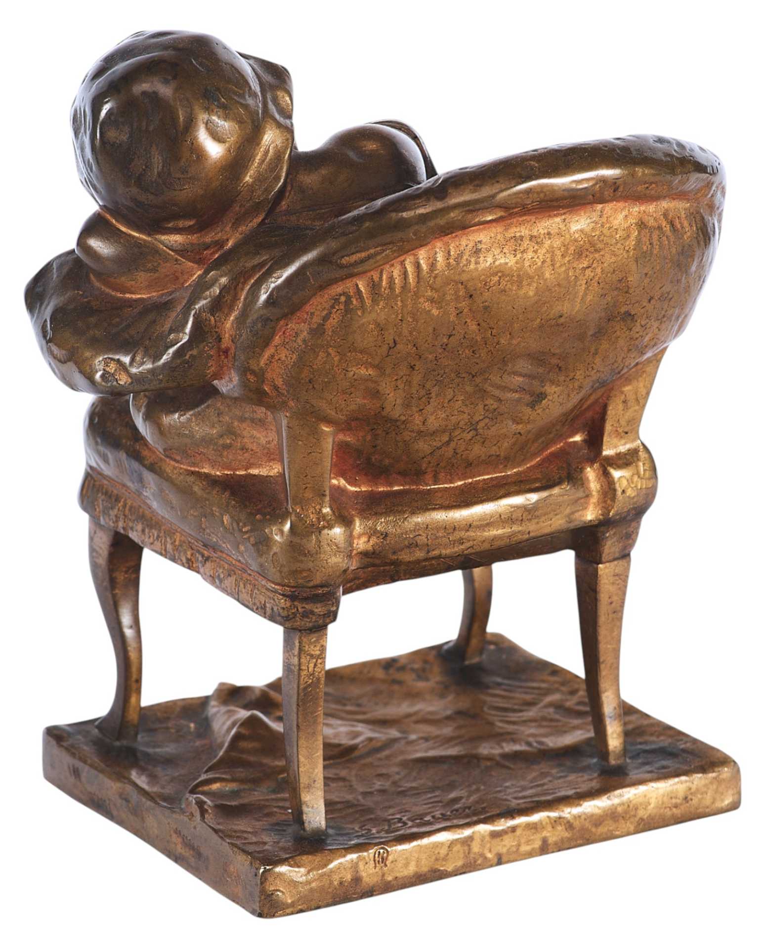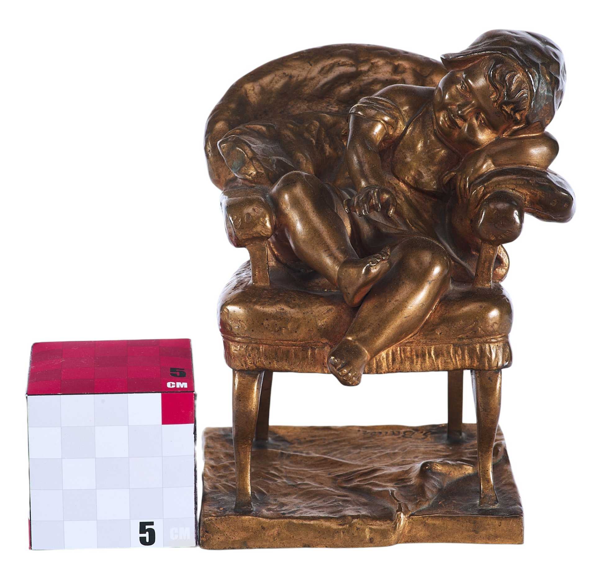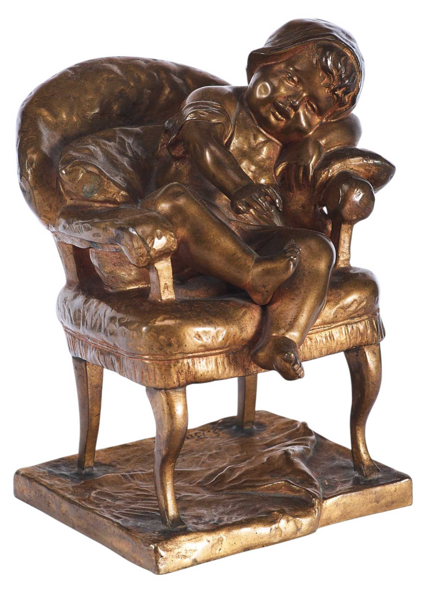 На невысокой прямоугольной подставке креслице, на котором спит маленькая девочка в чепчике. На подлокотник она положила левую руку и склонила на неё кудрявую головку. Во сне девочка улыбается, мяНа подставке авторская подпись: “S. Bauer”.