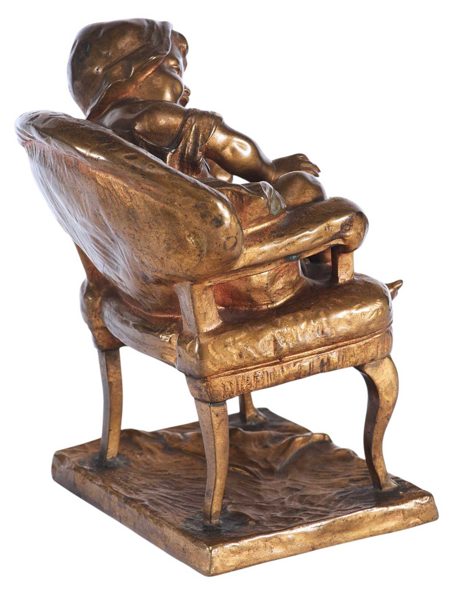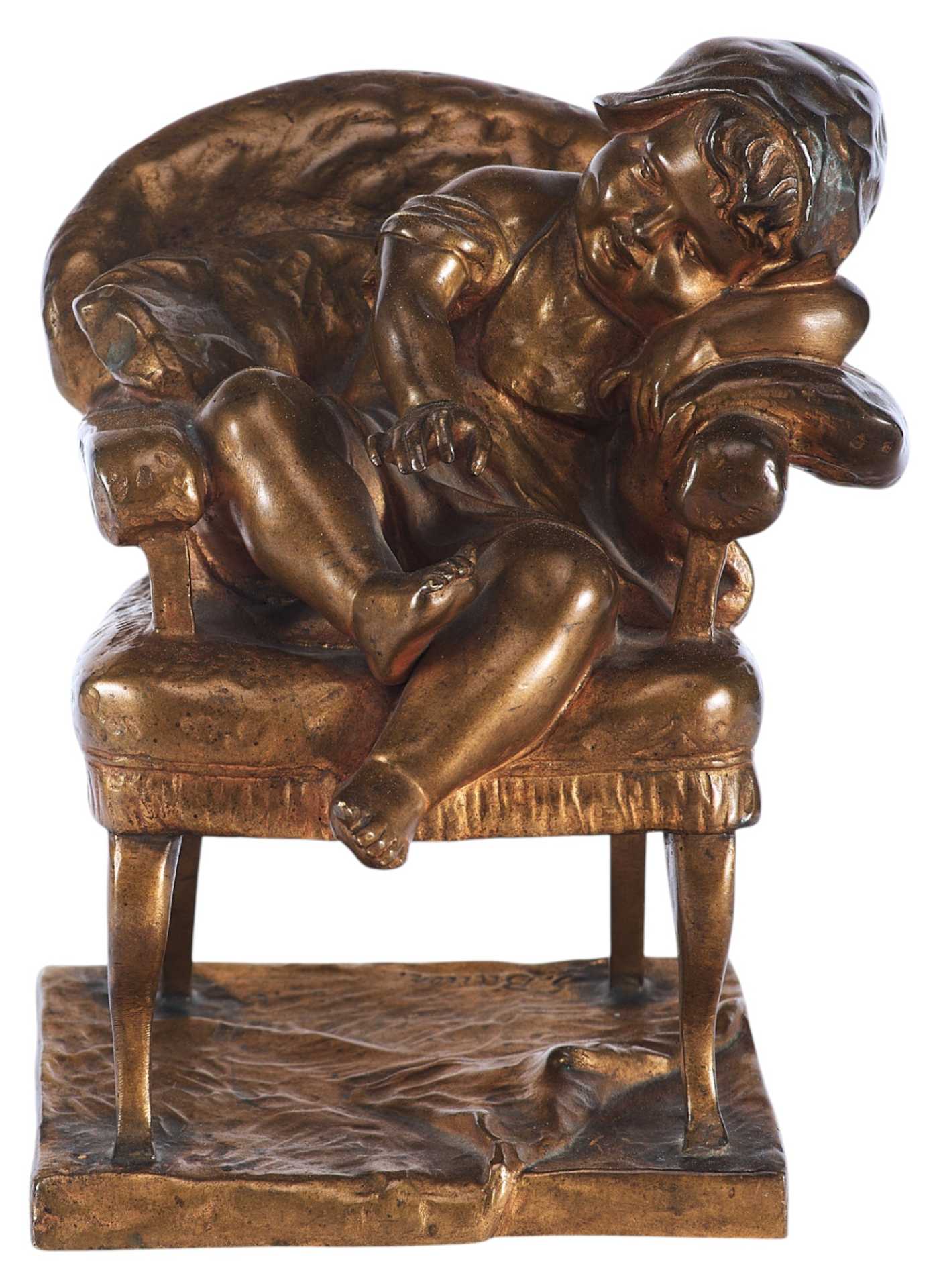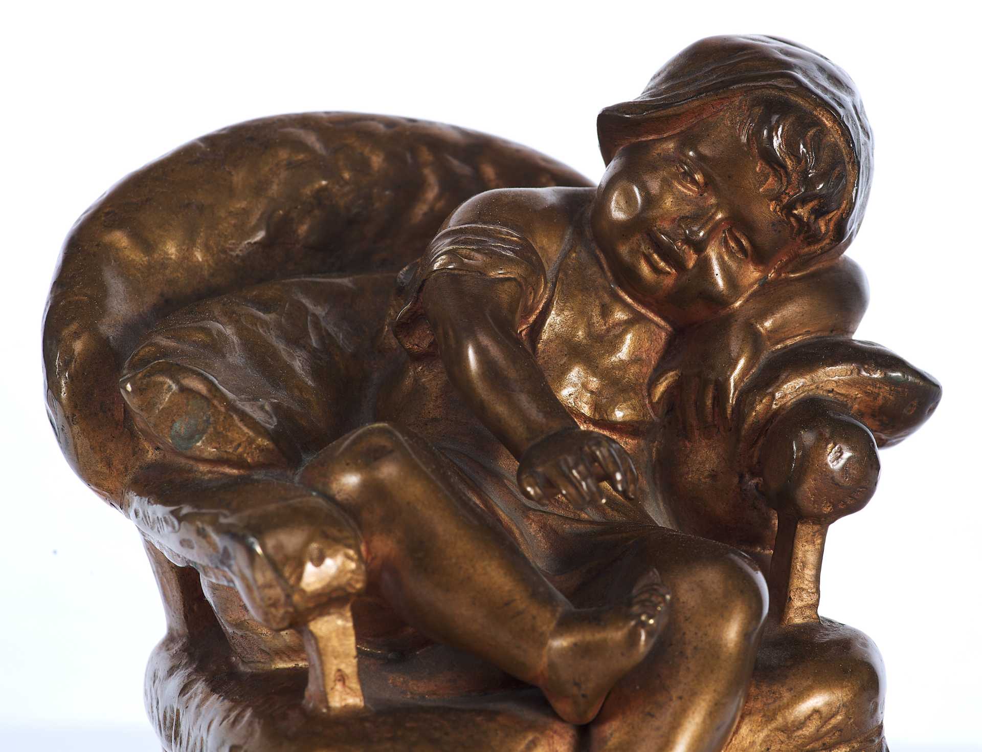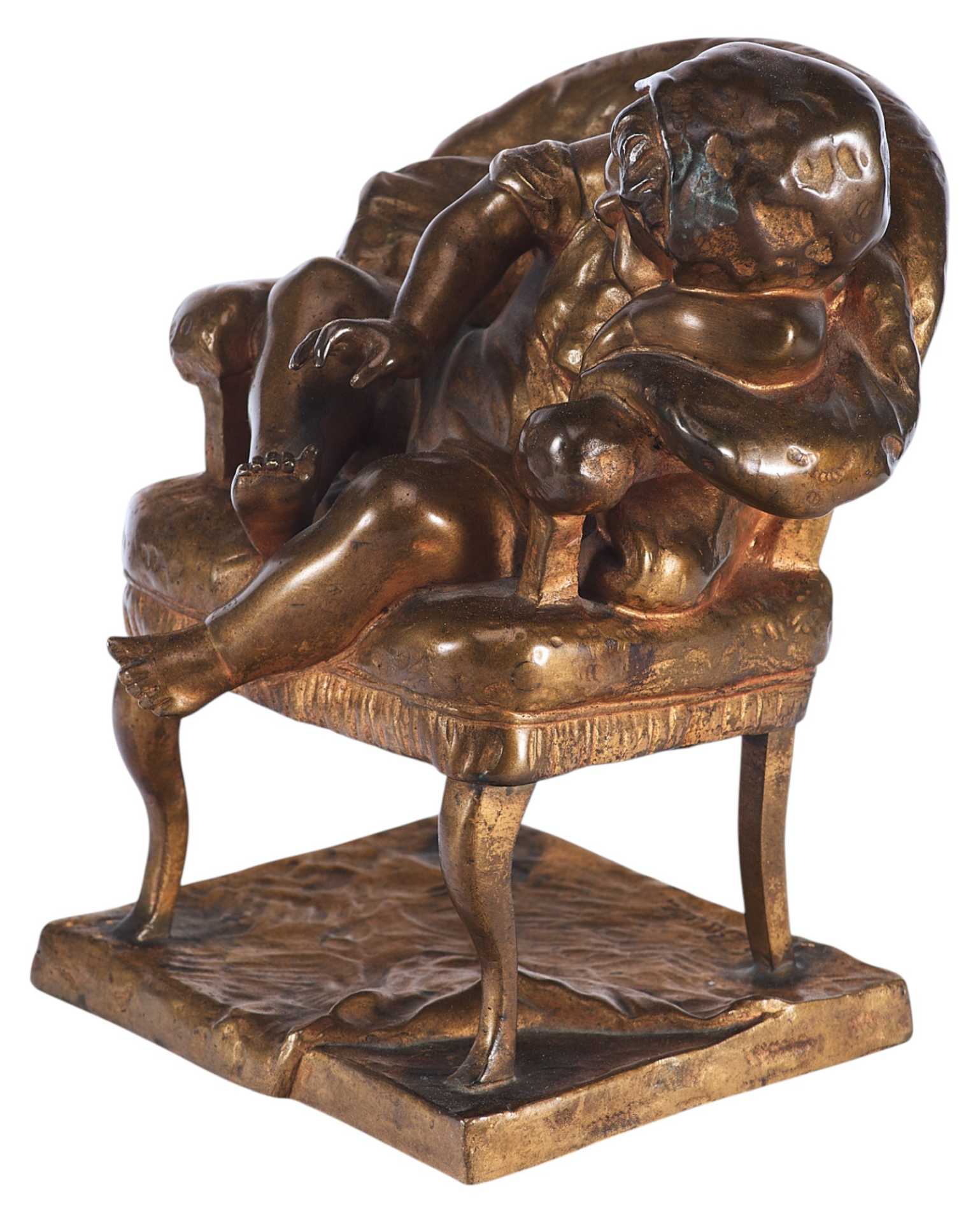 На невысокой прямоугольной подставке креслице, на котором спит маленькая девочка в чепчике. На подлокотник она положила левую руку и склонила на неё кудрявую головку. Во сне девочка улыбается, мяНа подставке авторская подпись: “S. Bauer”.