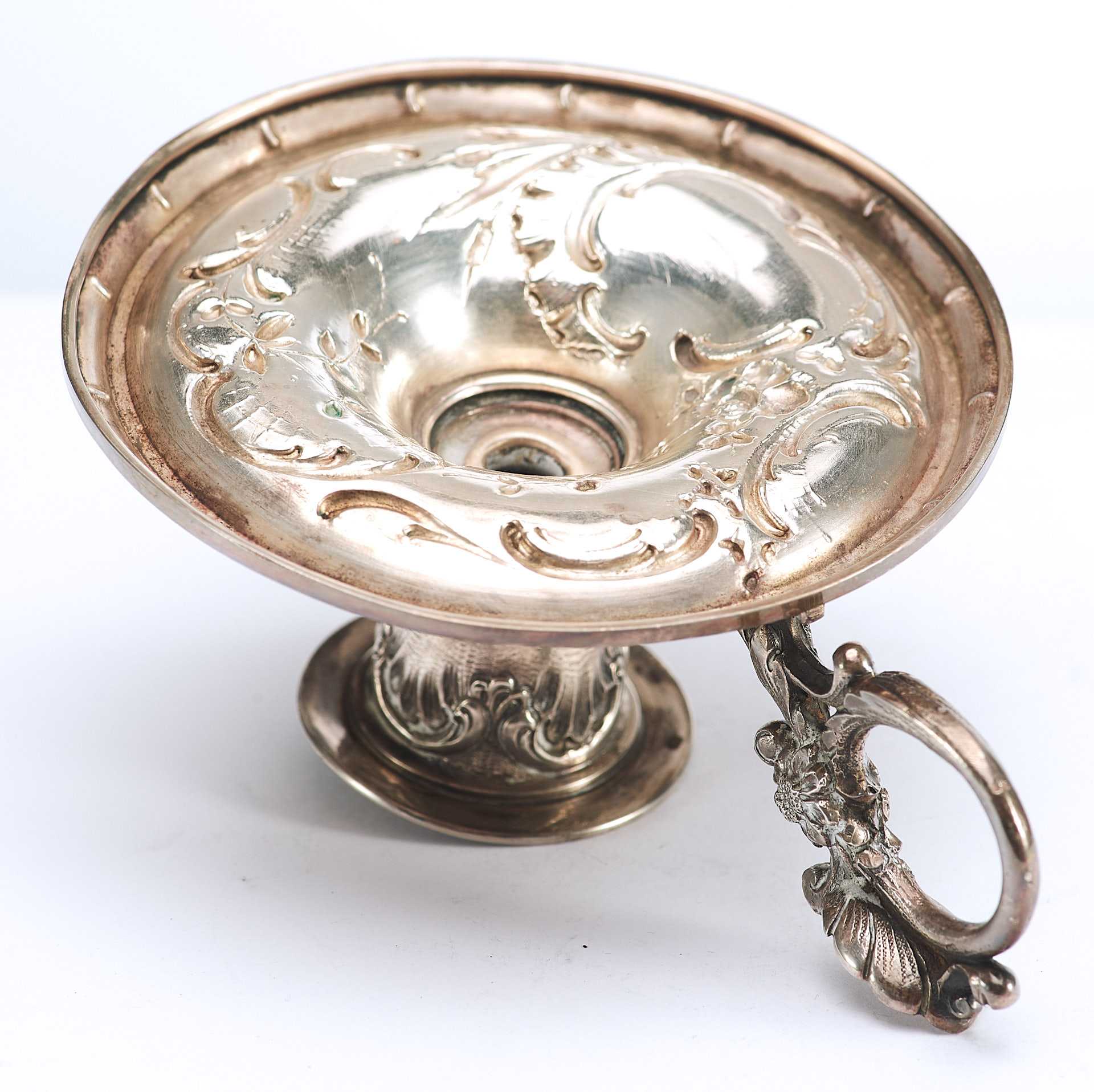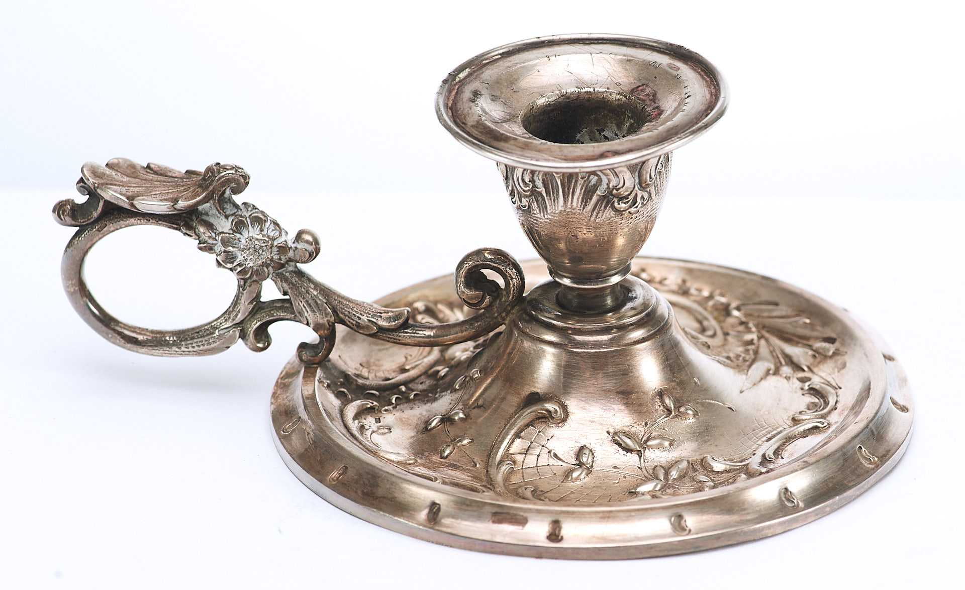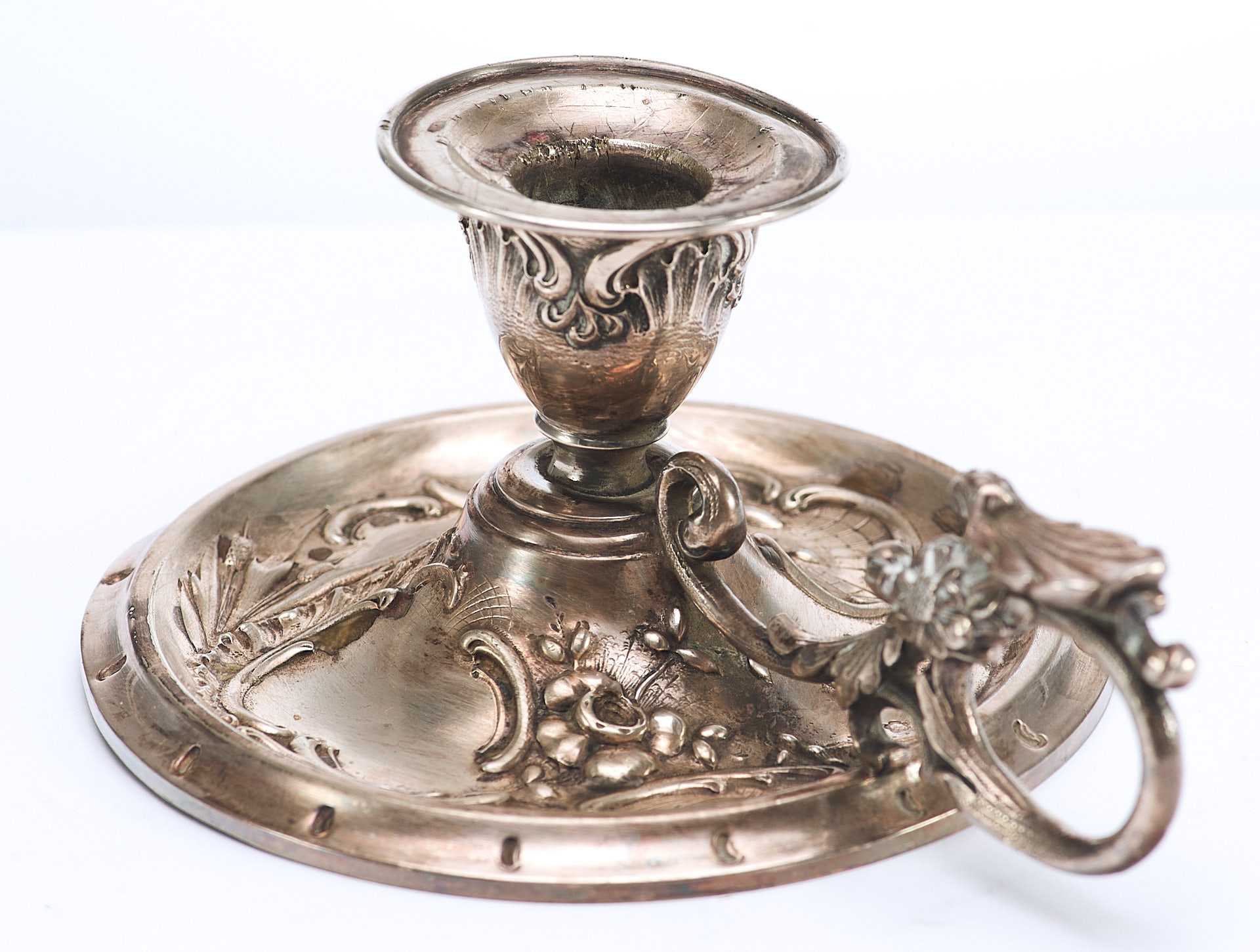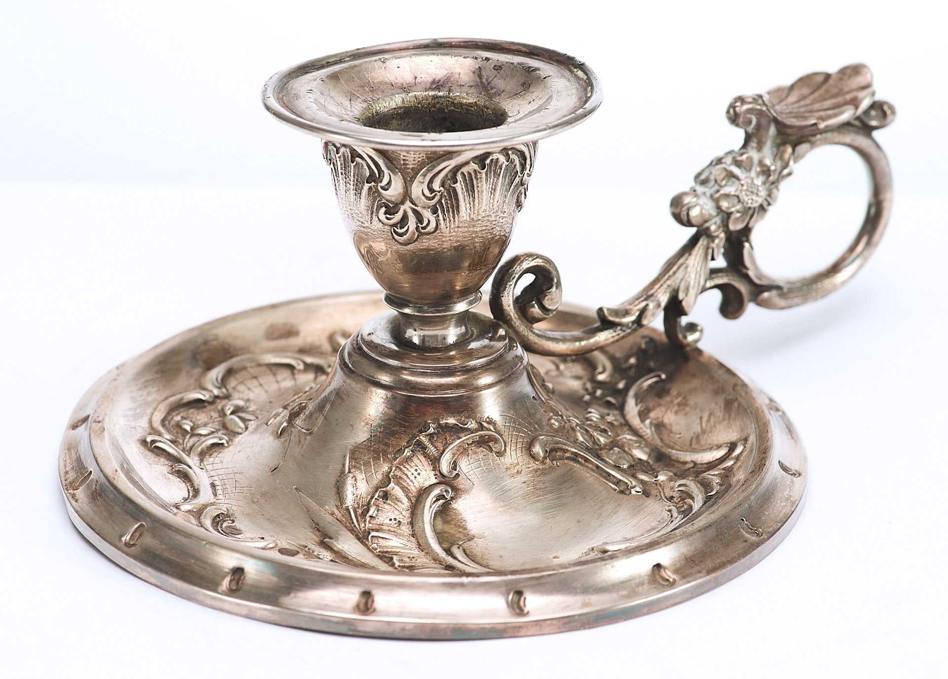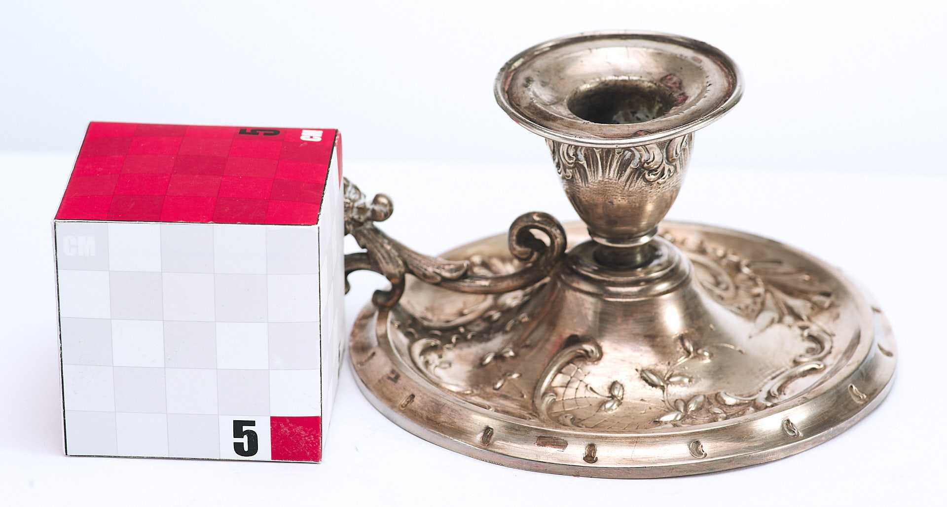 Представлен подсвечник с ручкой и кольцом для пальца. Поверхность подсвечника украшена орнаментальными элементами в стиле рококо. Форма подсвечника соответствует периоду XIX в.