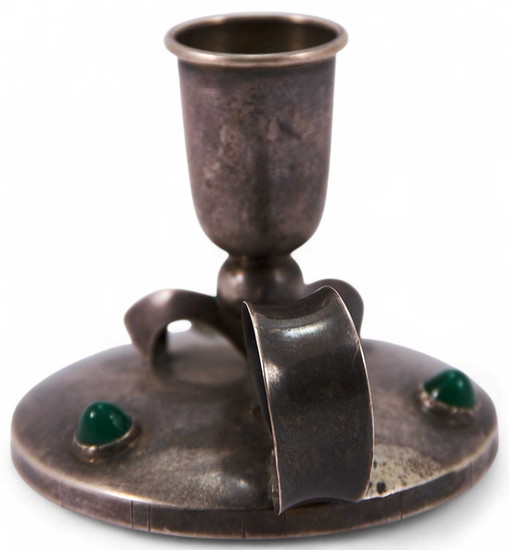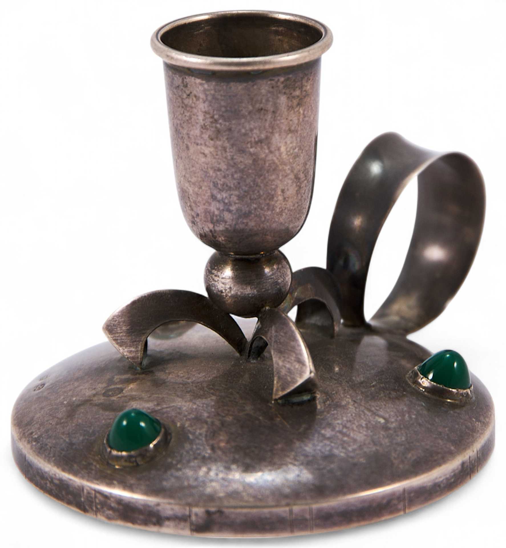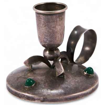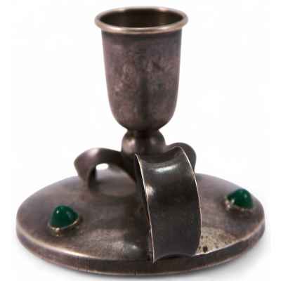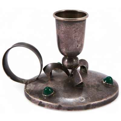 Представлен серебряный переносной подсвечник, форма и художественного оформление которого соответствуют стилистике национального ювелирного искусства в духе средневековья.