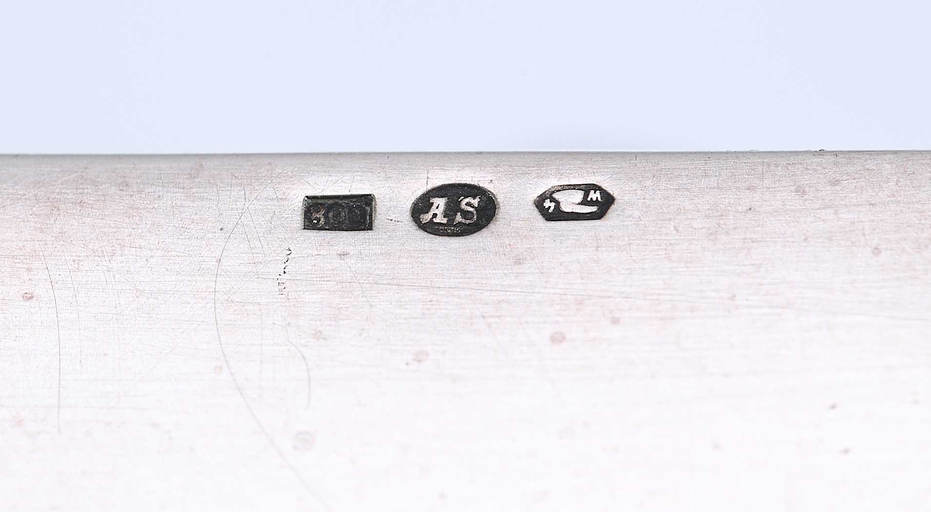 1. Изображение тукана, обращенного влево с пробирными обозначениями «4 W» - австрийское клеймо для изделий из серебра с 1922 года. Буква «W» указывает место производства - Вена.