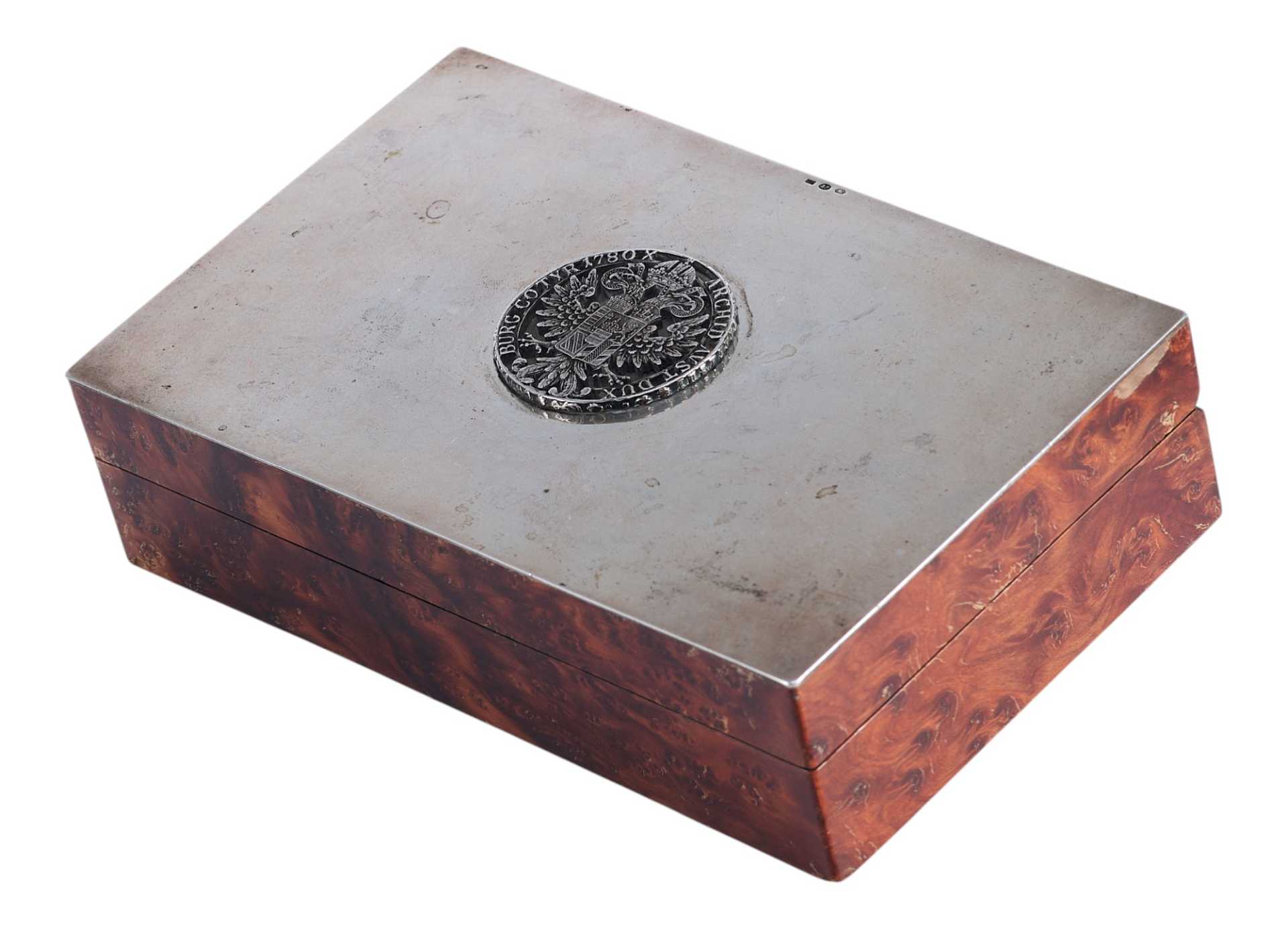Коробка для сигар с талером Марии Терезии серебро 800 пр. Австрия после 1922 г. 10x16 см. Вена, Австрия после 1922 г