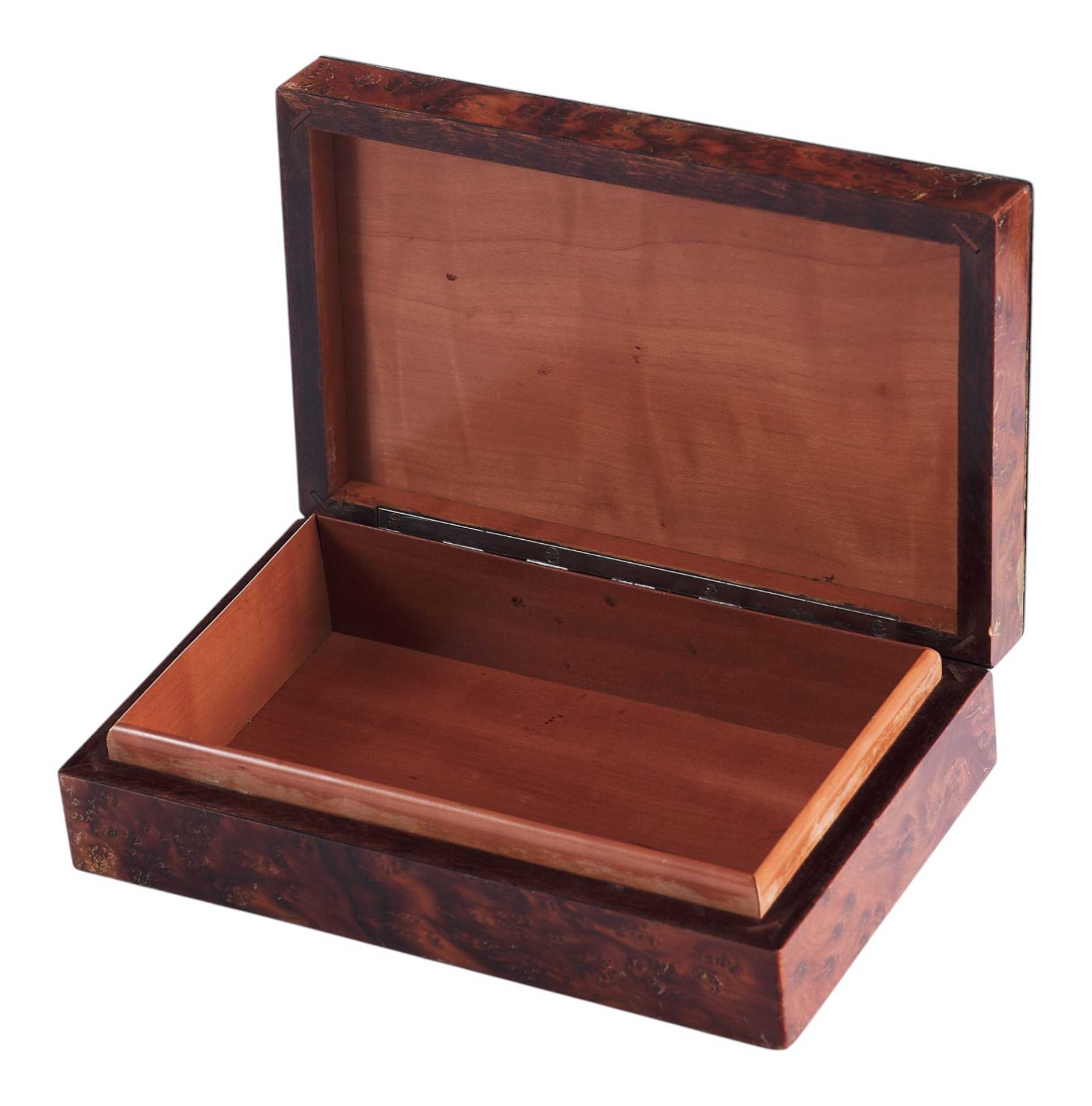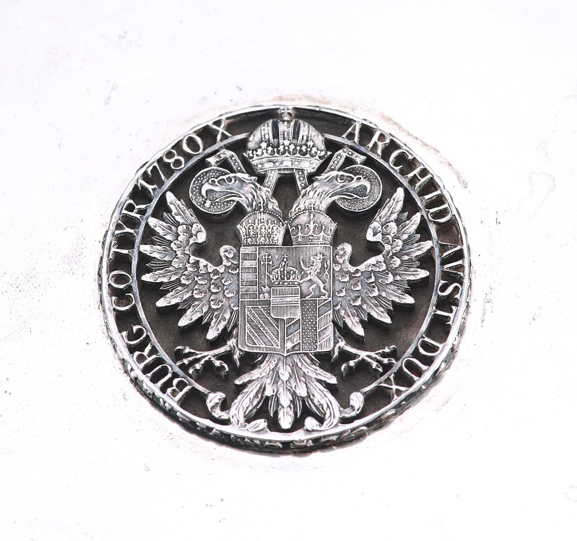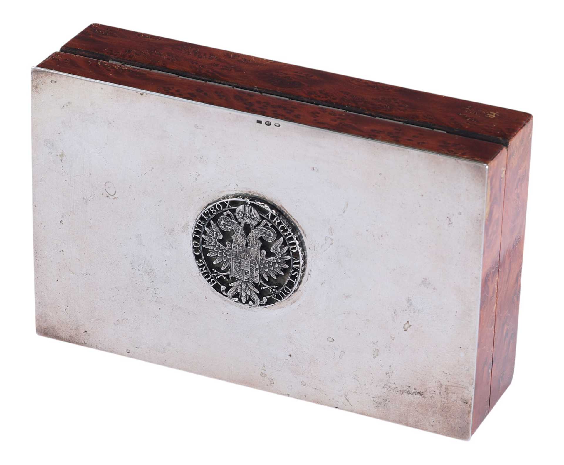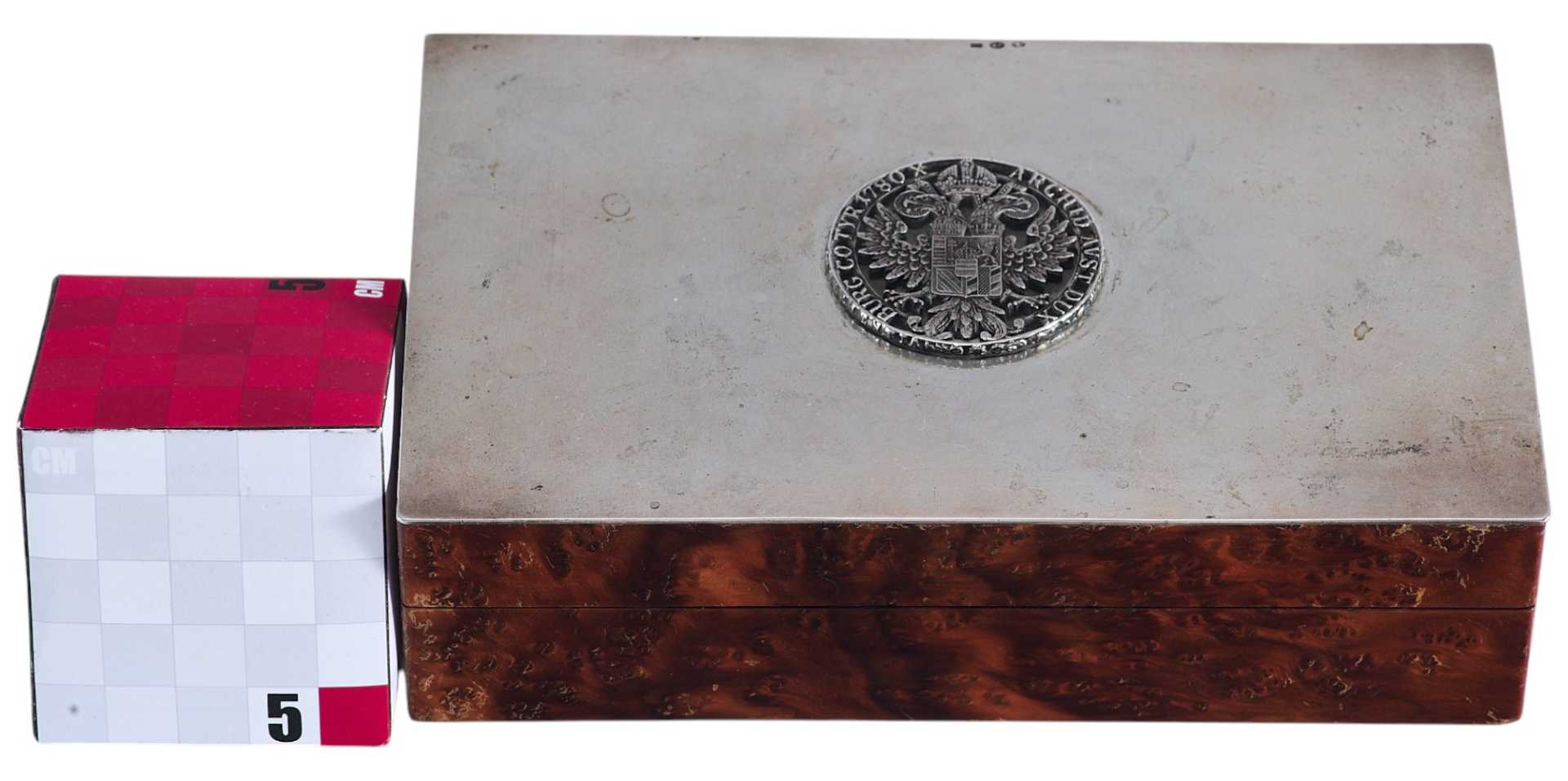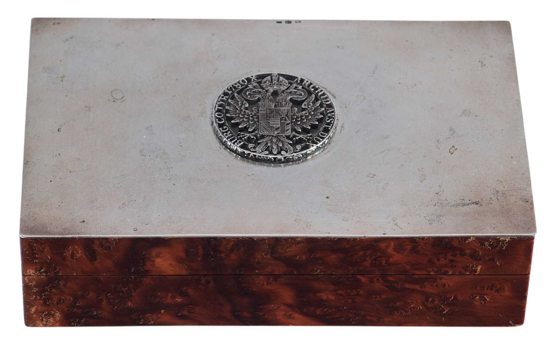 Представлена коробка для сигар прямоугольной формы с серебряной накладной на крышке. В центре накладки монтировано объемное изображение талера Марии Терезии, появившегося в империи Габсбургов в 1780 г. Талер Марии Терезии — серебряная монета, разновидность конвенционного талера, активно использовавшаяся в мировой торговле (см. торговая монета) почти сразу после начала чеканки в 1741 году. Монета получила своё название по имени императрицы Марии Терезии, которая правила Австрией, Венгрией и Богемией в период с 1740 по 1780 год.