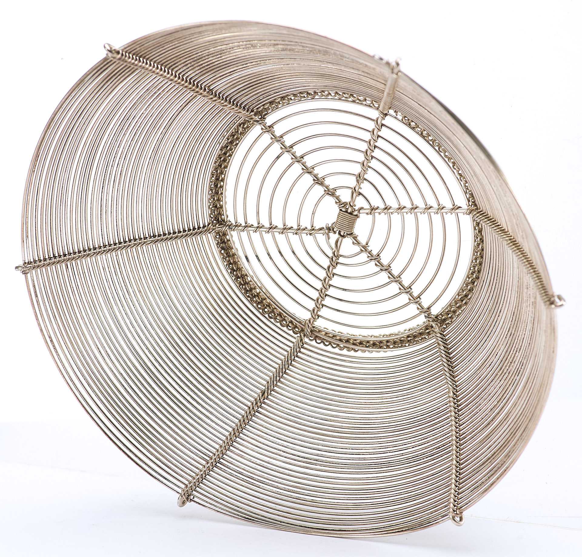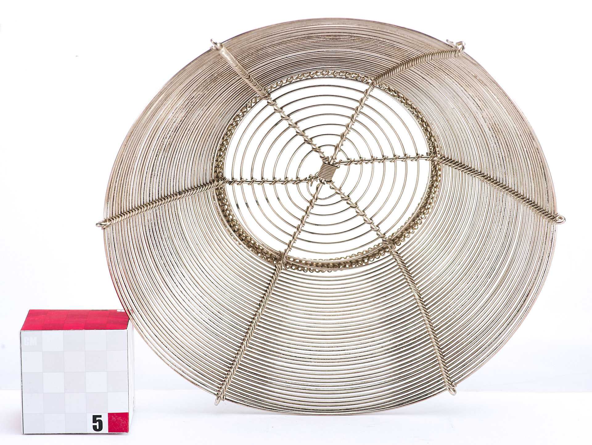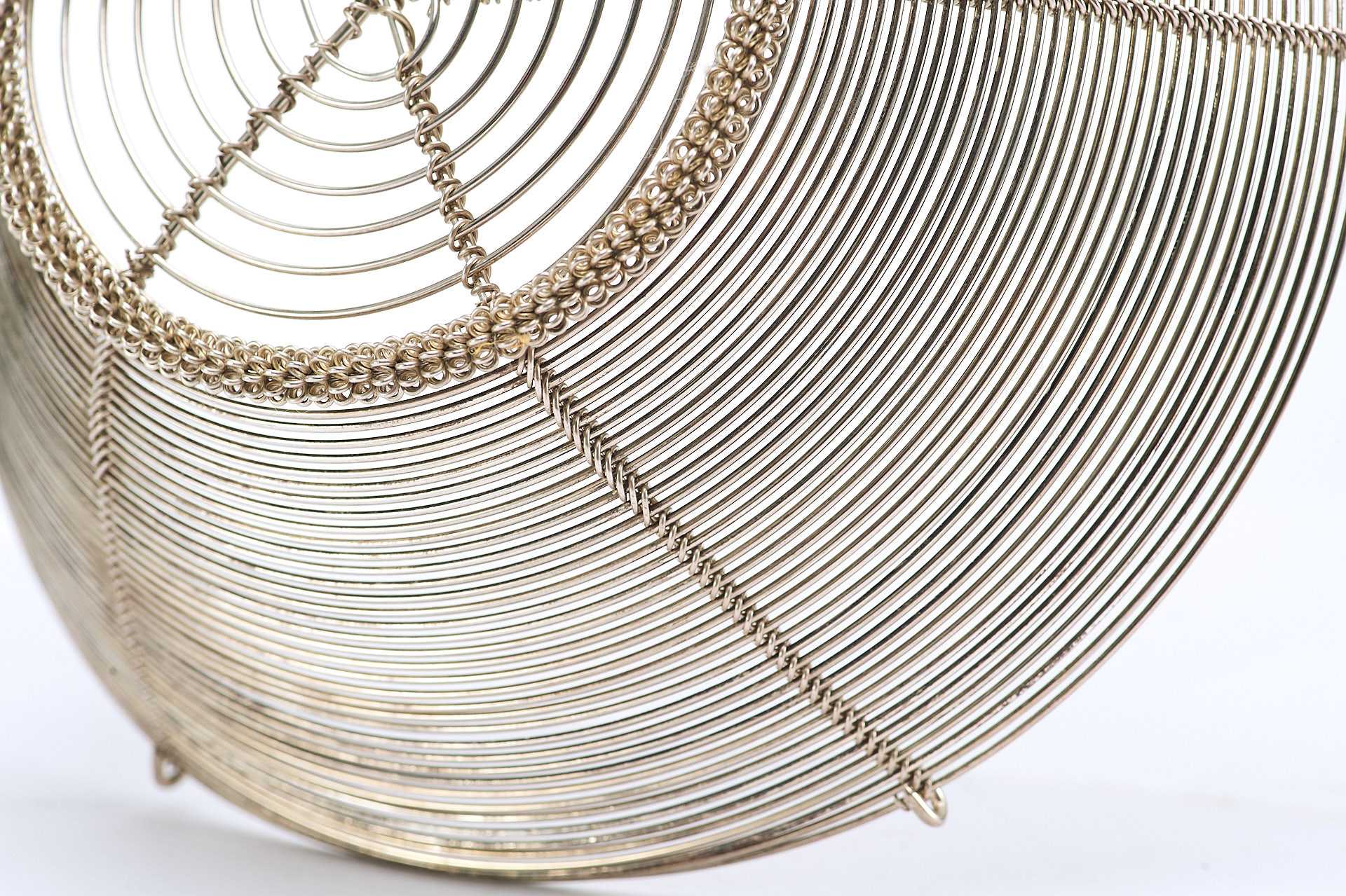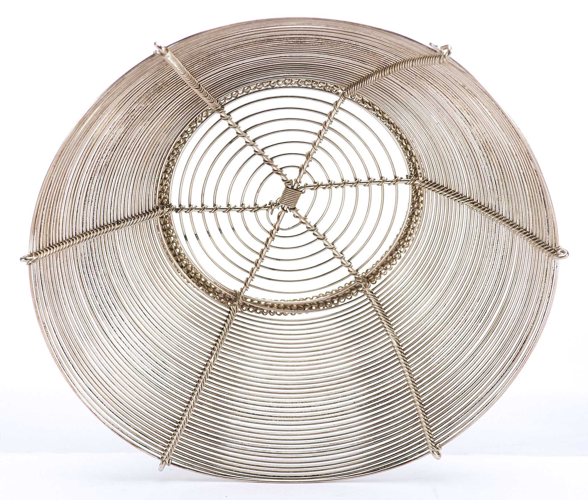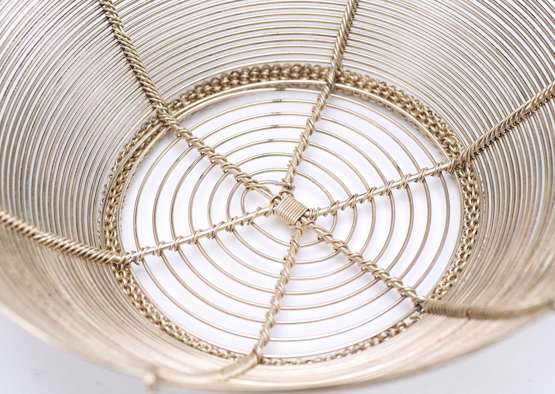 Представлена сухарница сделанная из серебряной проволоки средней толщины. Сухарница - ваза или корзинка для подачи хлева, печенья, сухарей, выпечки.