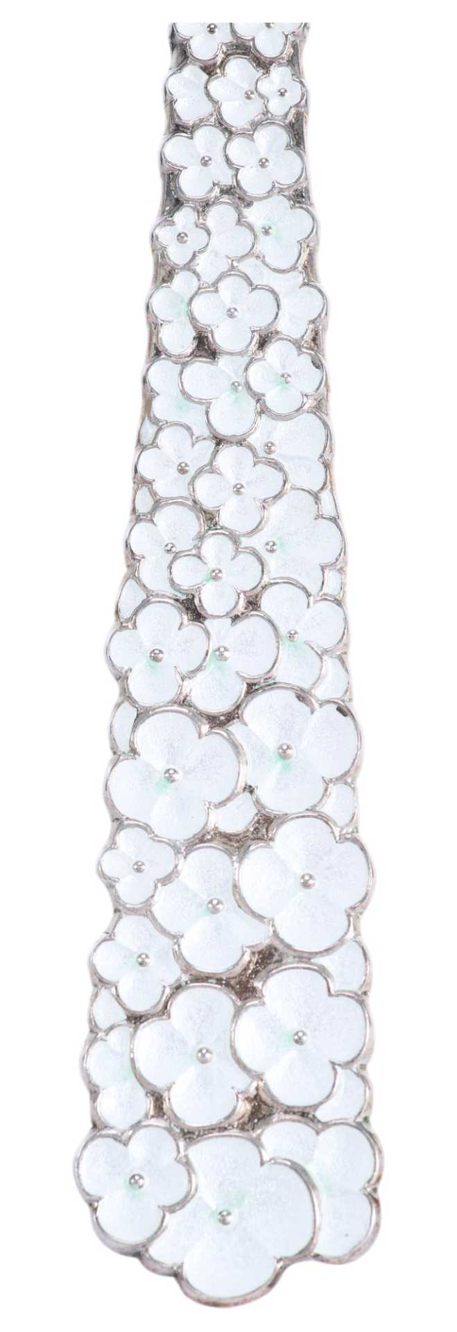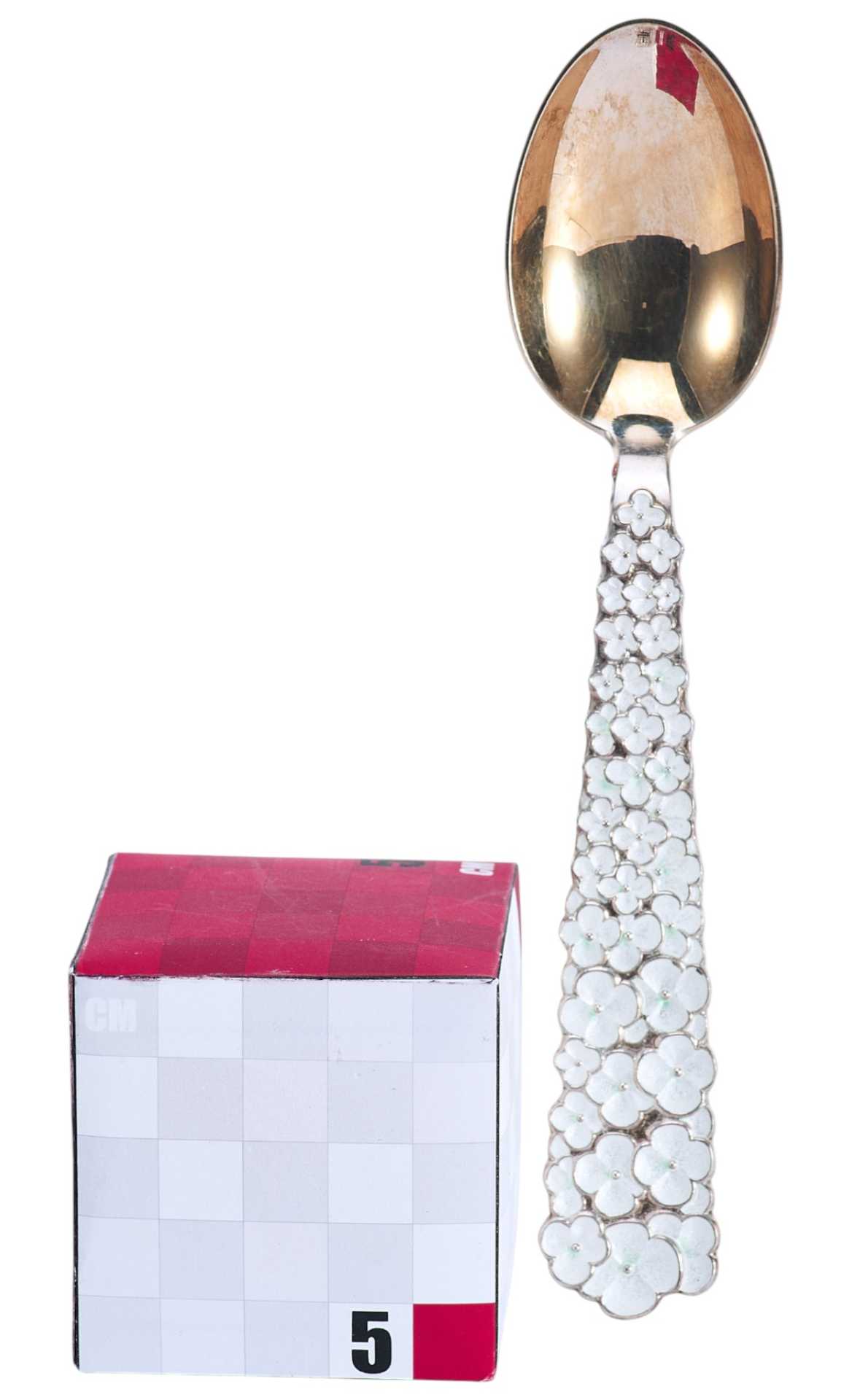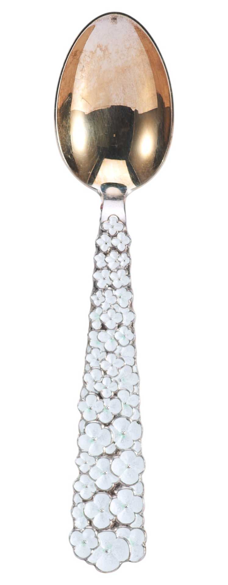 Представлена чайная ложка, держало которой декорировано изображением ковра из мелких белых цветов, напоминающих цветы сирени. Декор выполнен в технике горячей эмали. С 1910 года именитый датский производитель столового серебра