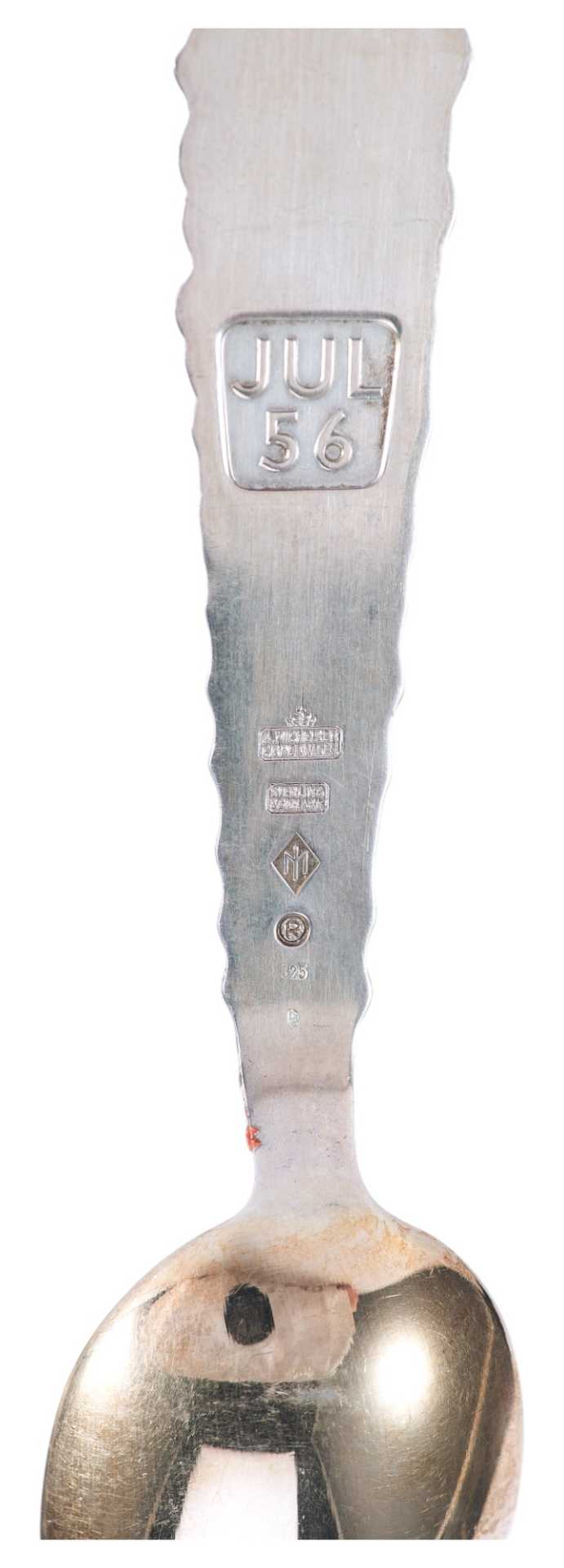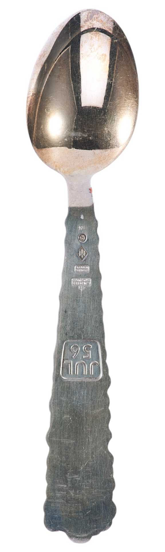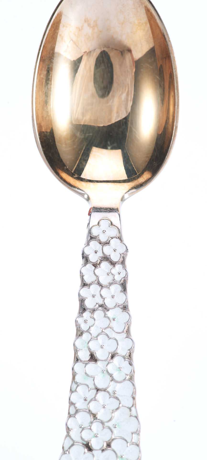 Представлена чайная ложка, держало которой декорировано изображением ковра из мелких белых цветов, напоминающих цветы сирени. Декор выполнен в технике горячей эмали. С 1910 года именитый датский производитель столового серебра