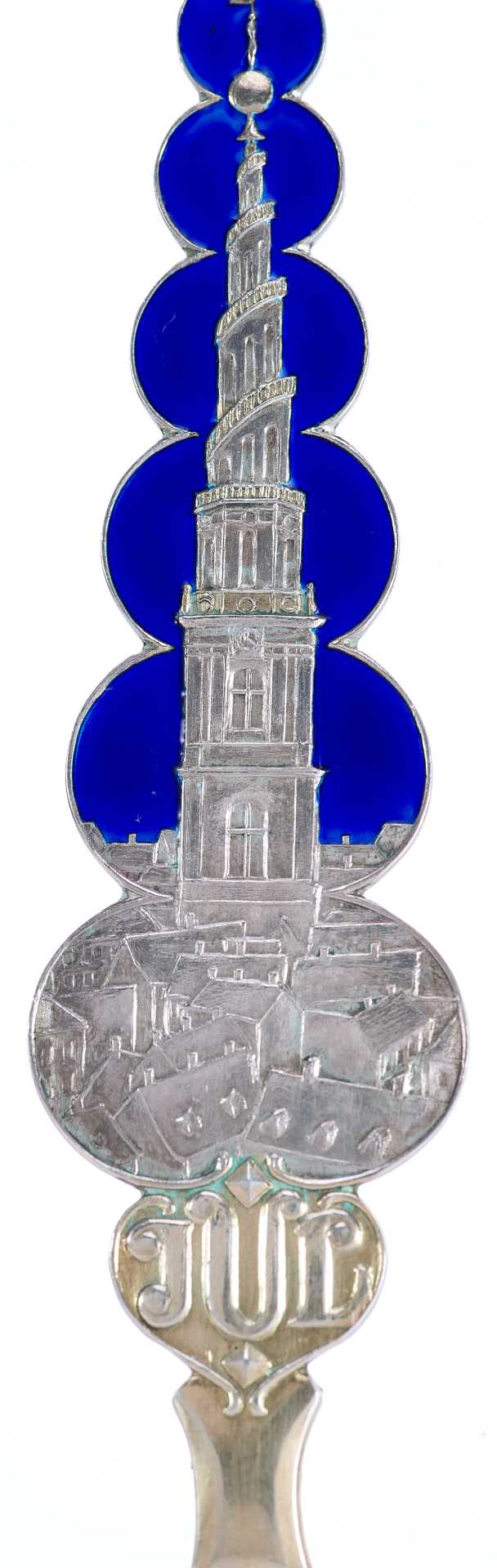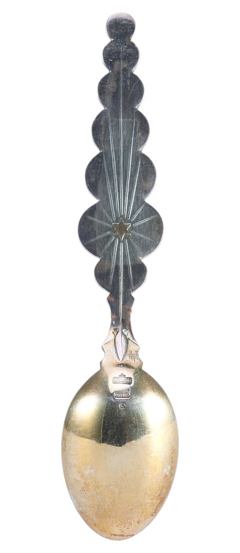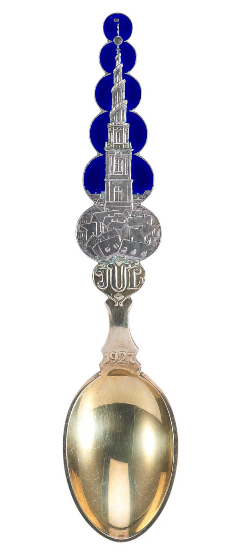 Представлена чайная ложка, держало которой декорировано навершием в с изображением собора Христа Спасителя в Копенгагене. Декор выполнен в технике горячей эмали. Под изображением церкви подпись: «ПJL» (дат.) «Рождество» .