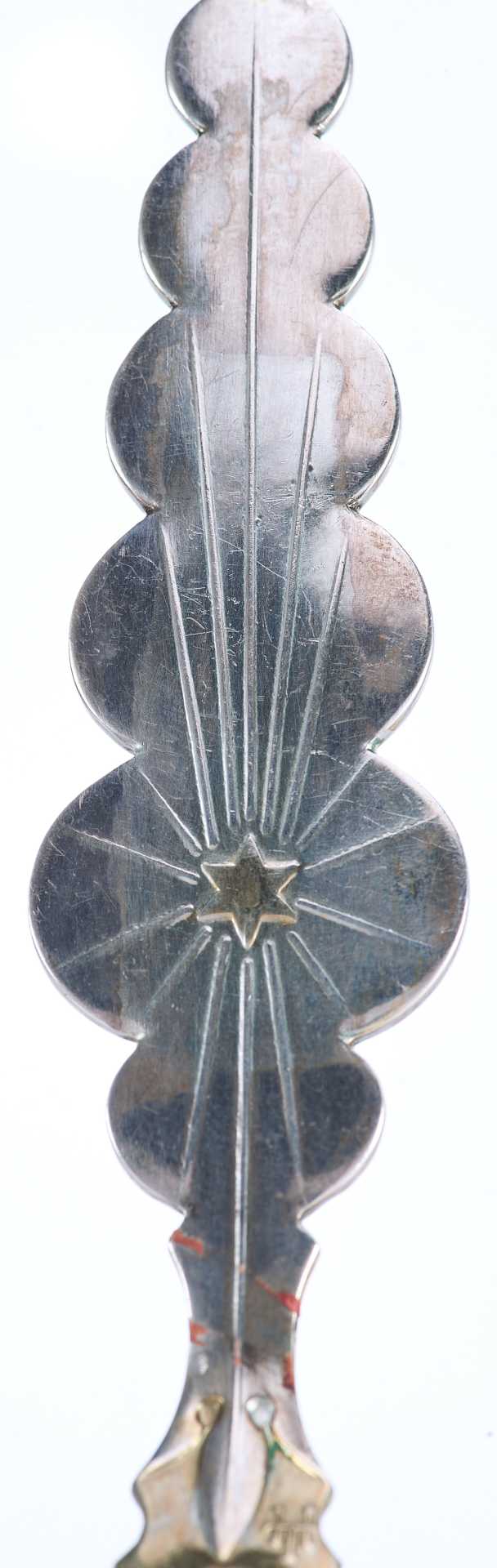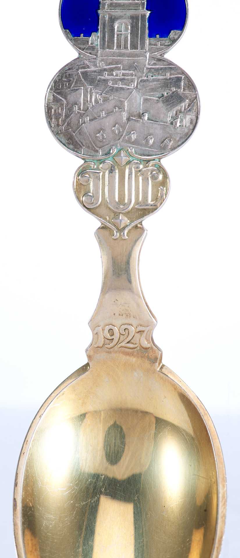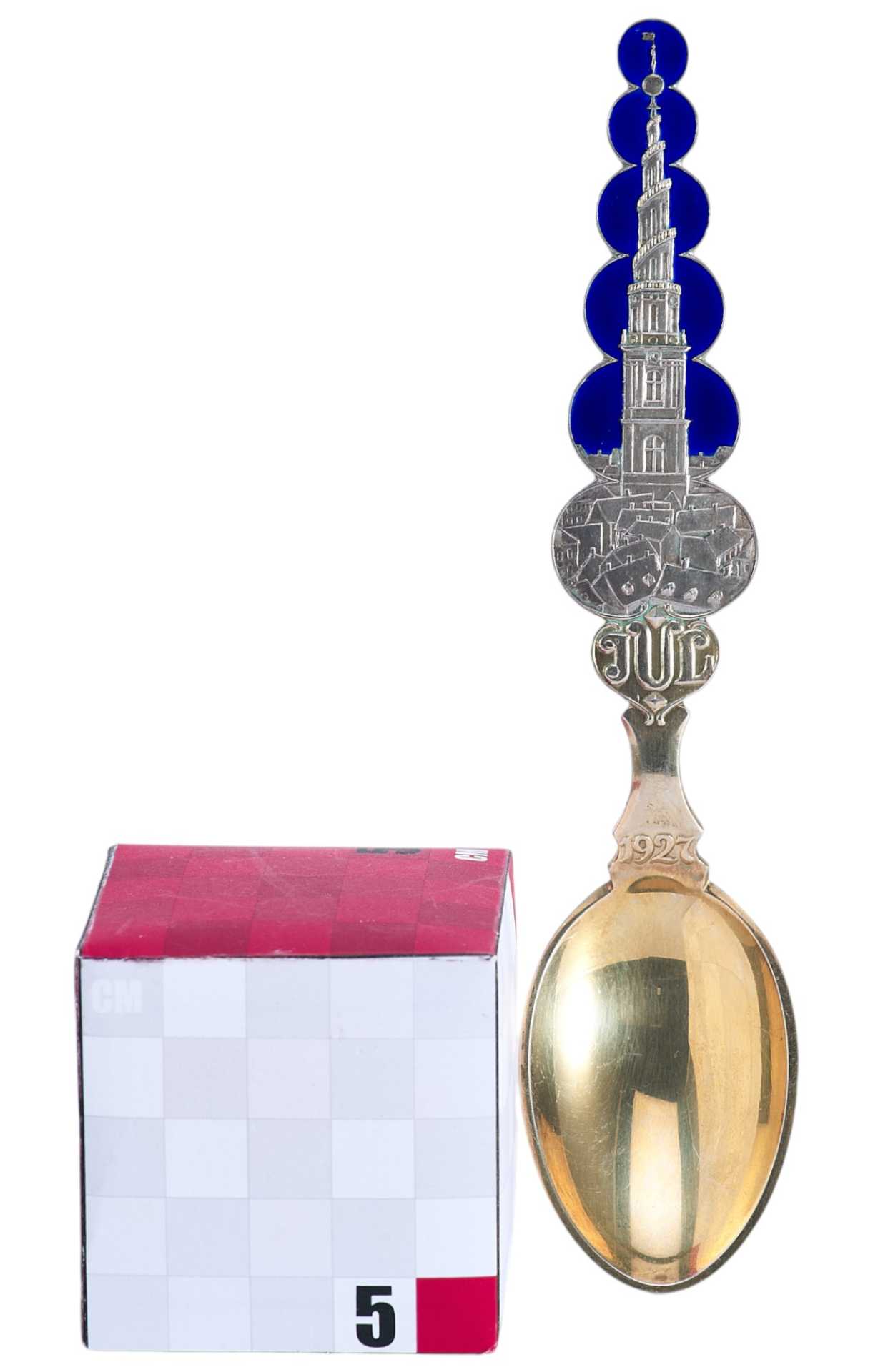 Представлена чайная ложка, держало которой декорировано навершием в с изображением собора Христа Спасителя в Копенгагене. Декор выполнен в технике горячей эмали. Под изображением церкви подпись: «ПJL» (дат.) «Рождество» .