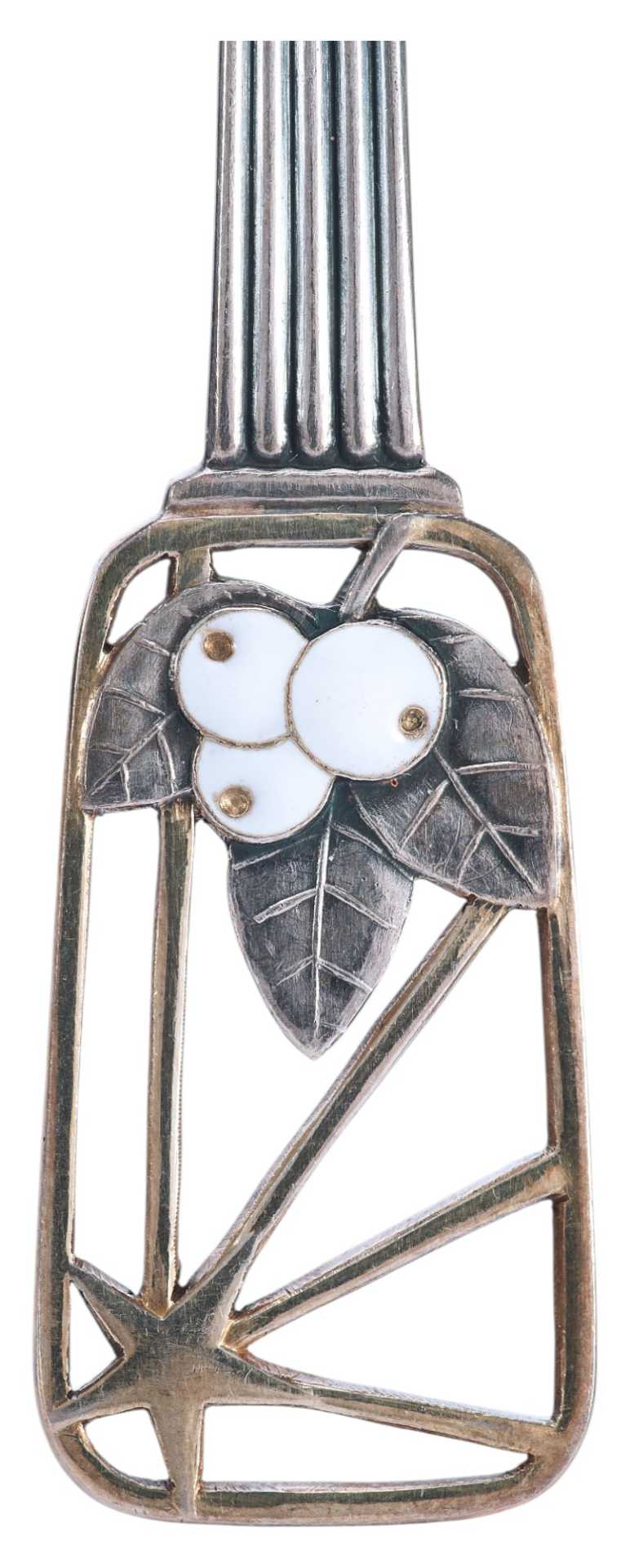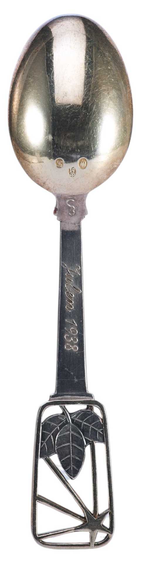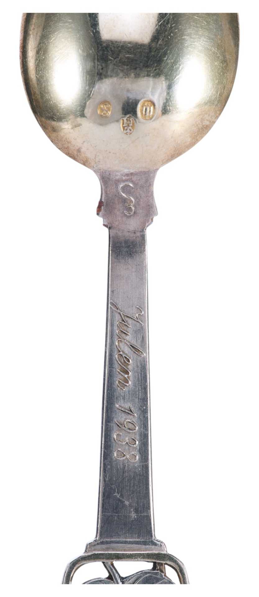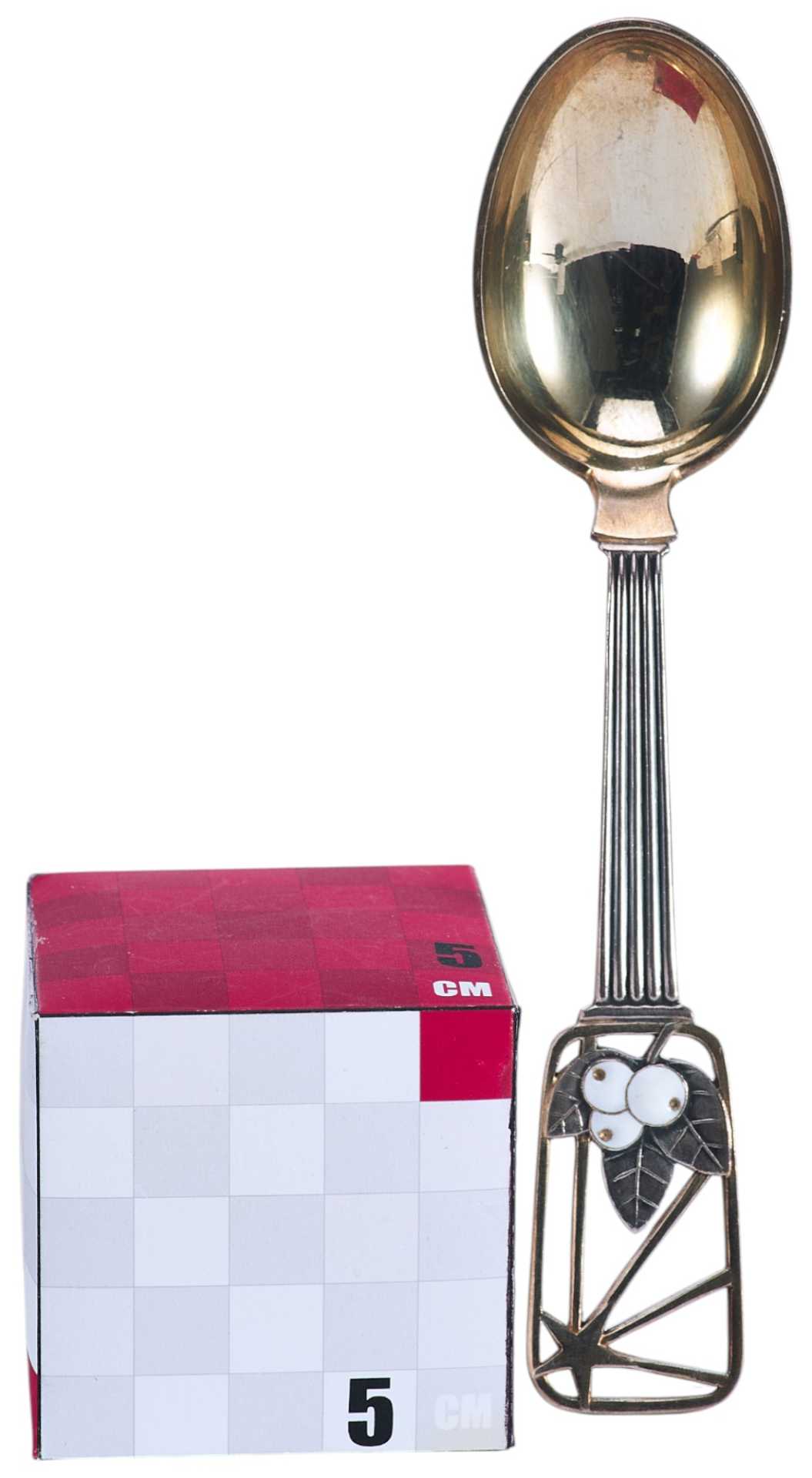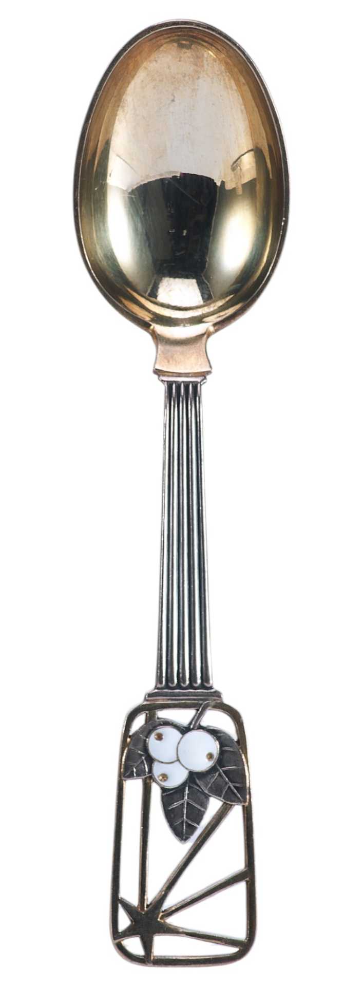 Представлена чайная ложка, держало которой декорировано навершием в виде миниатюрной стилизованной композиции с изображением ягод и восходящей звезды. Декор выполнен в технике горячей эмали. На обратной На обратной стороне держала присутствует надпись Julen 1938»