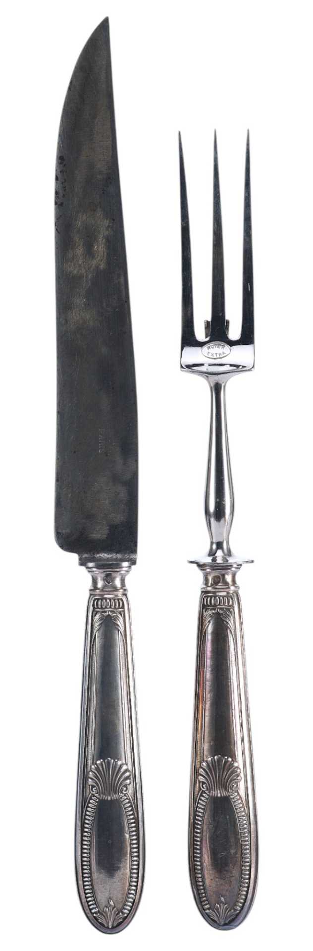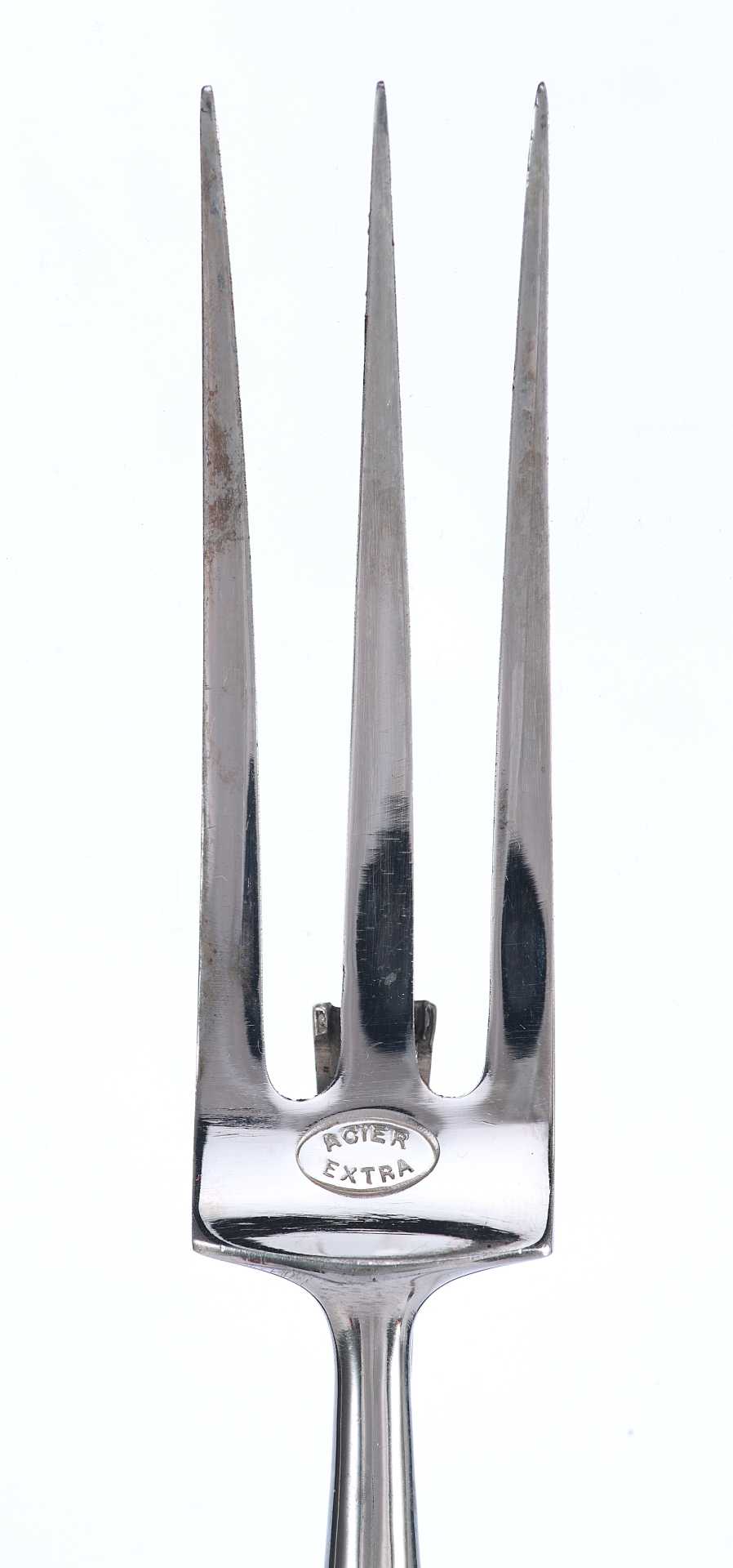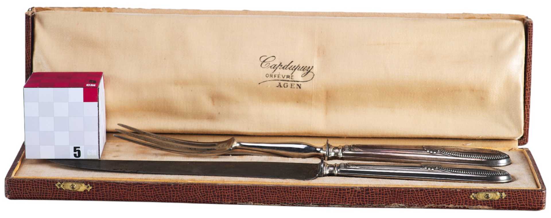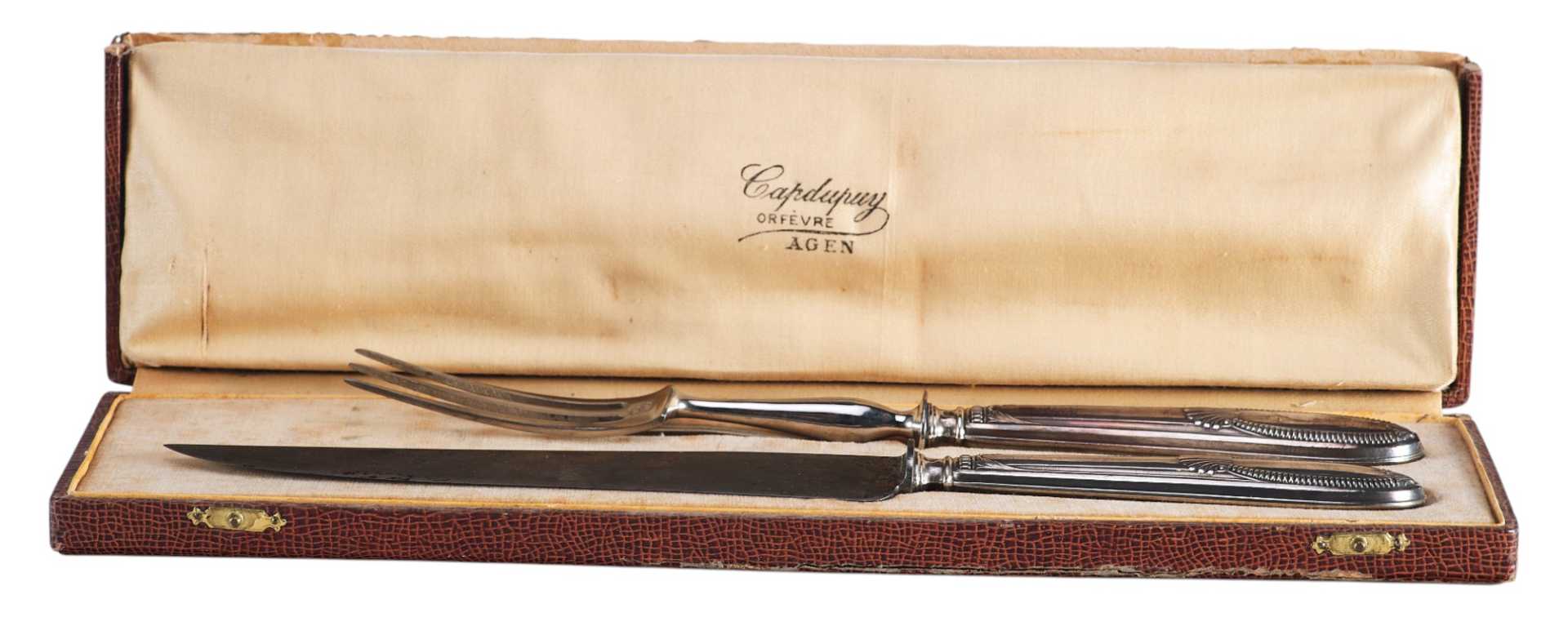 Представлен столовый набор для разделки мяса, состоящий из: вилки с фиксатором и ножа. На лезвии ножа надпись: «PARIS». На вилке овальное клеймо с надписью: «ACIER EXTRA» (Экстра сталь). Наборы столового серебра в подобных футлярах активно производились во Франции, Бельгии, Германии, Италии с конца XIX в. по первую половину ХХ в.
